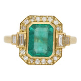 This striking ring features a centrally set emerald cut emerald in a bold rub-over setting. The vibrant green gemstone is framed by an octagonal halo of brilliant round cut diamonds, creating a strong geometric silhouette. On each shoulder, a vertically set baguette cut diamond adds balance and structure, enhancing the Art Deco-inspired design. The warm 18K yellow gold setting beautifully complements the rich tone of the emerald while highlighting the crisp sparkle of the diamonds.