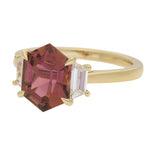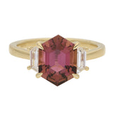 This ring is crafted in 18ct yellow gold and it centres on a lovely pink tourmaline, prized for its pink colour. The pink tourmaline is framed by a simple geometric arrangement of diamonds, including two GIA certified trapezoid step cut diamonds on each side of the central stone, creating a distinctive Art Deco silhouette.