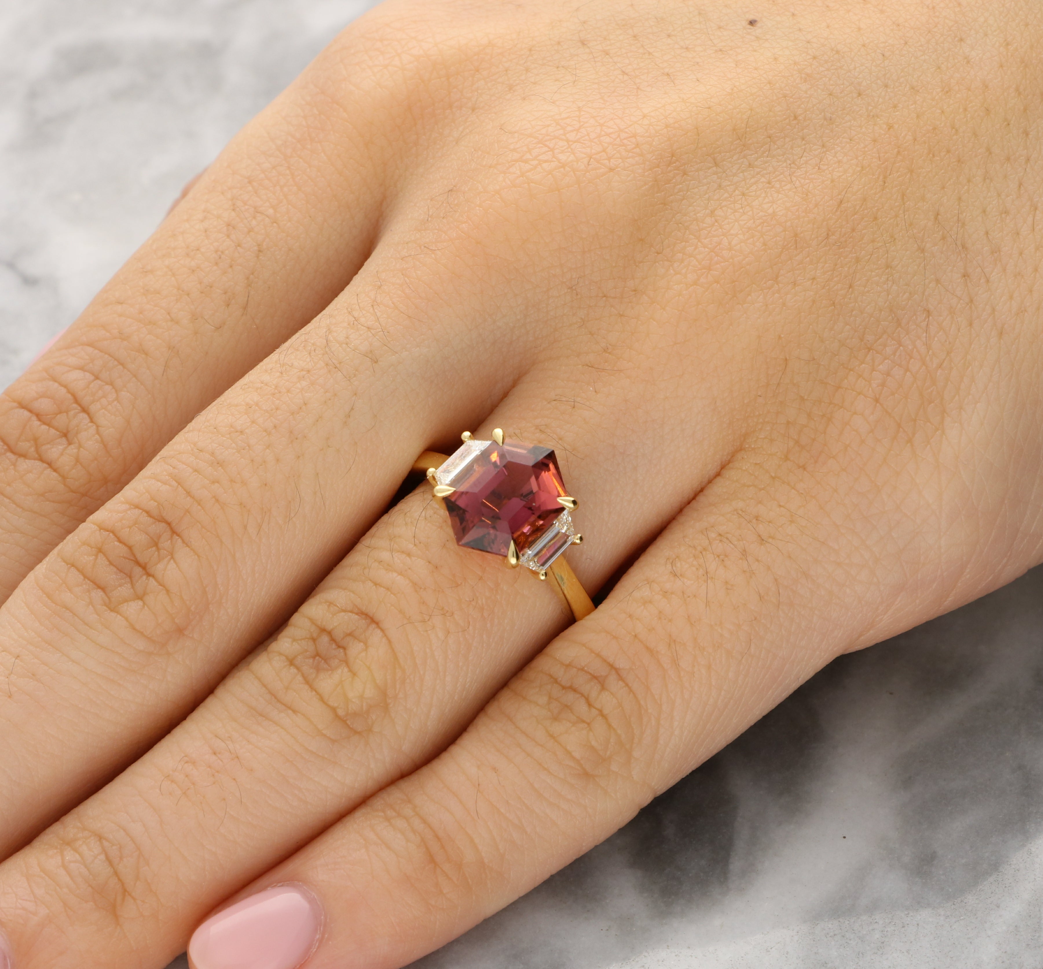 This pink tourmaline and diamond ring is a timeless statement piece, perfect for collectors of fine jewellery or as a unique alternative engagement ring.
