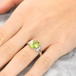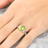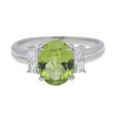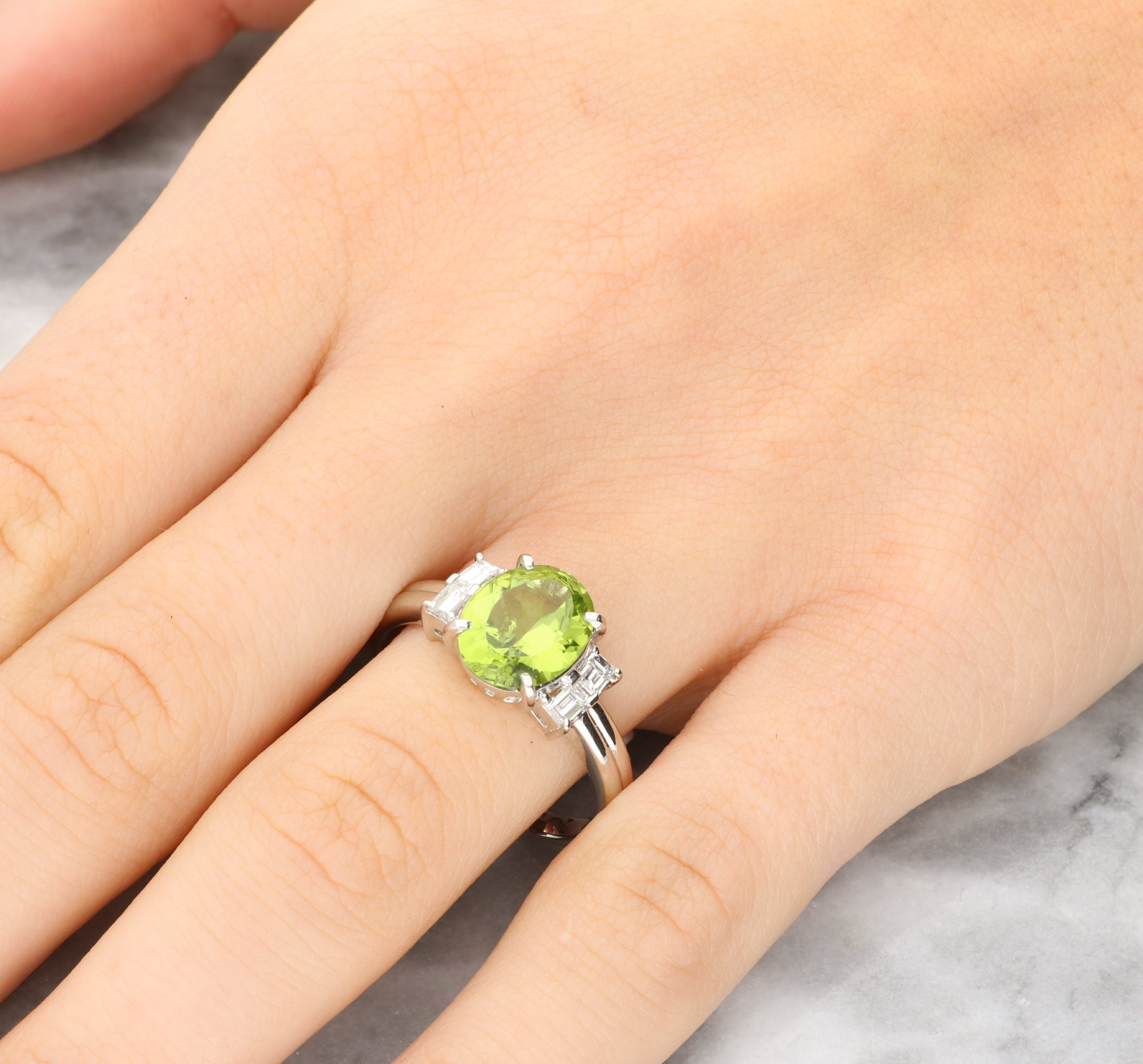 The ring centrally features a beautiful oval cut peridot, securely four claw set in platinum. The peridot is sided by two baguette cut diamonds on either side. The head of the ring leads to a solid platinum band.