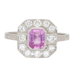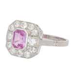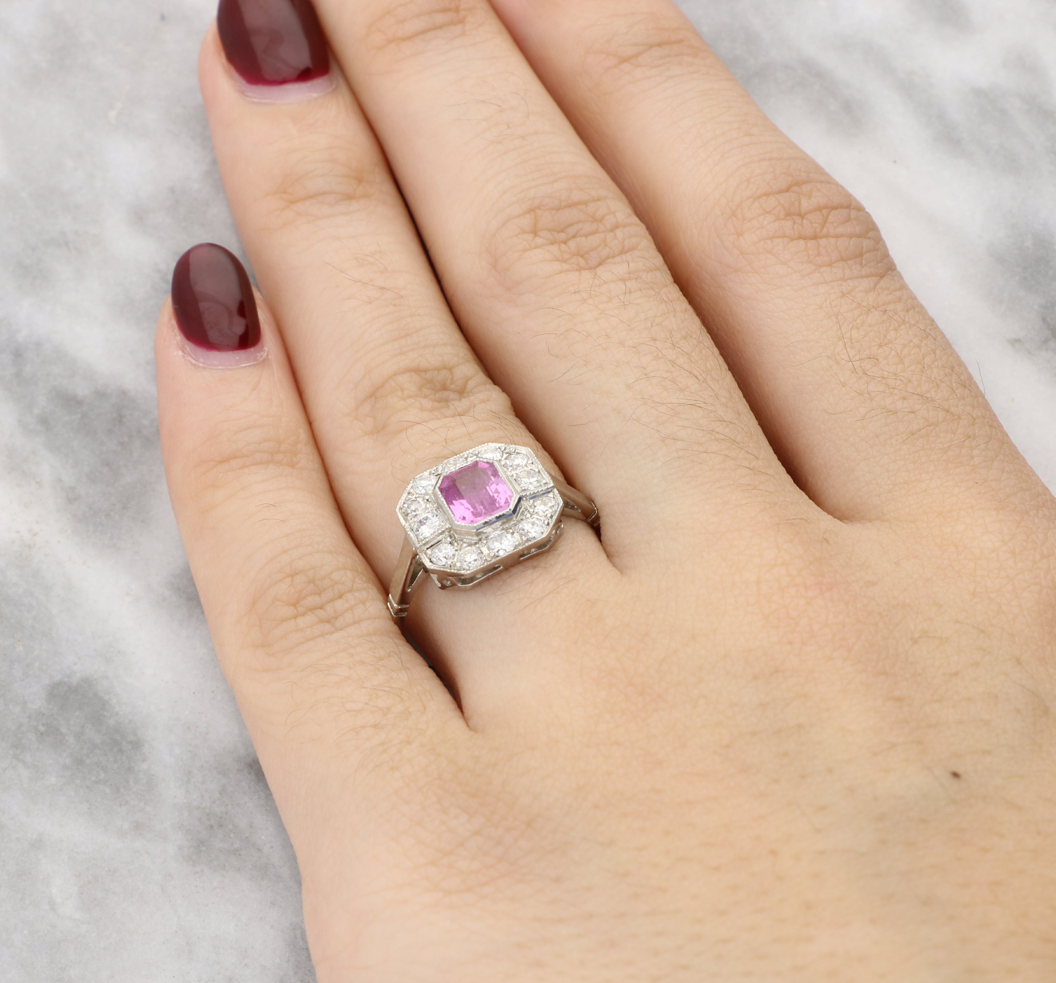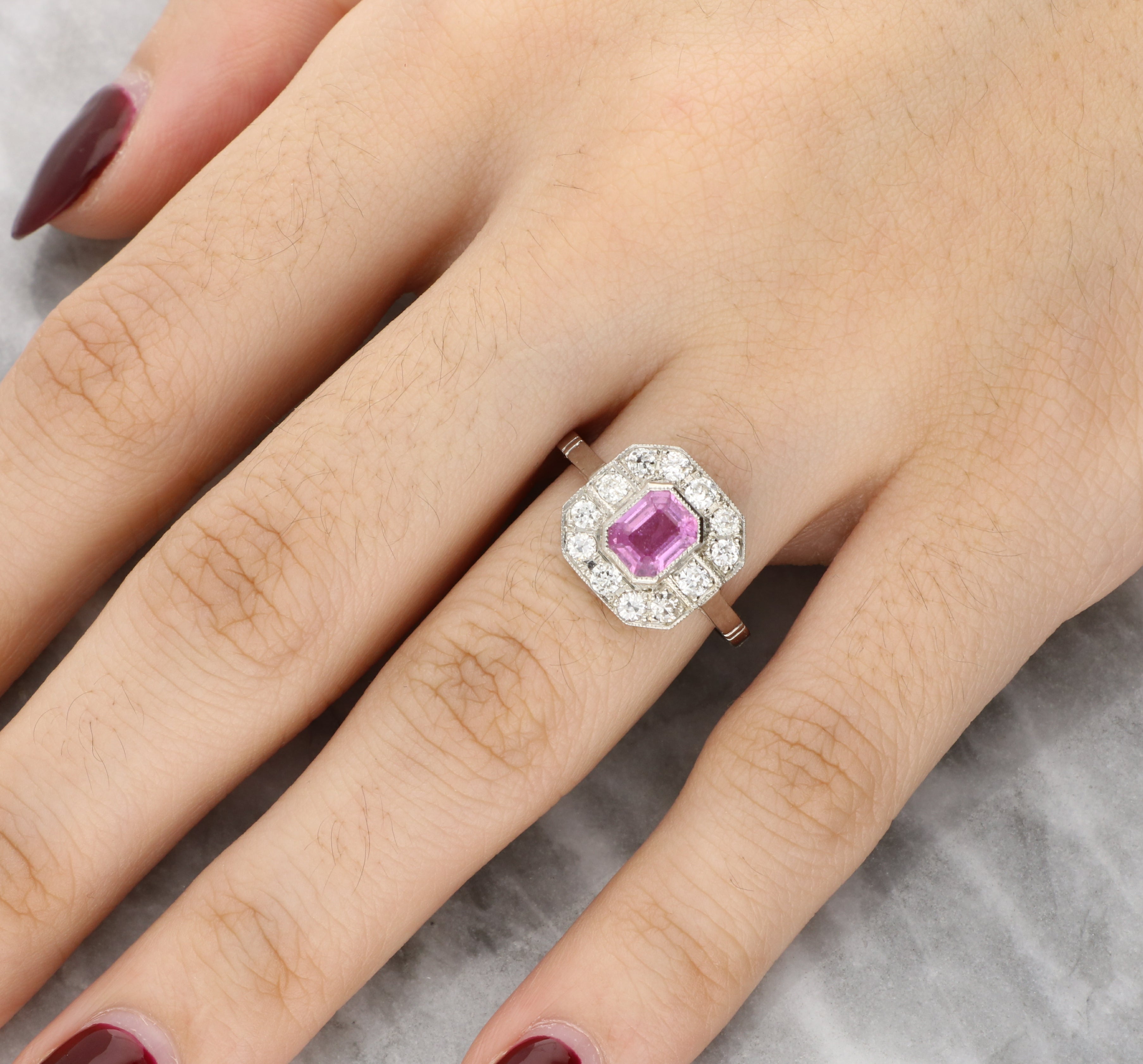 A beautiful Art Deco ring, centred with a beautifully vibrant emerald cut pink sapphire. The crisp step-cut facets and geometric outline reflect the bold symmetry characteristic of the period. Surrounding the centre stone is a structured octagonal cluster of old cut diamonds, set within finely detailed milgrain edging.