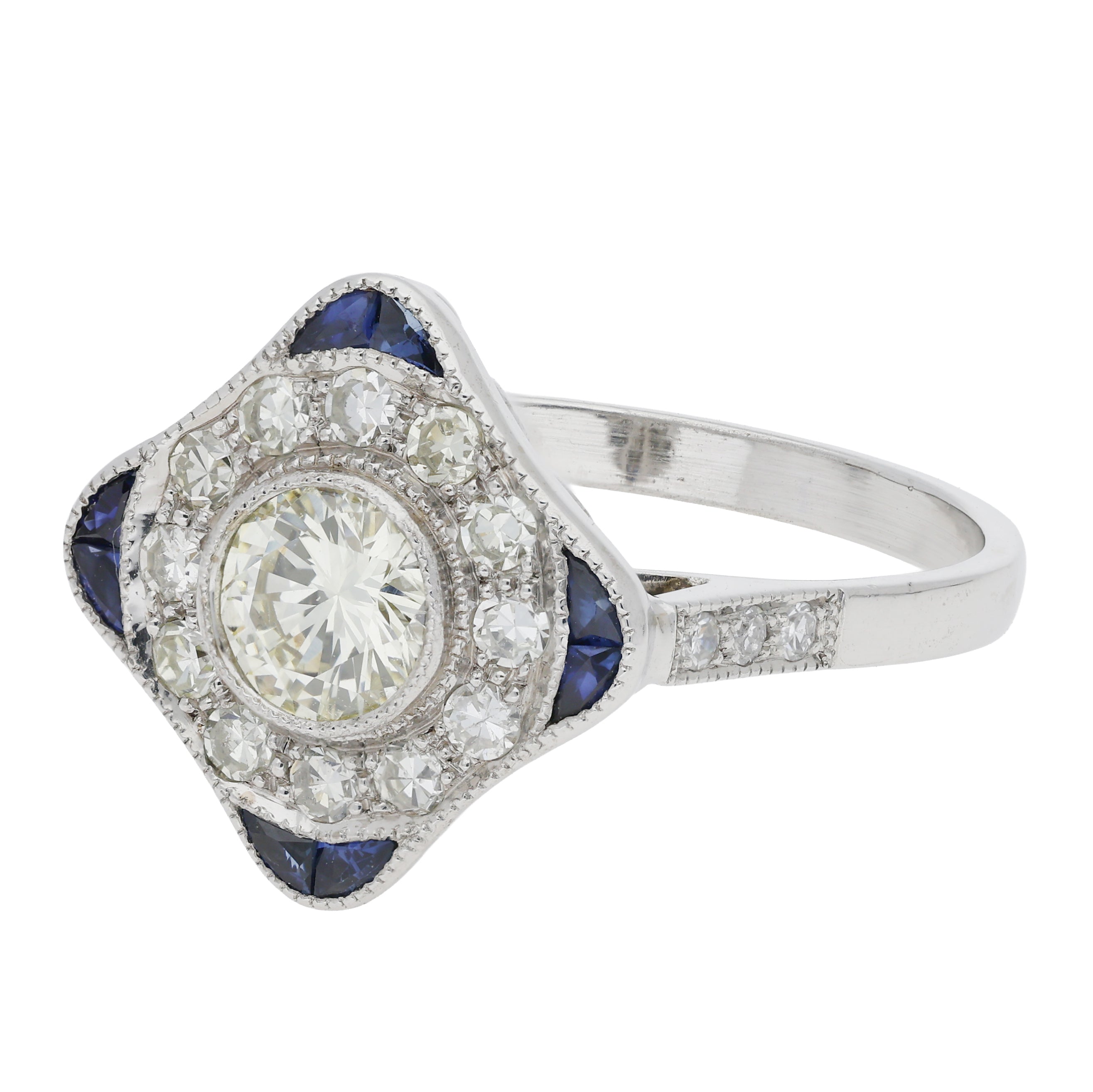 The ring centrally features a beautiful round cut diamond, securely milgrain bezel set in white gold. Surrounding the centre stone is a cluster of twelve round brilliant cut diamonds. Each corner of the cluster is accented by two French cut sapphires, creating a striking geometric pattern that captures the spirit of the Art Deco era. The head of the ring flows into diamond set shoulders, leading to a solid 18ct white gold band.