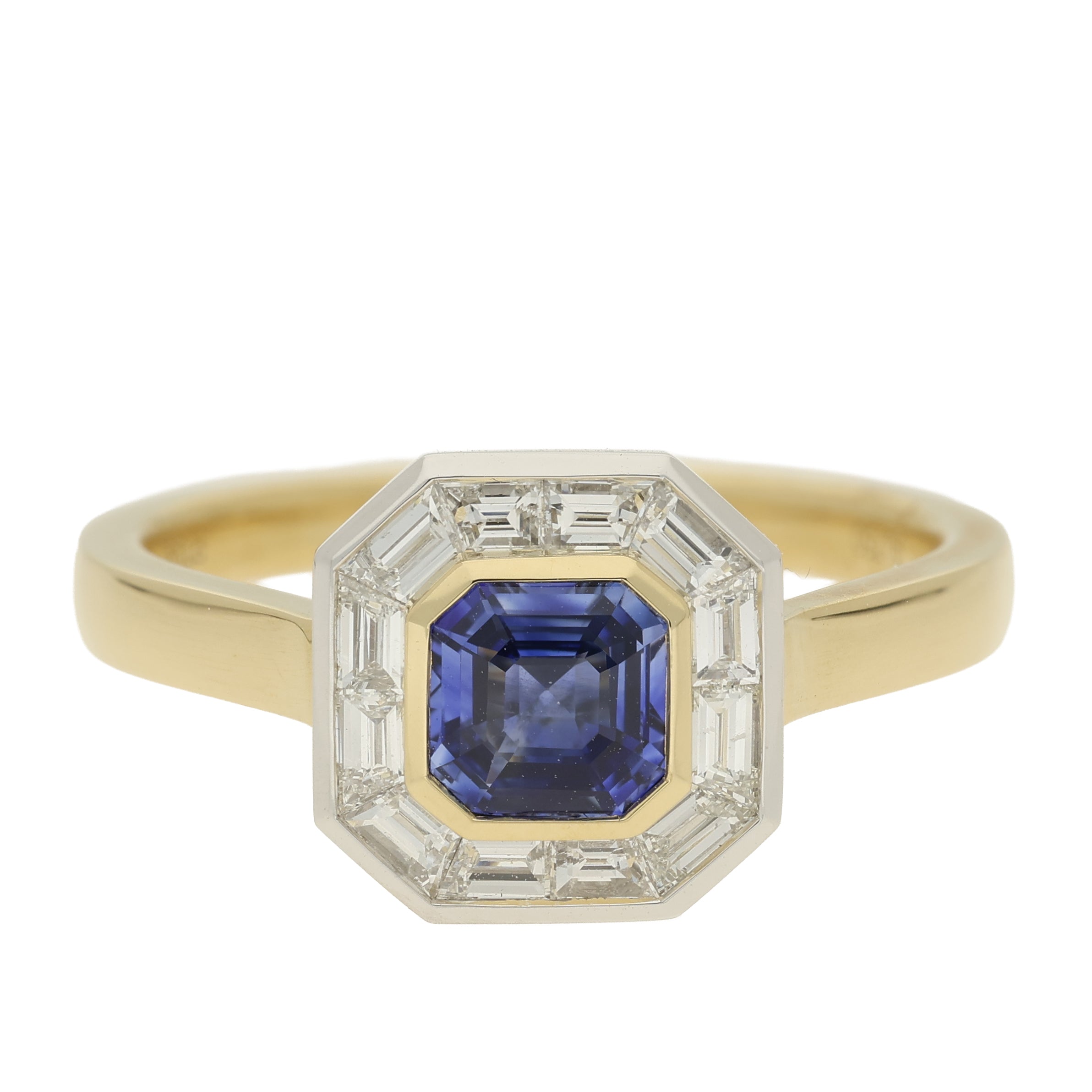 This striking ring is crafted in 18ct yellow gold and platinum. It centres on a vivid sapphire, prized for its rich blue colour. The sapphire is framed by a bold geometric arrangement of diamonds, including step-cut stones, creating a distinctive Art Deco silhouette.