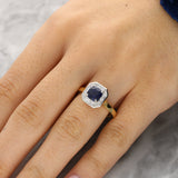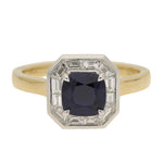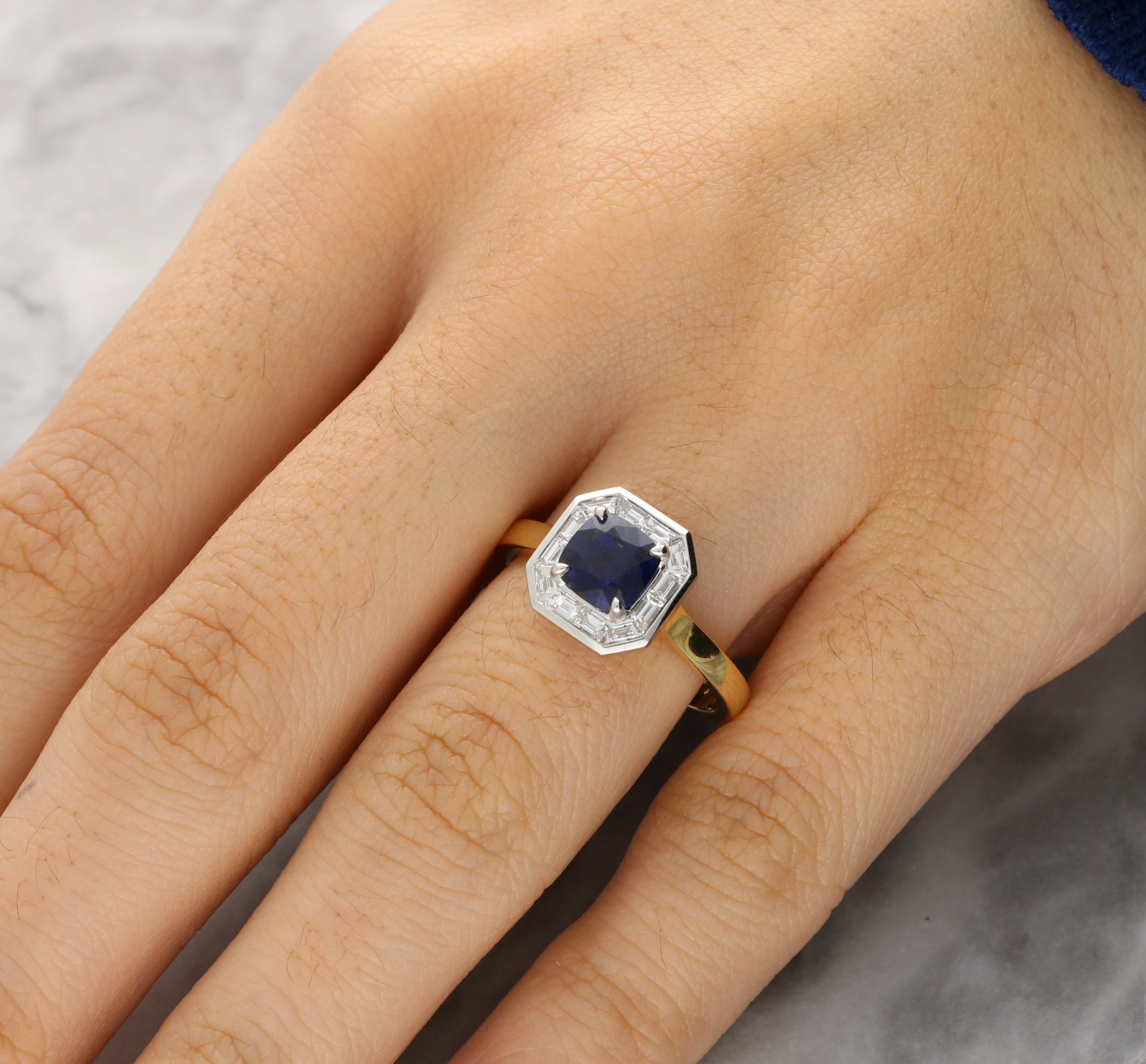 This striking ring is crafted in 18ct yellow gold and platinum. It centres on a vivid cushion cut sapphire, prized for its rich blue colour. The sapphire is framed by a bold geometric arrangement of diamonds, including baguette-cut stones, creating a distinctive Art Deco silhouette.