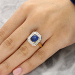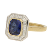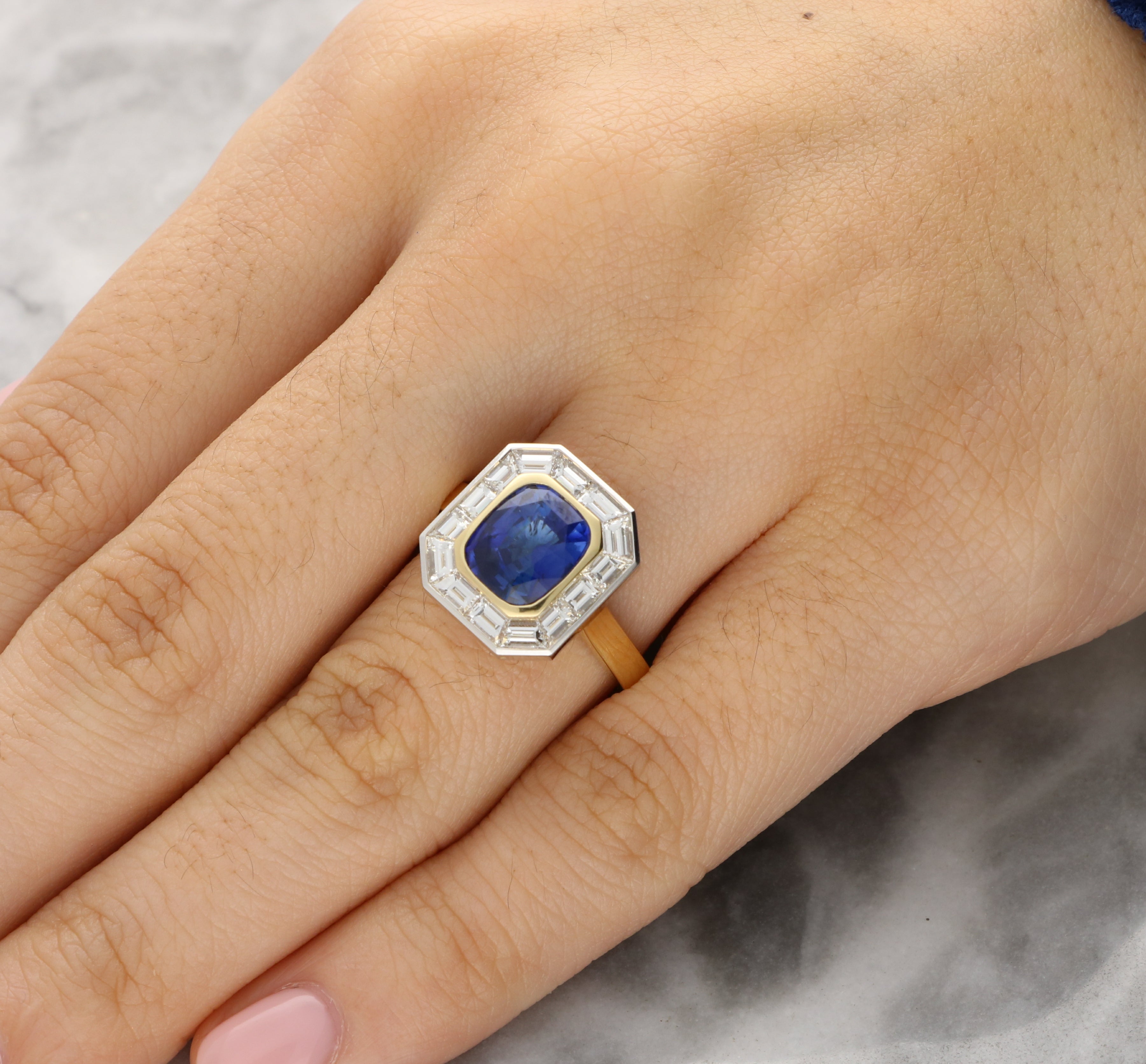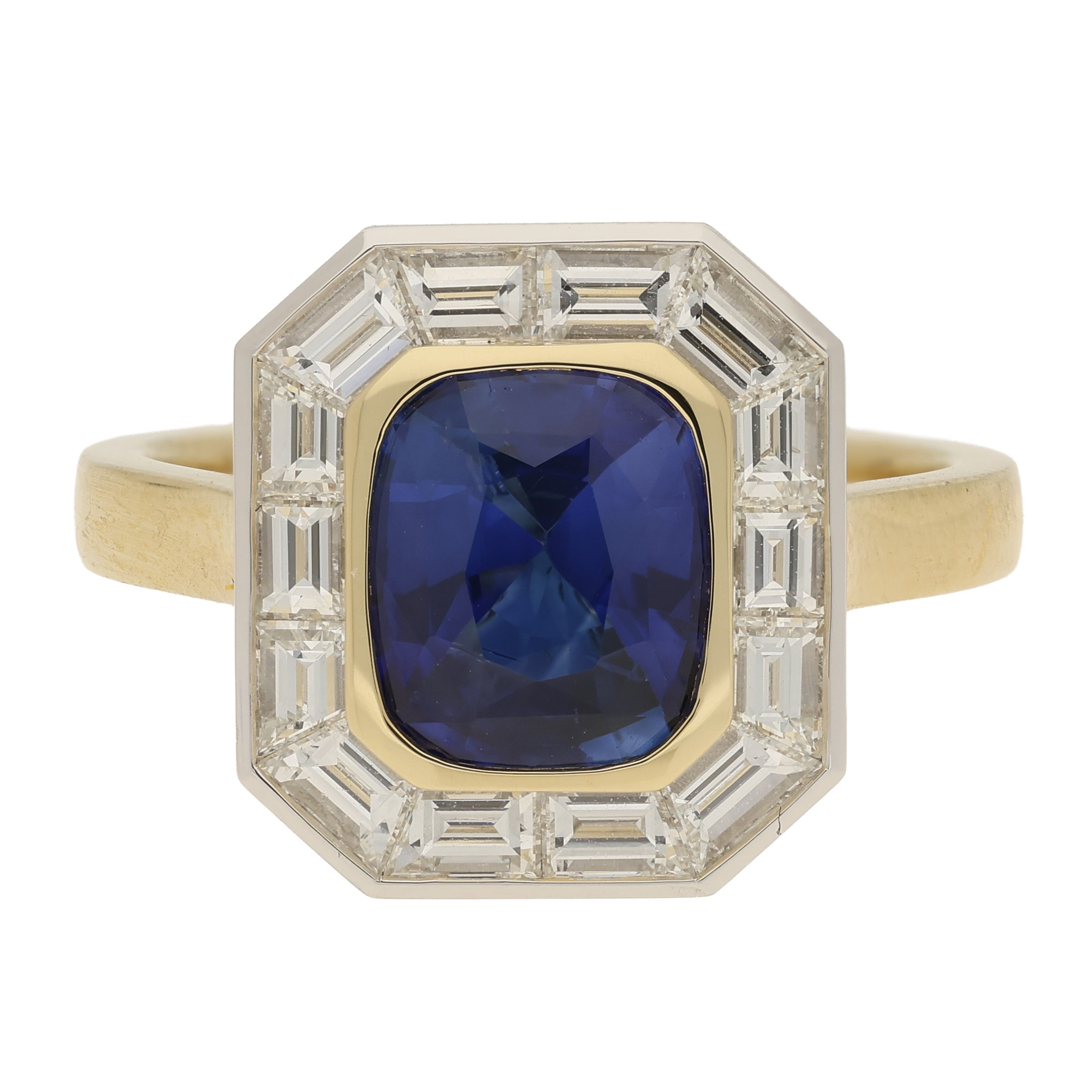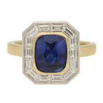 This elegant ring is crafted in 18ct yellow gold with a platinum setting and features a richly coloured blue sapphire at its centre. The sapphire is framed by a striking octagonal halo of baguette-cut diamonds, creating a bold yet refined geometric silhouette that draws the eye to the depth of the central stone.
