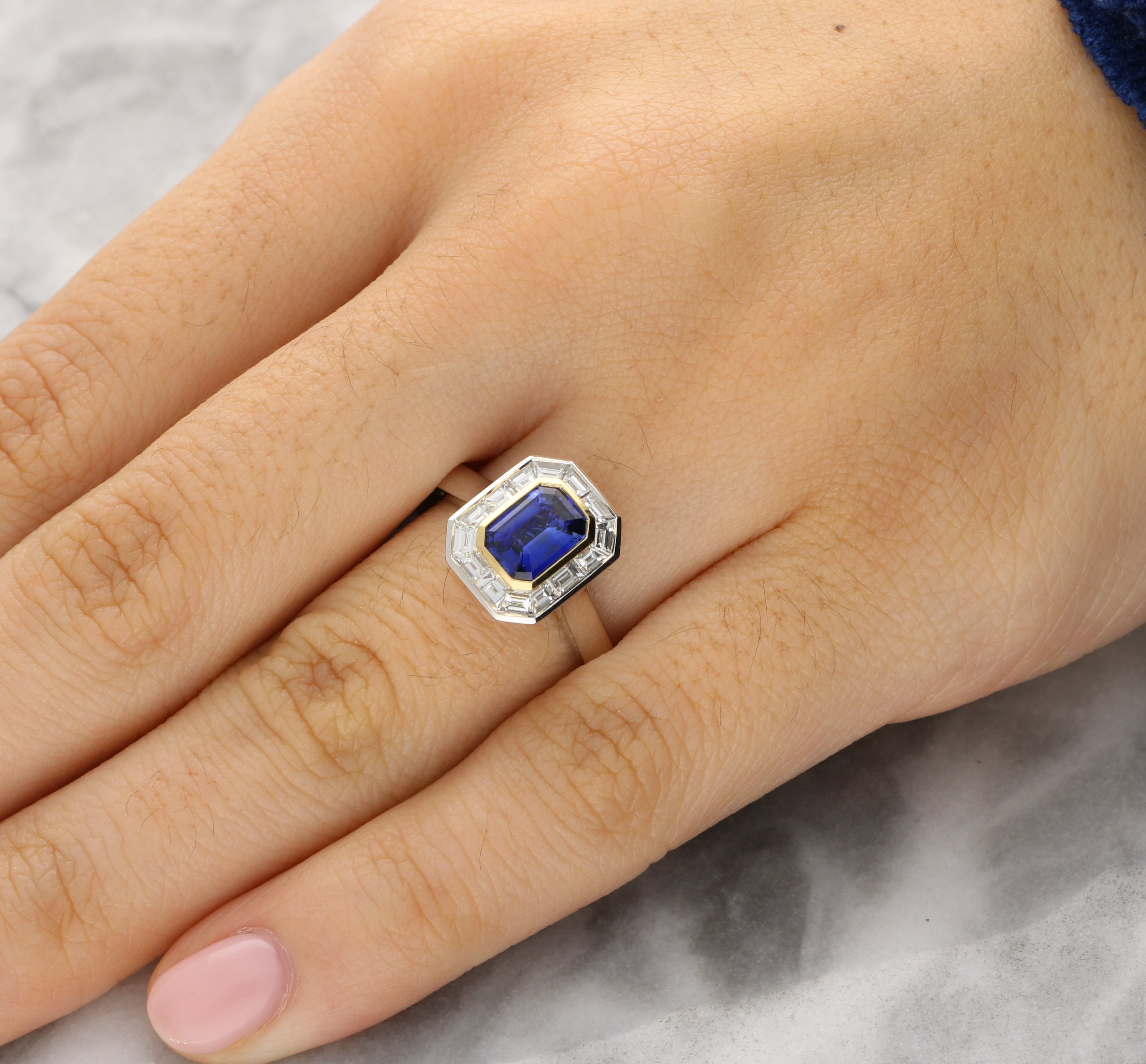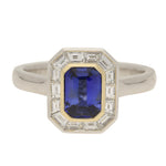 This striking ring is crafted in platinum and 18ct yellow gold. It centres on a vivid emerald cut sapphire, prized for its rich blue colour. The sapphire is framed by a bold geometric arrangement of diamonds, including baguette-cut stones, creating a distinctive Art Deco silhouette.