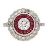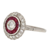 The bold concentric pattern and the combination of bright diamonds and rich red rubies give the ring a classic early 20th-century appearance typical of Art Deco target cluster designs.