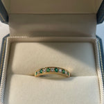 This elegant half eternity ring features six vibrant emeralds and five round-cut diamonds, all securely channel-set in a solid 18ct yellow gold band. The stones have an estimated total weight of 0.21 carats of emeralds and 0.17 carats of diamonds.