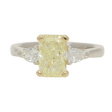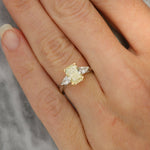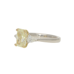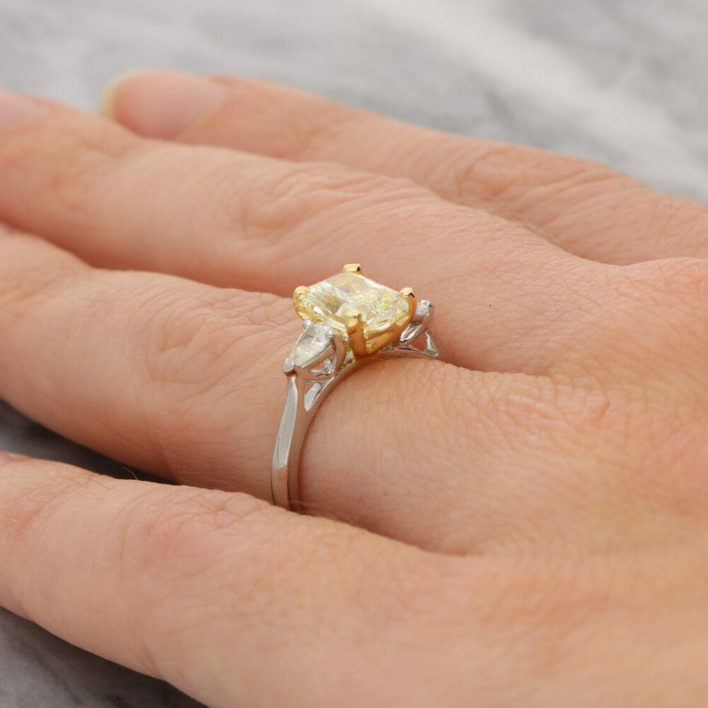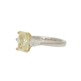 - Stone Weight: The central cushion cut diamond is GIA certified as 1.62 carats, W-X in colour (shows significant yellow colouring) with VS1 clarity. There is a combined side diamond weight of 0.30 carats, ranging I-J in colour with VS-SI clarity.