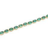 This bracelet is composed of a continuous line of oval-cut emeralds, each set in smooth 18K yellow gold bezels that frame the gemstones and create a fluid, repeating pattern around the wrist.