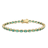 The warm tone of the 18K yellow gold settings enhances the richness of the green stones. The bracelet is finished with a secure clasp that integrates neatly with the final link, maintaining the clean, continuous look of the piece.