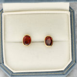 These earrings are set in yellow gold and feature a pair of oval cut garnets, each rub over set within smooth gold bezels. The gemstones display a rich deep red colour, with faceted surfaces that enhance their warmth and depth.