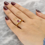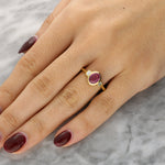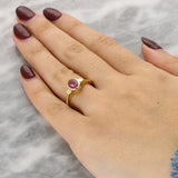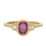 This ring features an oval-cut pink sapphire, bezel-set in 18K yellow gold to frame its rich pink tone with clean, smooth lines. Pink sapphire is associated with love, compassion and strength, and is also a traditional September birthstone.