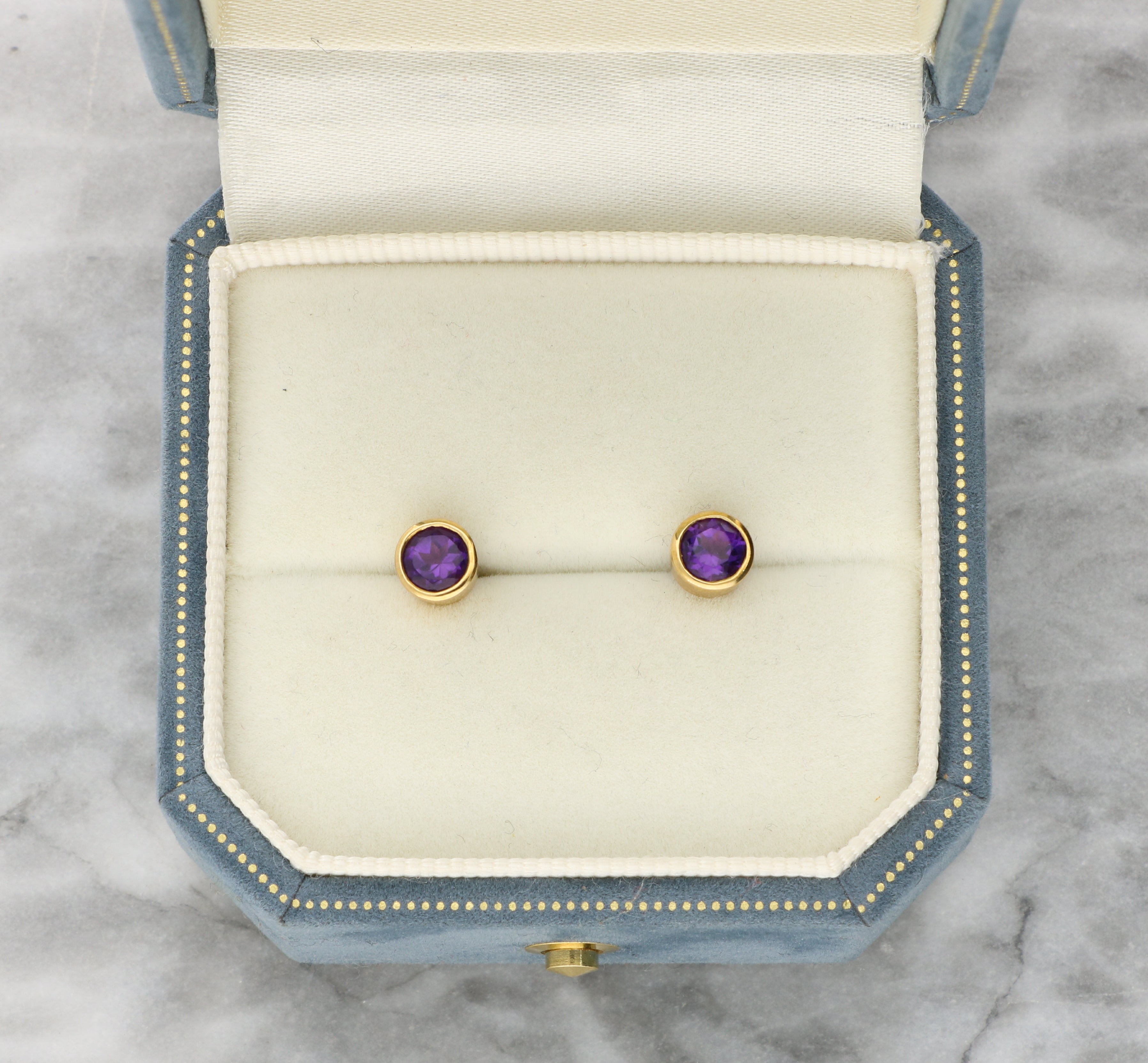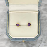 These earrings are set in yellow gold and feature a pair of round cut amethysts, each rub over set within smooth gold bezels. The gemstones display a bright purple colour, with faceted surfaces that enhance their depth and vibrancy.
