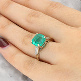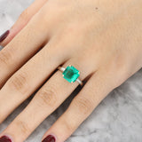 A beautiful ring featuring a striking asccher cut emerald, showcasing a vivid green hue and elegant step-cut facets. The emerald is securely held in a classic four-claw setting, allowing maximum light to enter the stone and highlight its natural character.