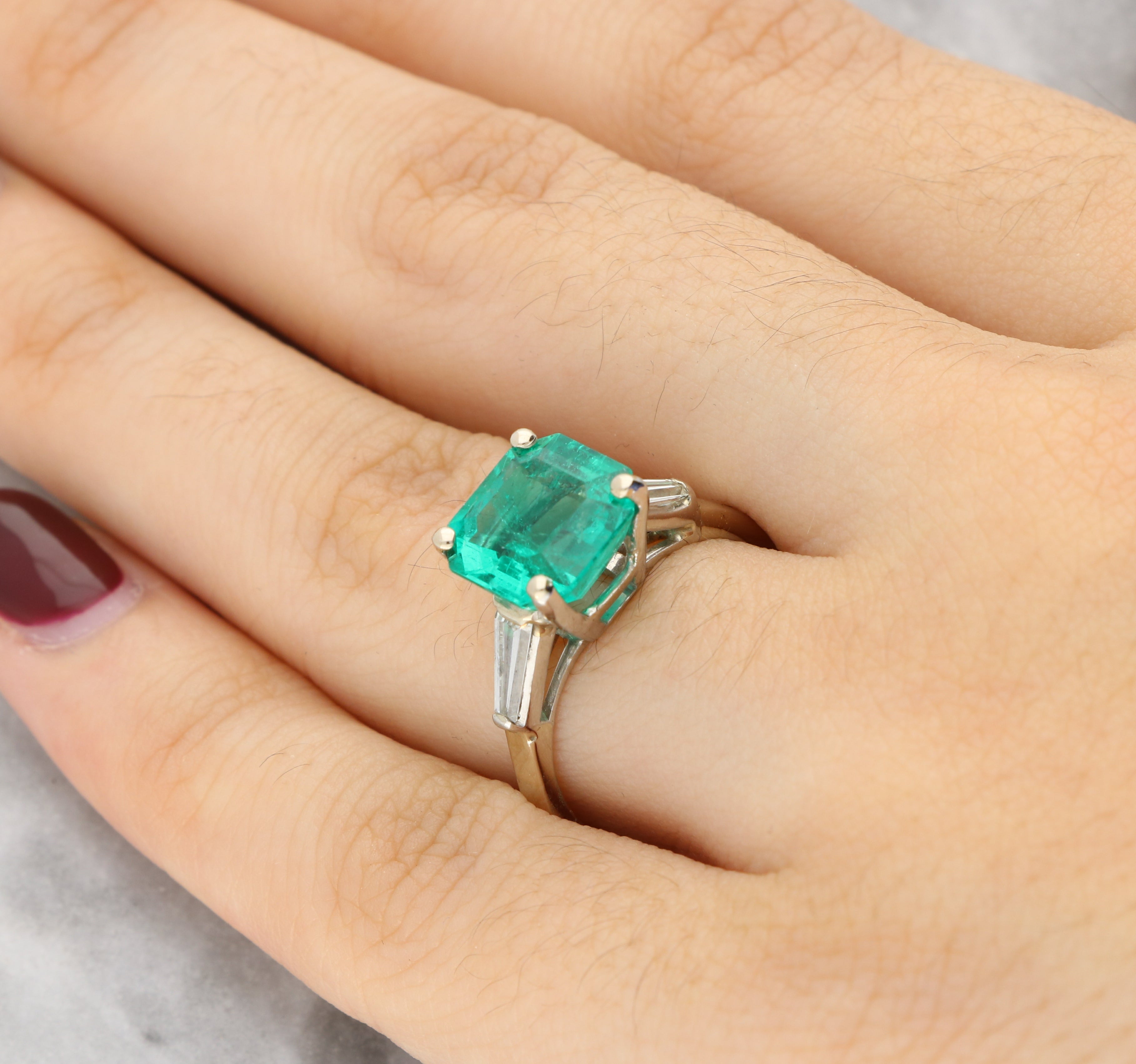 Flanking the centre stone are tapered baguette cut diamonds, set to each shoulder. Their clean, linear form perfectly complements the geometric lines of the emerald cut, creating a sleek and sophisticated silhouette.
