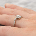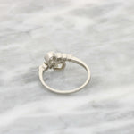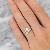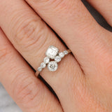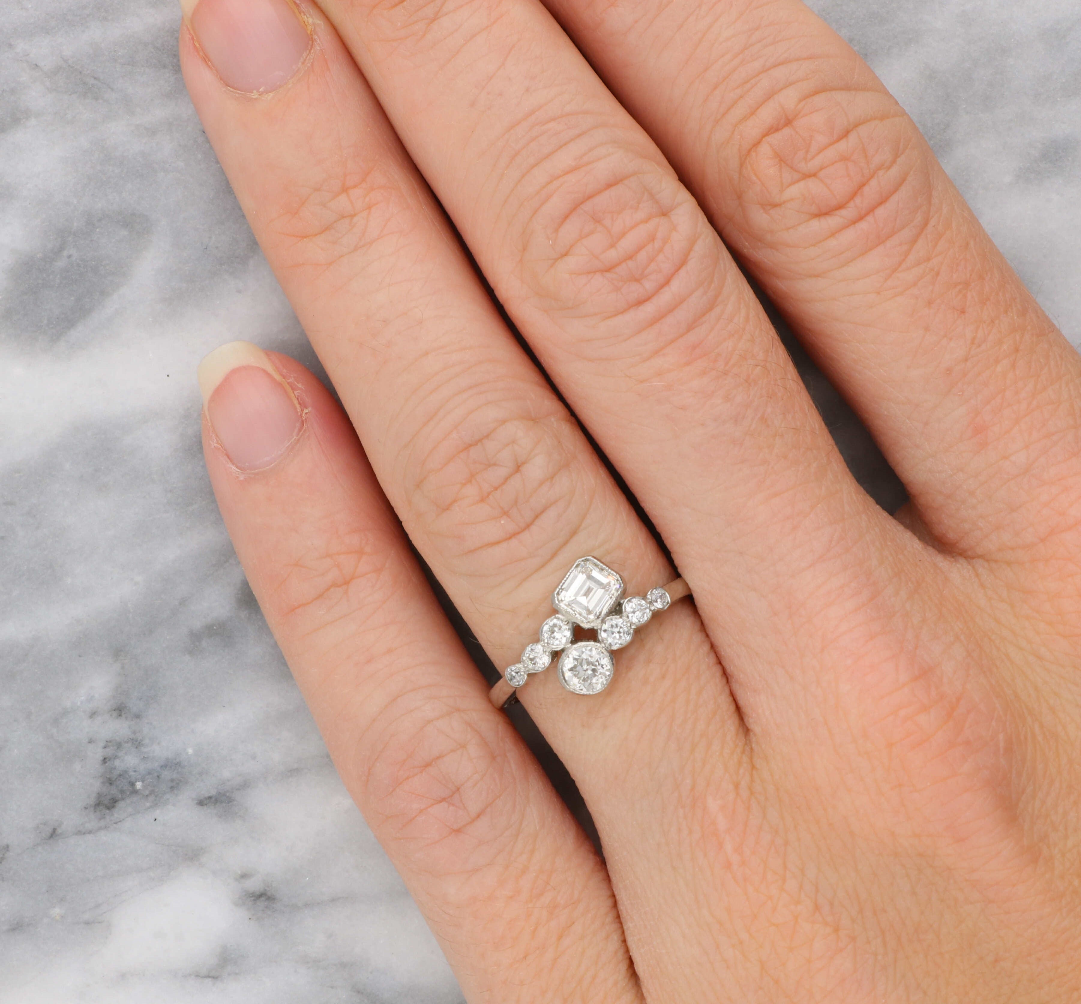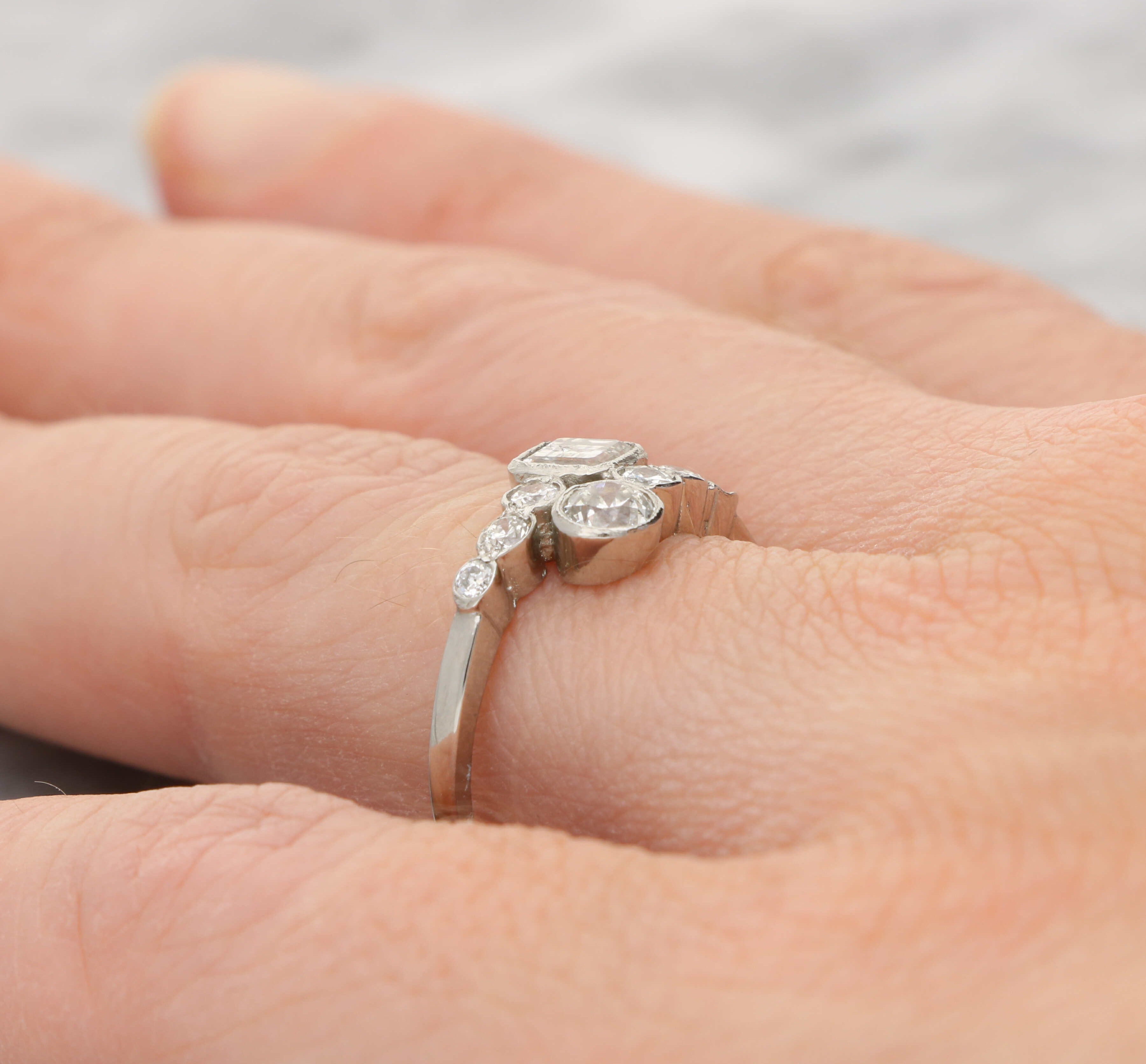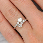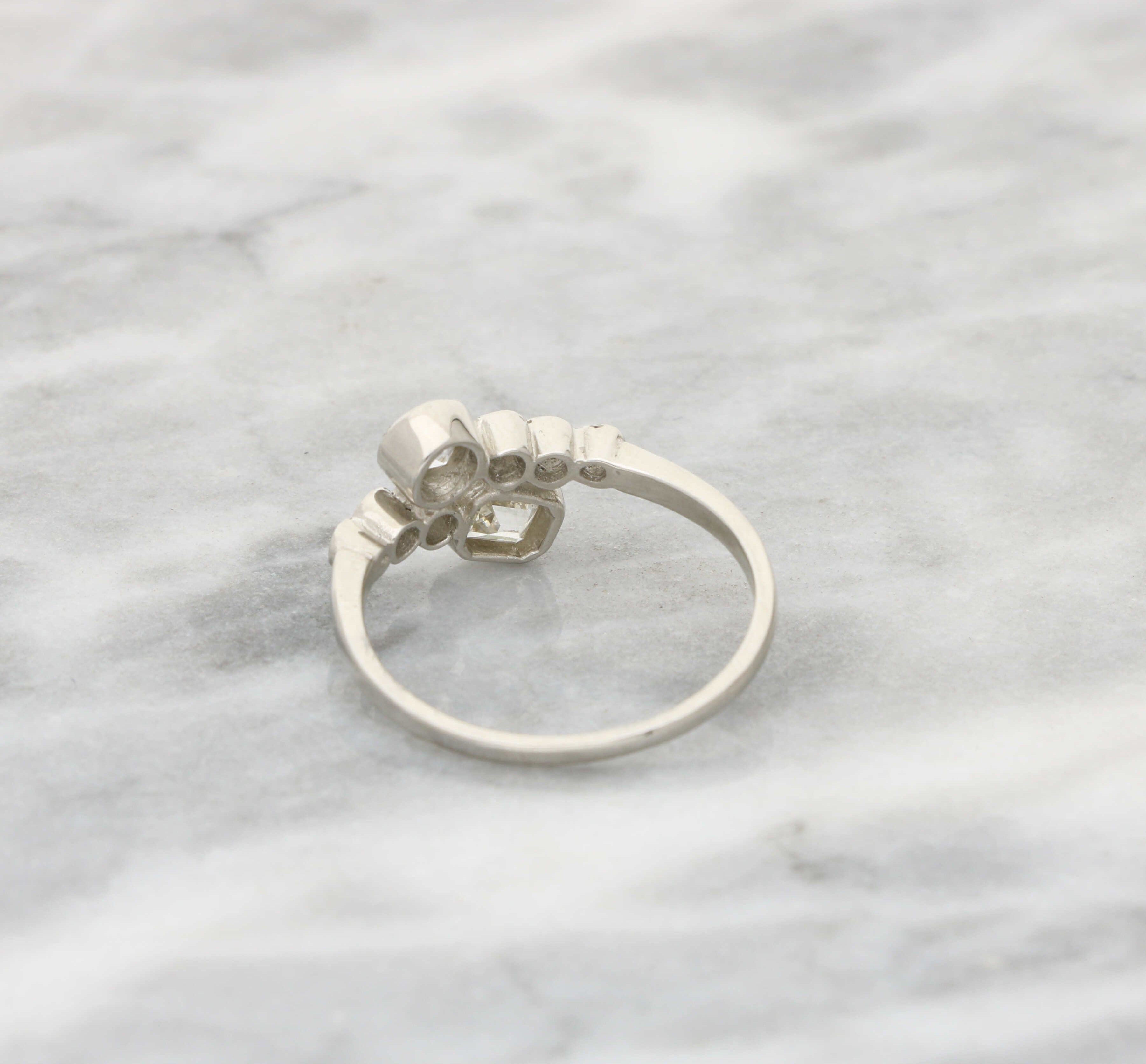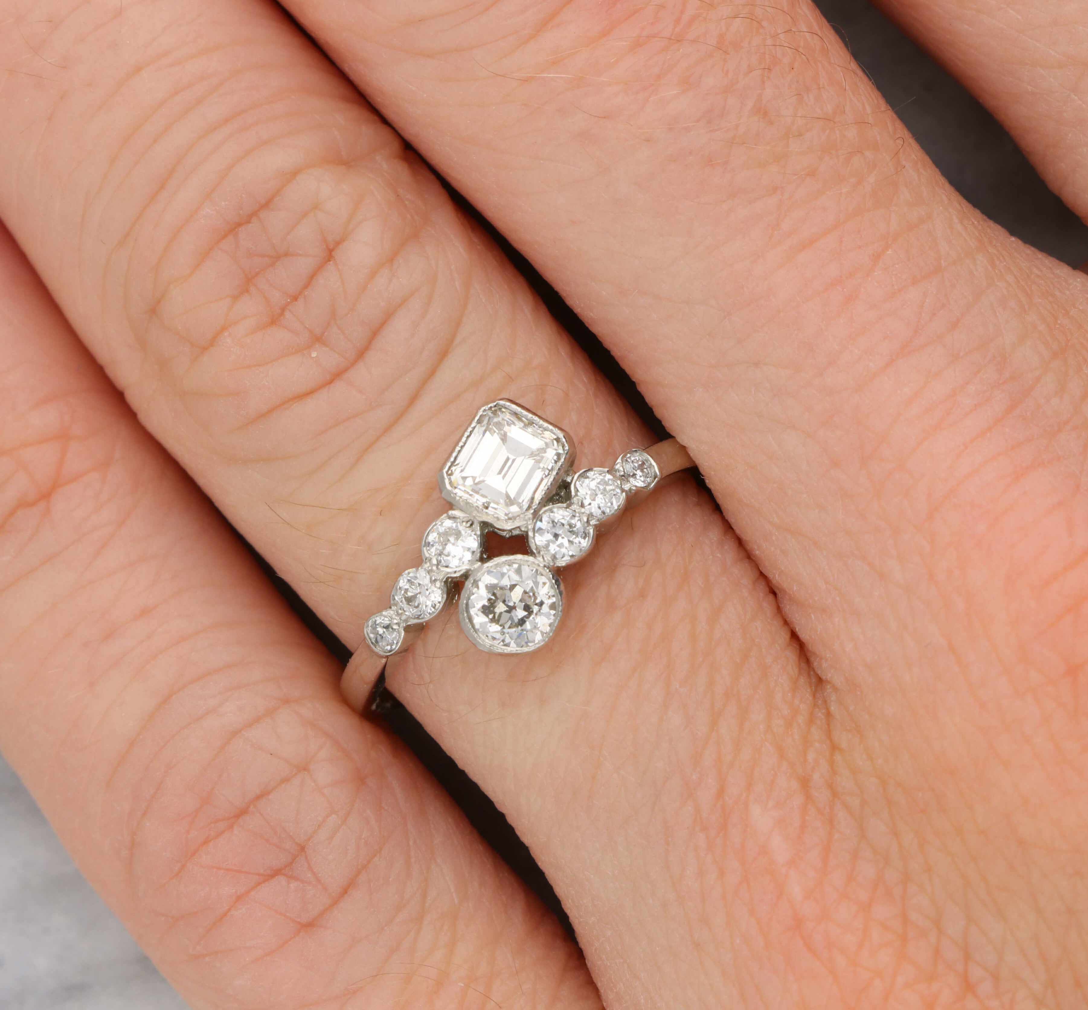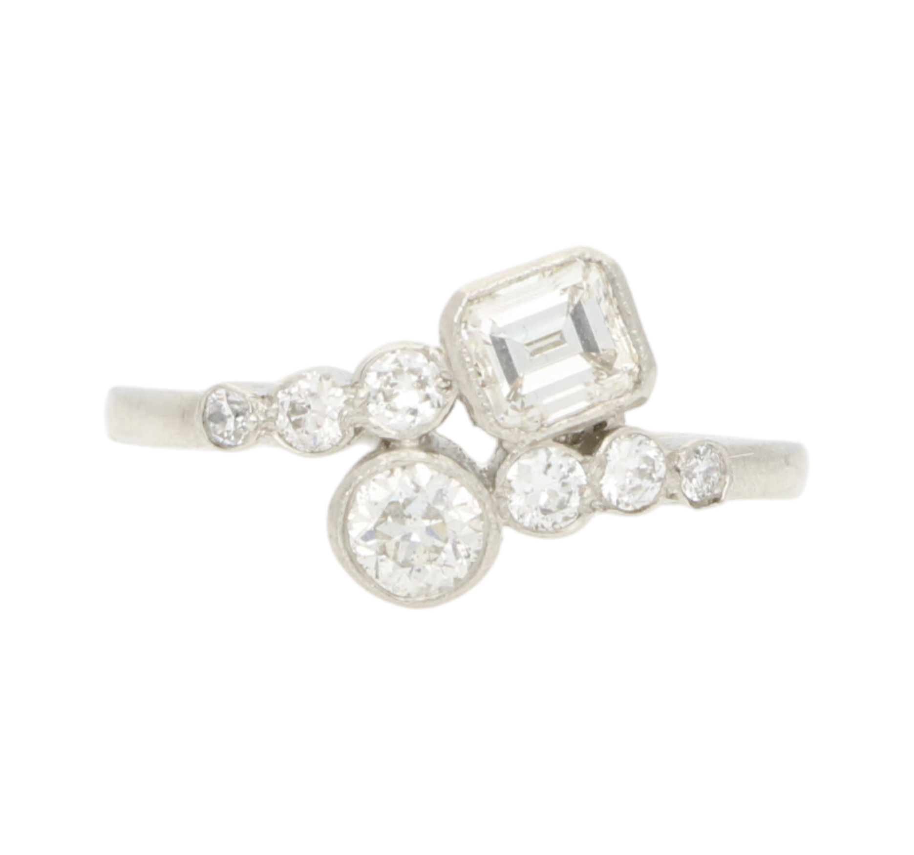 An emerald-cut diamond and round brilliant diamond crossover ring