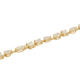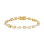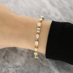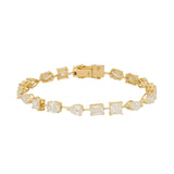 This bracelet features a sequence of individually set diamonds in a variety of cuts, including round brilliant, princess, emerald and pear shapes. Each stone is held in its own setting and linked to allow fluid movement around the wrist. The alternating shapes create visual interest while maintaining a balanced and continuous line of light.