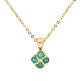 On the pendant there are four vibrant emeralds arranged in a cluster. At the centre sits a single round brilliant cut diamond, adding a subtle sparkle. The warm yellow gold half bezel setting that wraps around each emerald complements the rich tone of the stones and creates a delicate floral effect.