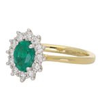 A surround of round brilliant-cut diamonds forms a classic cluster around the emerald, creating a floral outline. The cluster design enhances the size and presence of the centre stone while adding light and contrast.