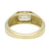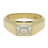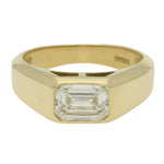 The ring features a single emerald cut diamond set horizontally into the centre of the band. The diamond is securely rub over set, sitting flush within the gold. The wide yellow gold band tapers slightly towards the back of the ring and has a smooth, comfortable fit. The simple setting draws attention to the emerald cut diamond.