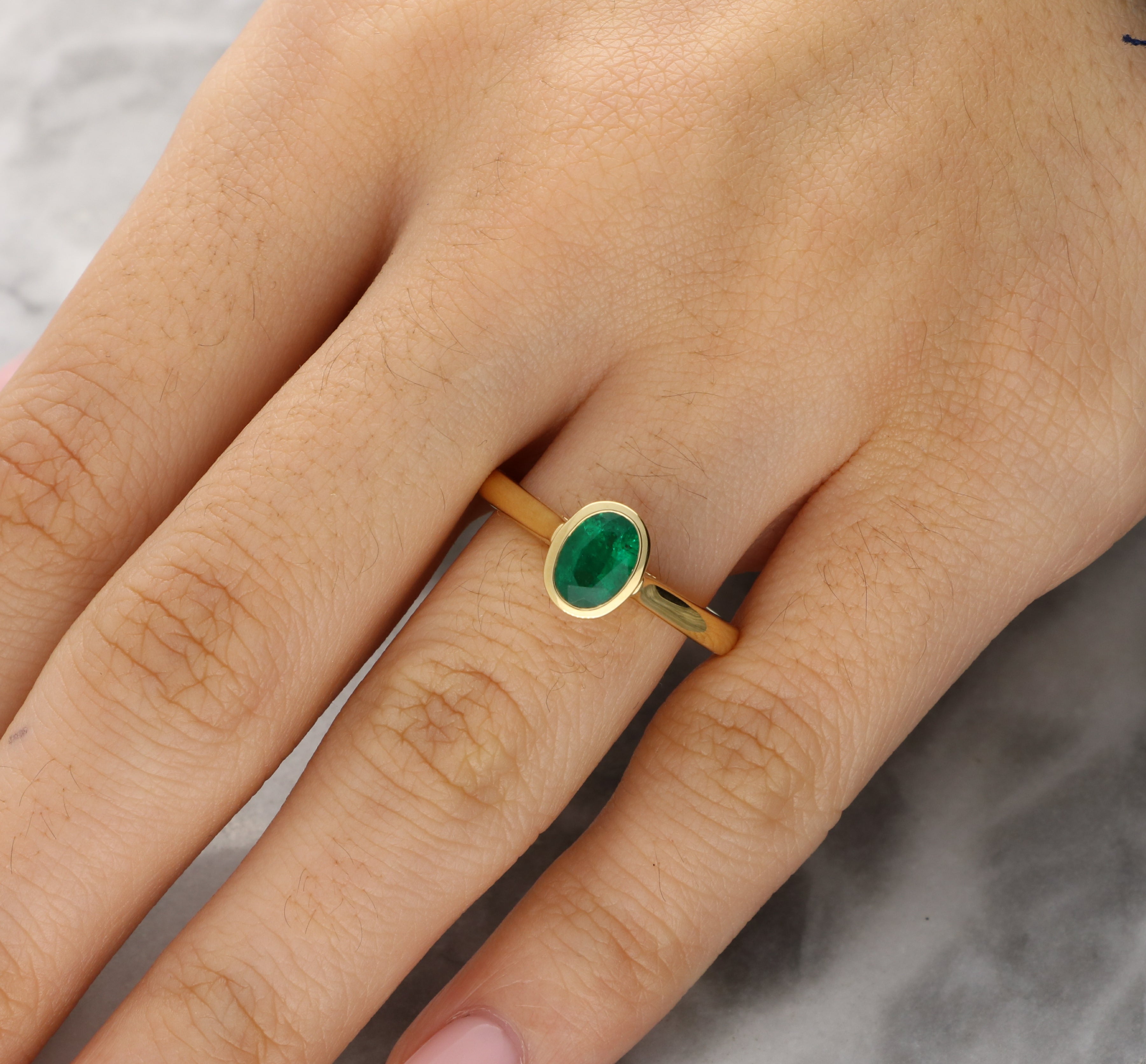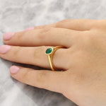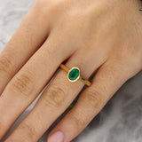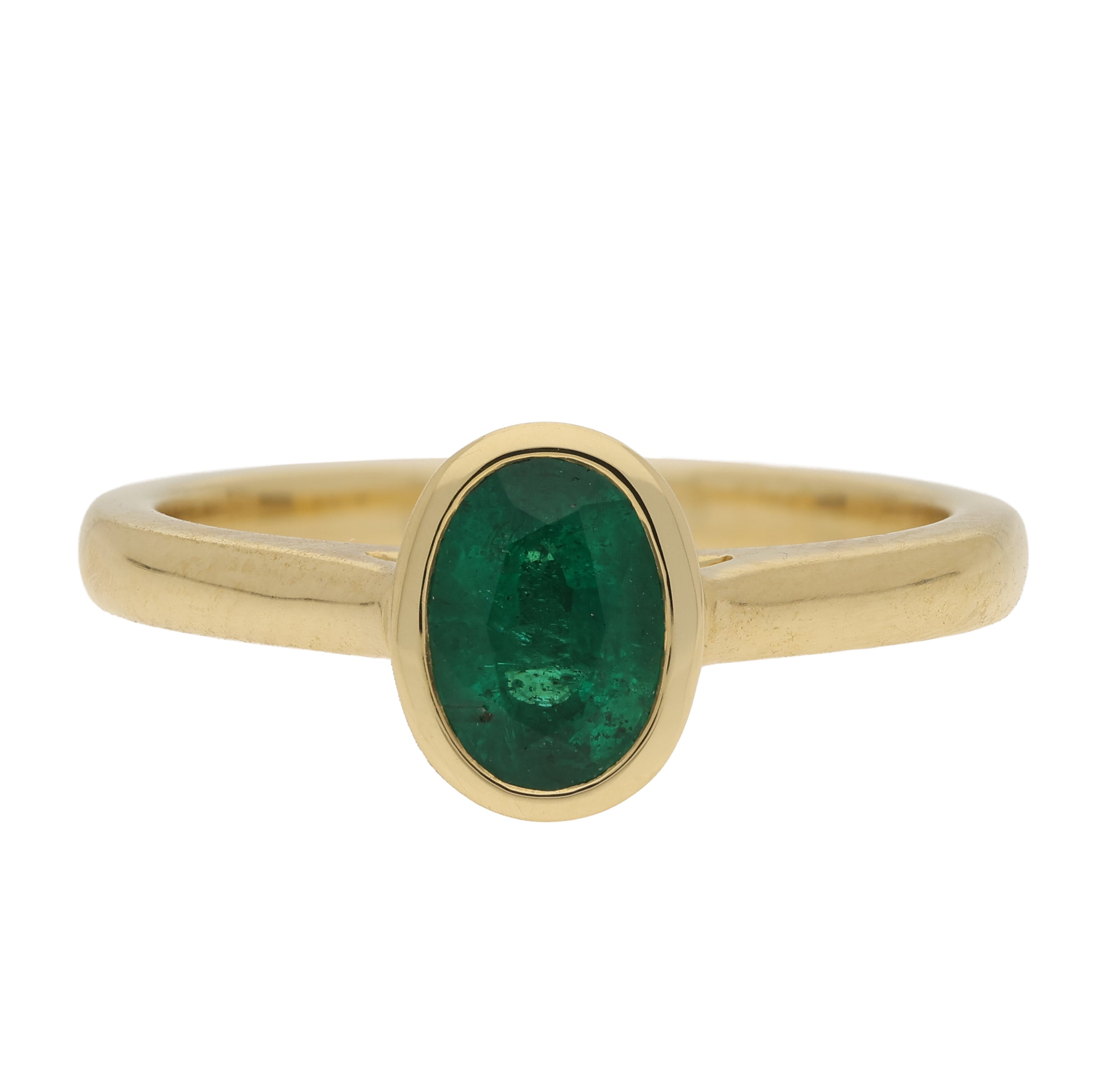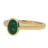 This elegant ring is crafted in 18ct yellow gold and features a single oval-cut emerald, bezel set at the centre. The rich green gemstone is framed by a smooth gold surround that enhances its natural depth of colour while offering visual emphasis.