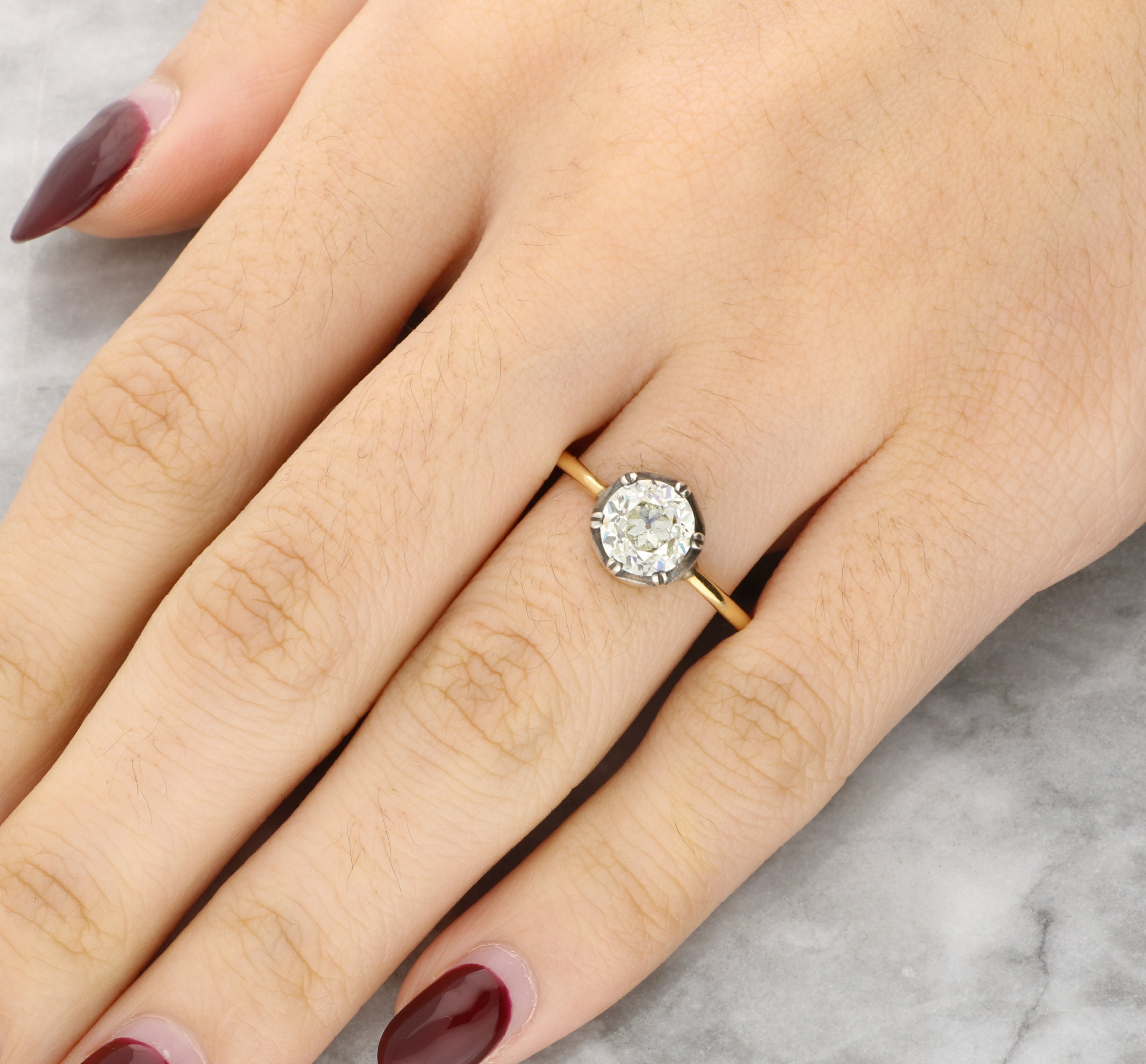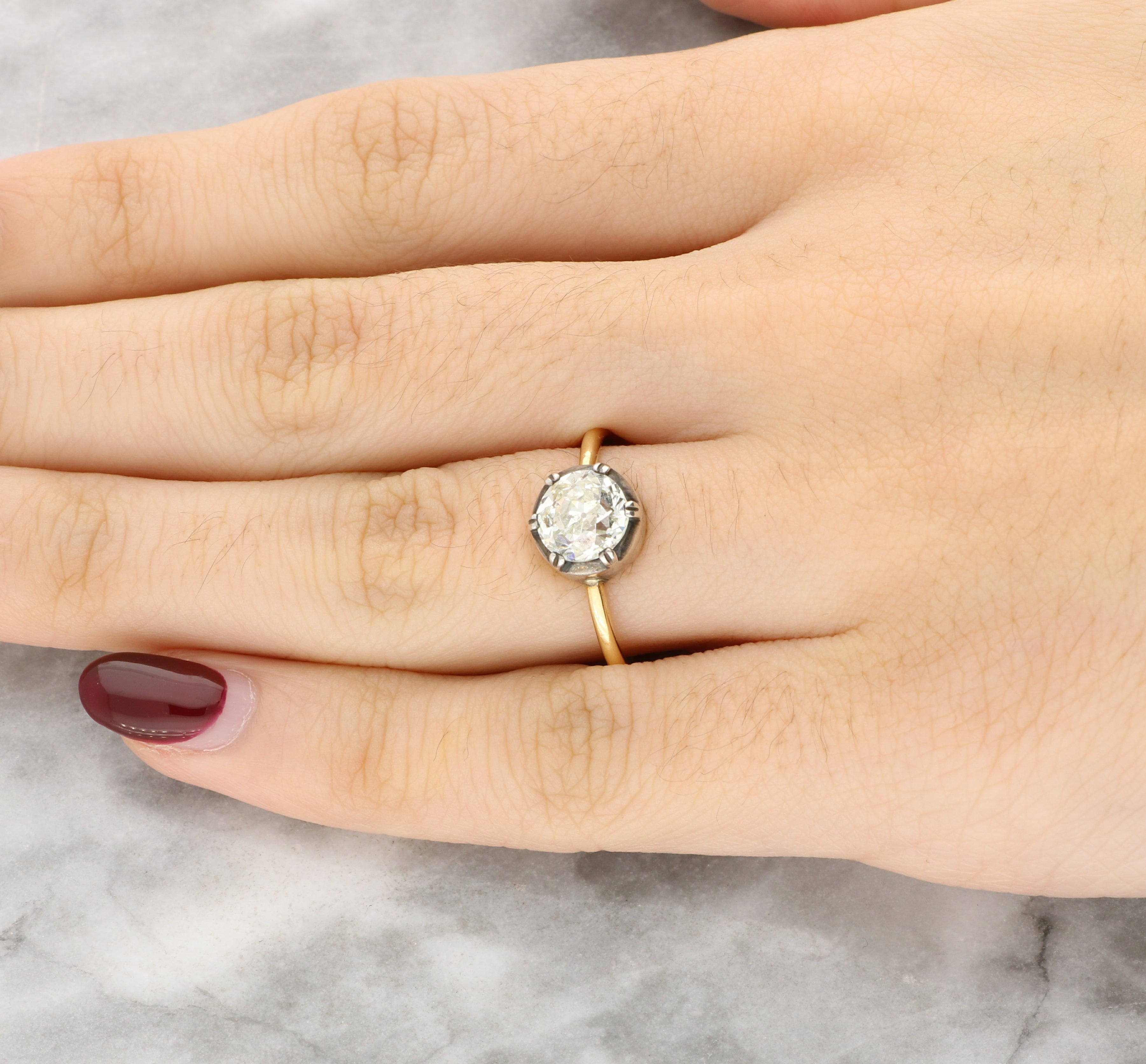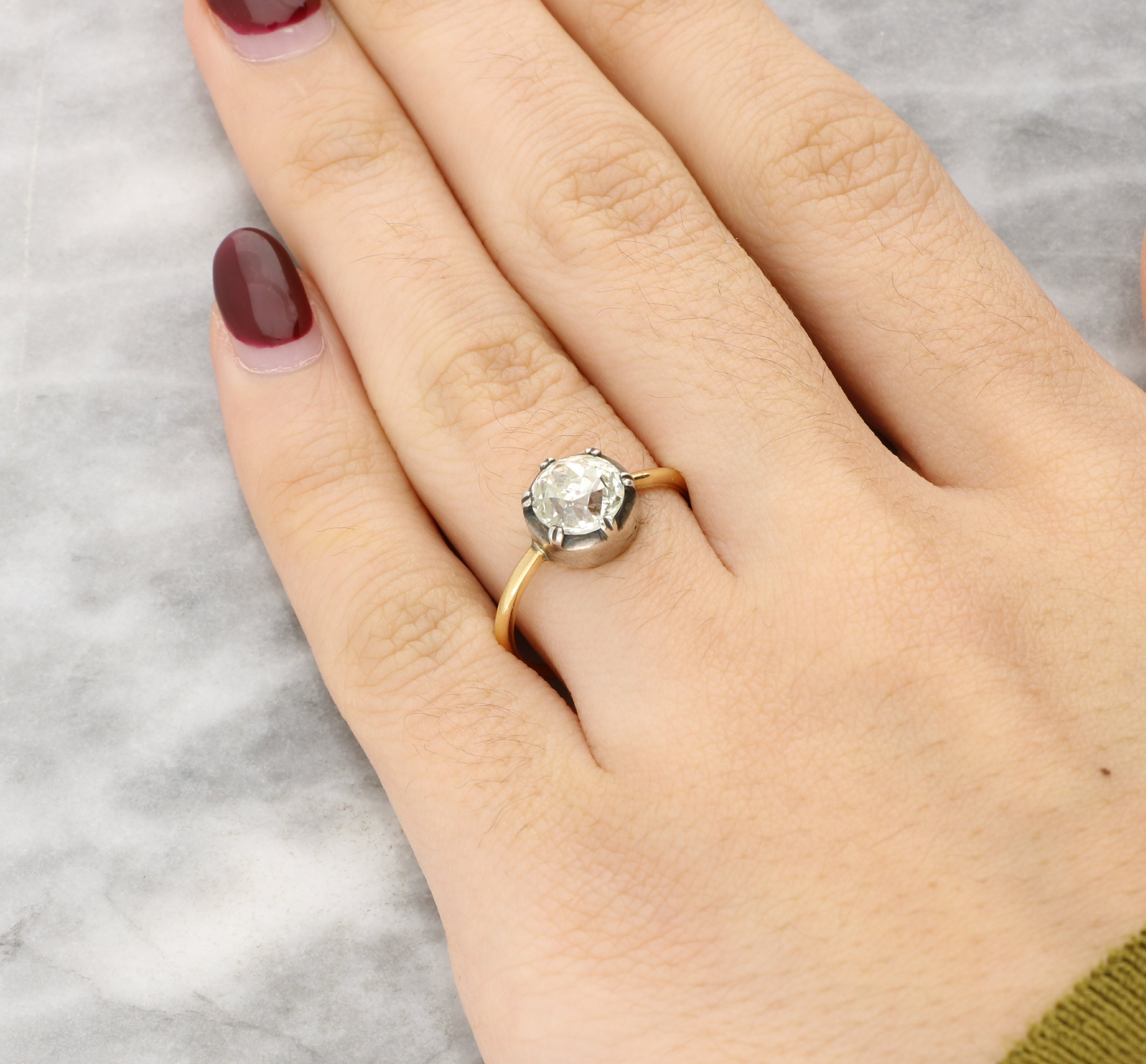 The old cut diamond displays broad facets and a soft sparkle typical of hand cut stones from the period, giving the ring a subtle antique character.