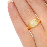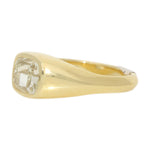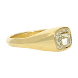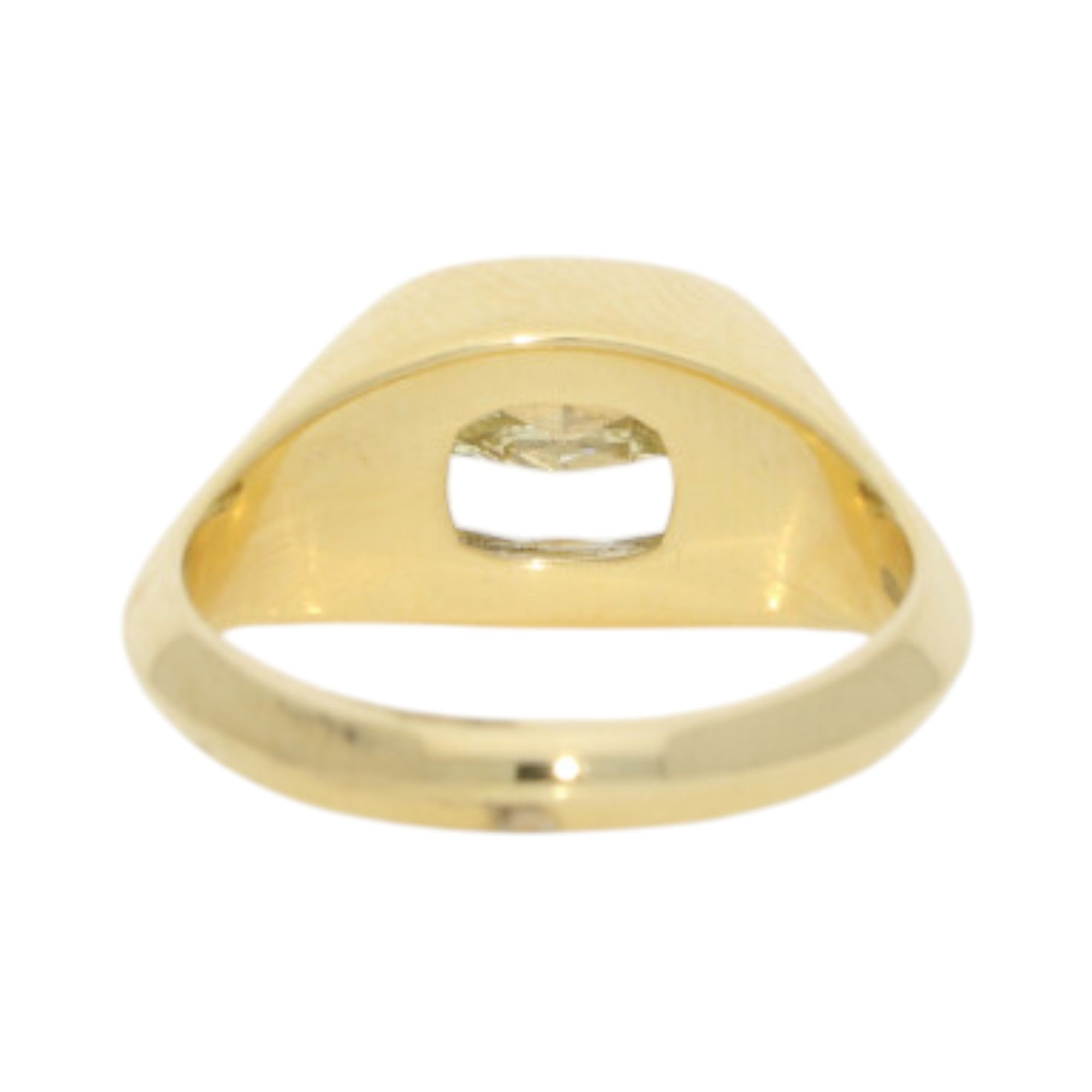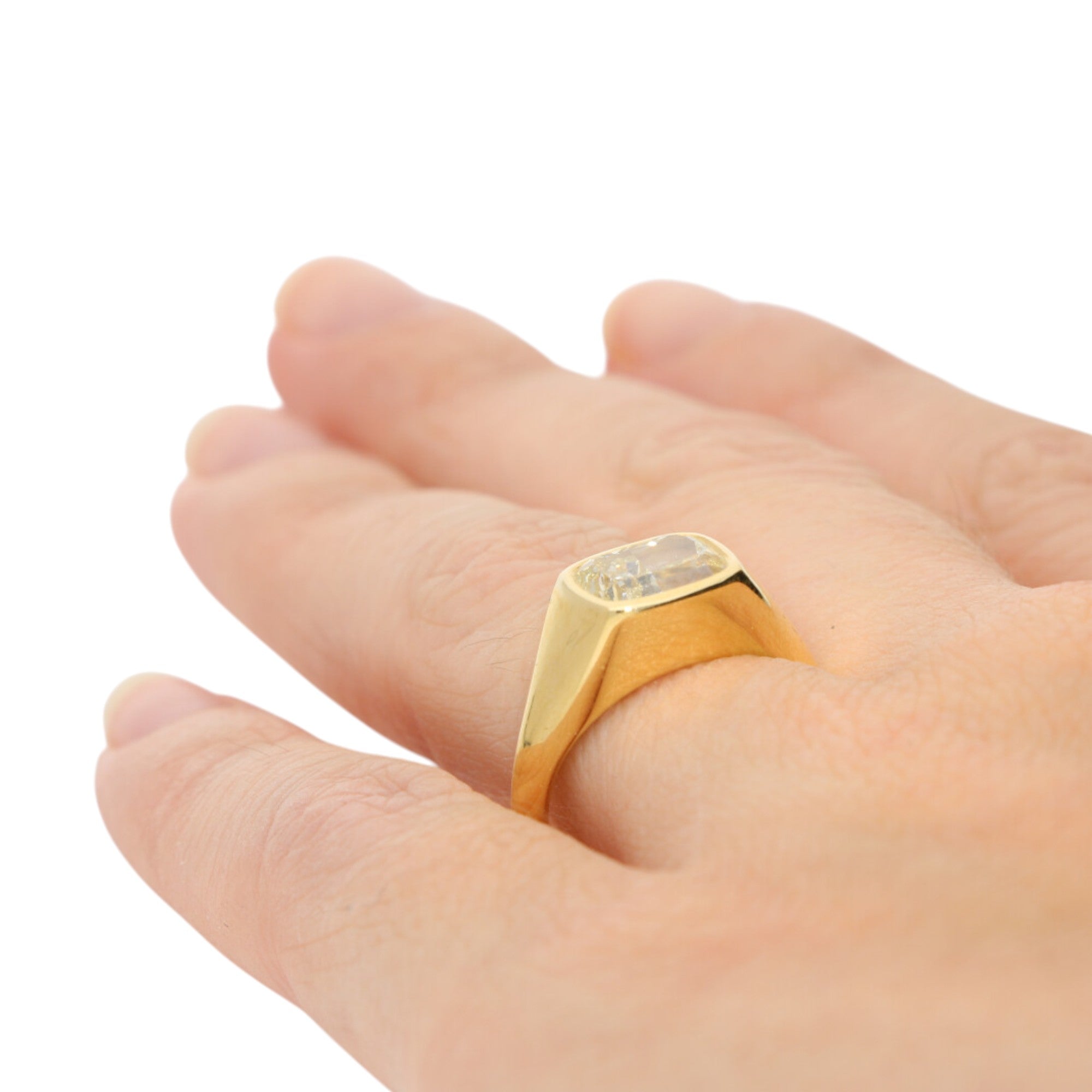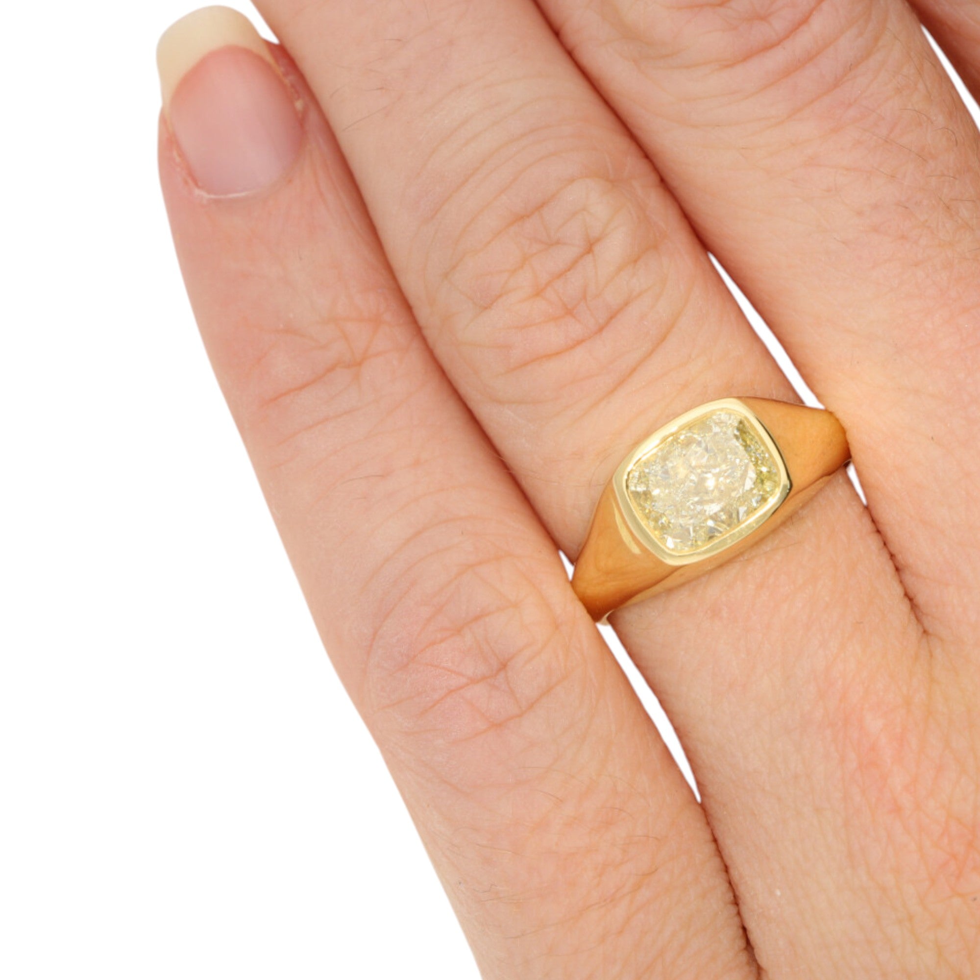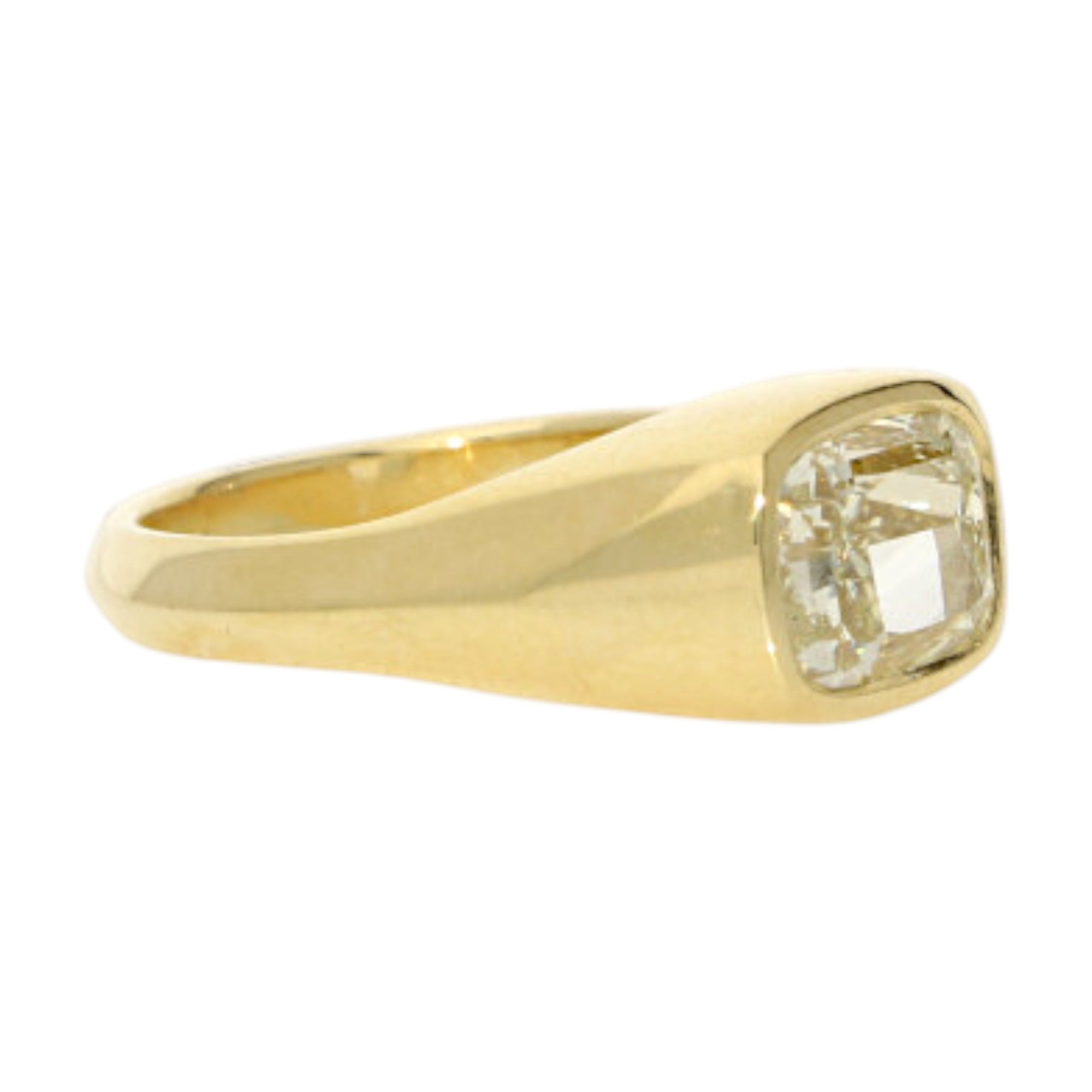 The ring is set with a stunning cushion cut diamond which is securely bezel set. The large central diamond features a beautiful solid heavy-weight 18k yellow gold mount.