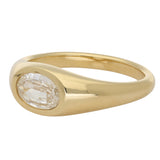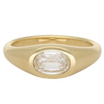 This ring is crafted in 18K yellow gold and features an oval cut diamond set in a smooth bezel setting at the centre. The diamond displays a soft, bright appearance, with step-like facets that create a refined and subtle play of light.