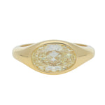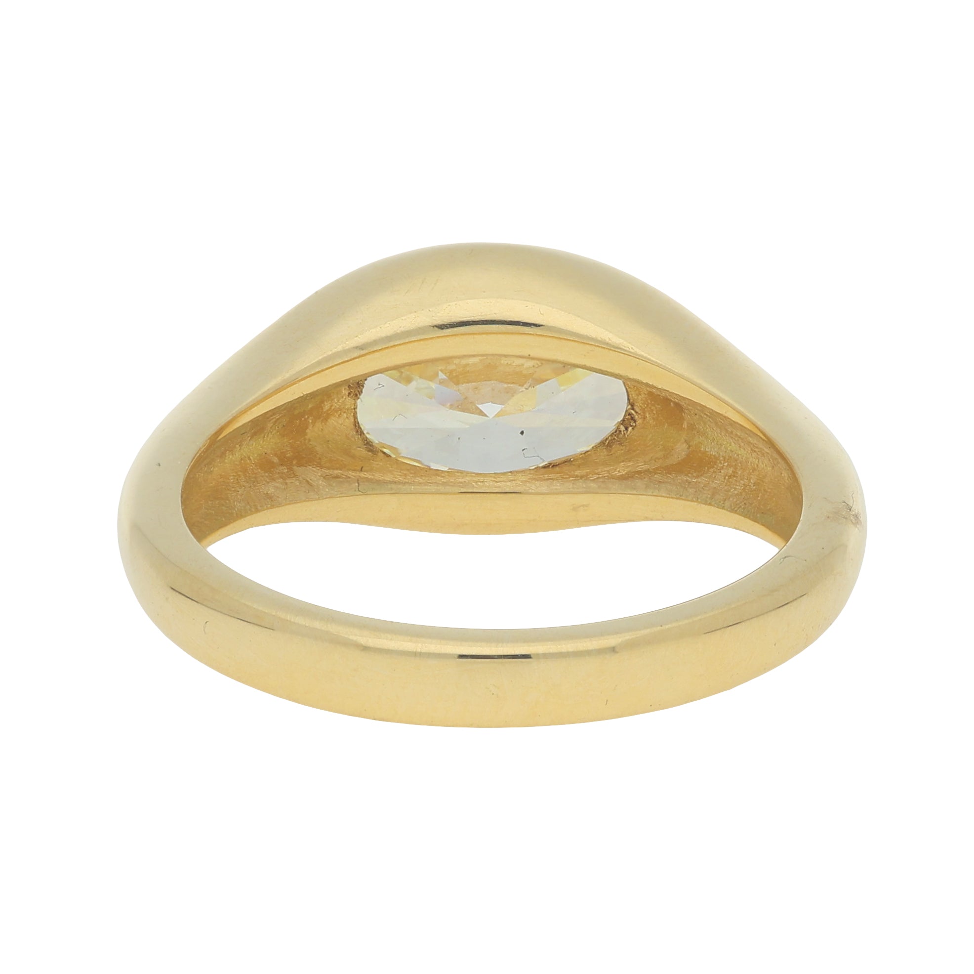 A beautiful vintage style east–west bezel set 2.11ct oval cut diamond ring, crafted in 18k yellow gold.