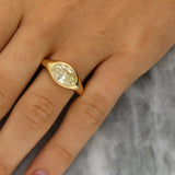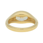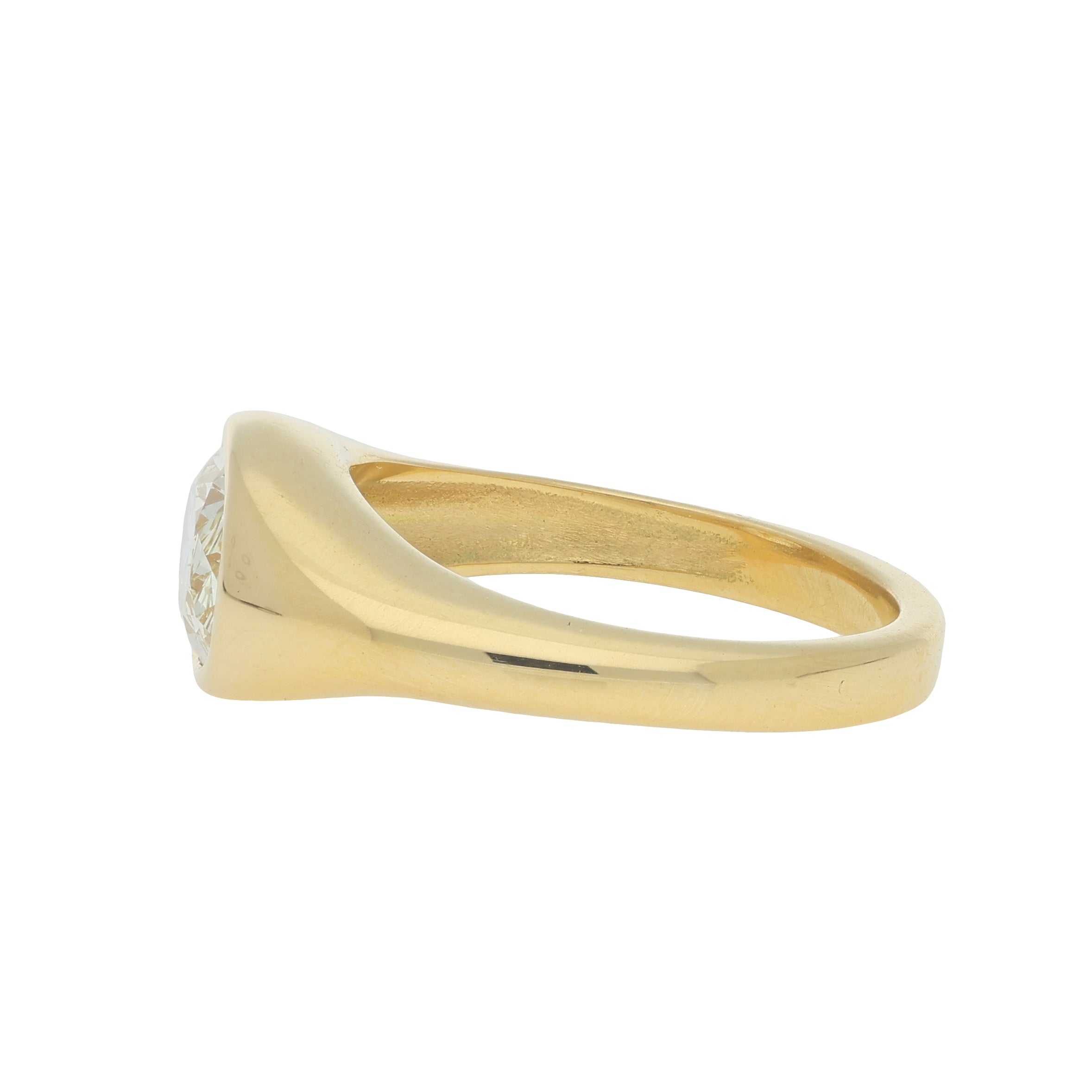 The ring features a stunning oval cut diamond, securely bezel set in a solid, heavy weight 18k yellow gold mount. The head of the ring gently tapers into the band, creating a smooth and elegant silhouette.