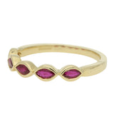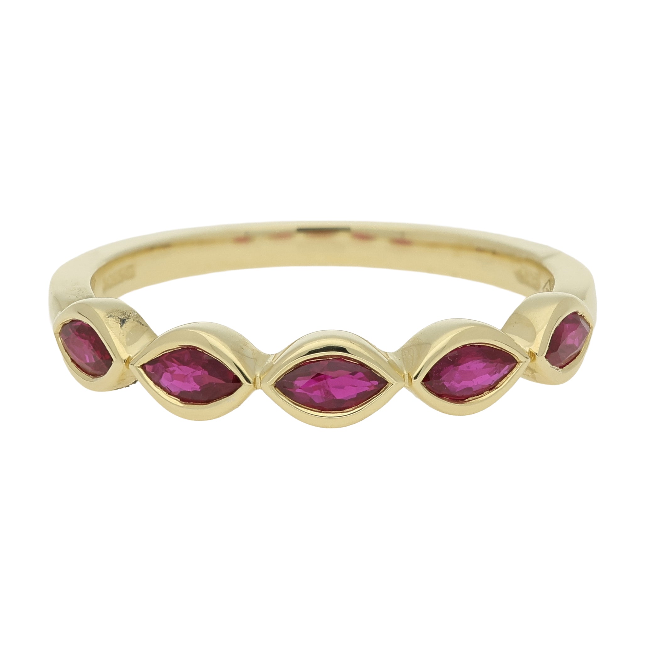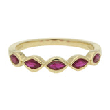 This elegant band ring is crafted in polished 18K yellow gold and showcases a row of marquise-cut rubies set gracefully across the top. The rich red gemstones are bezel set, creating a smooth profile that enhances their vibrant colour while providing a secure, modern finish.
