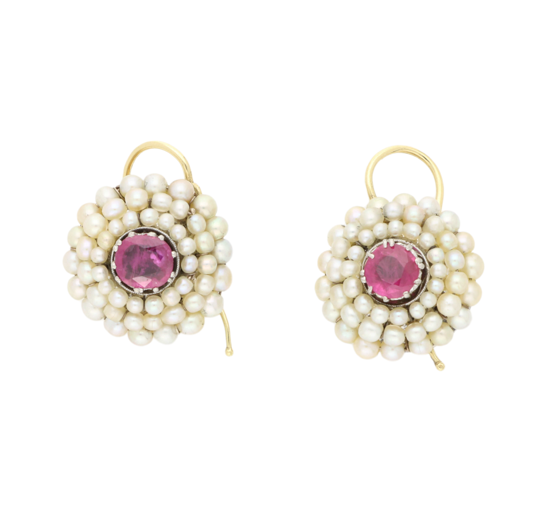 A pair of yellow gold natural pearl and ruby cluster earrings