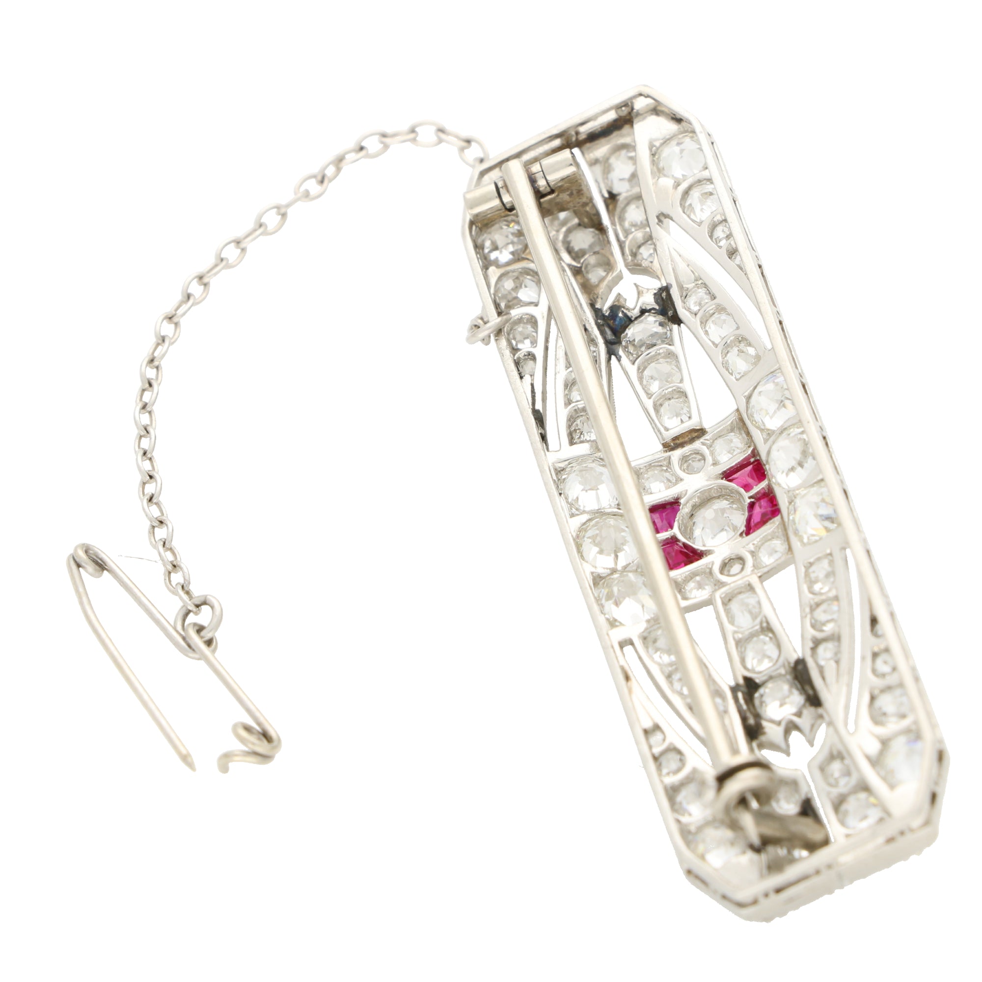 A striking Art Deco old cut diamond and ruby panel brooch, set in platinum.