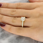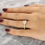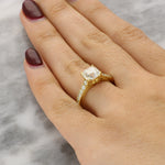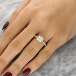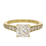 Round brilliant cut diamonds are set along the shoulders, adding light and supporting the centre stone without overpowering it.
