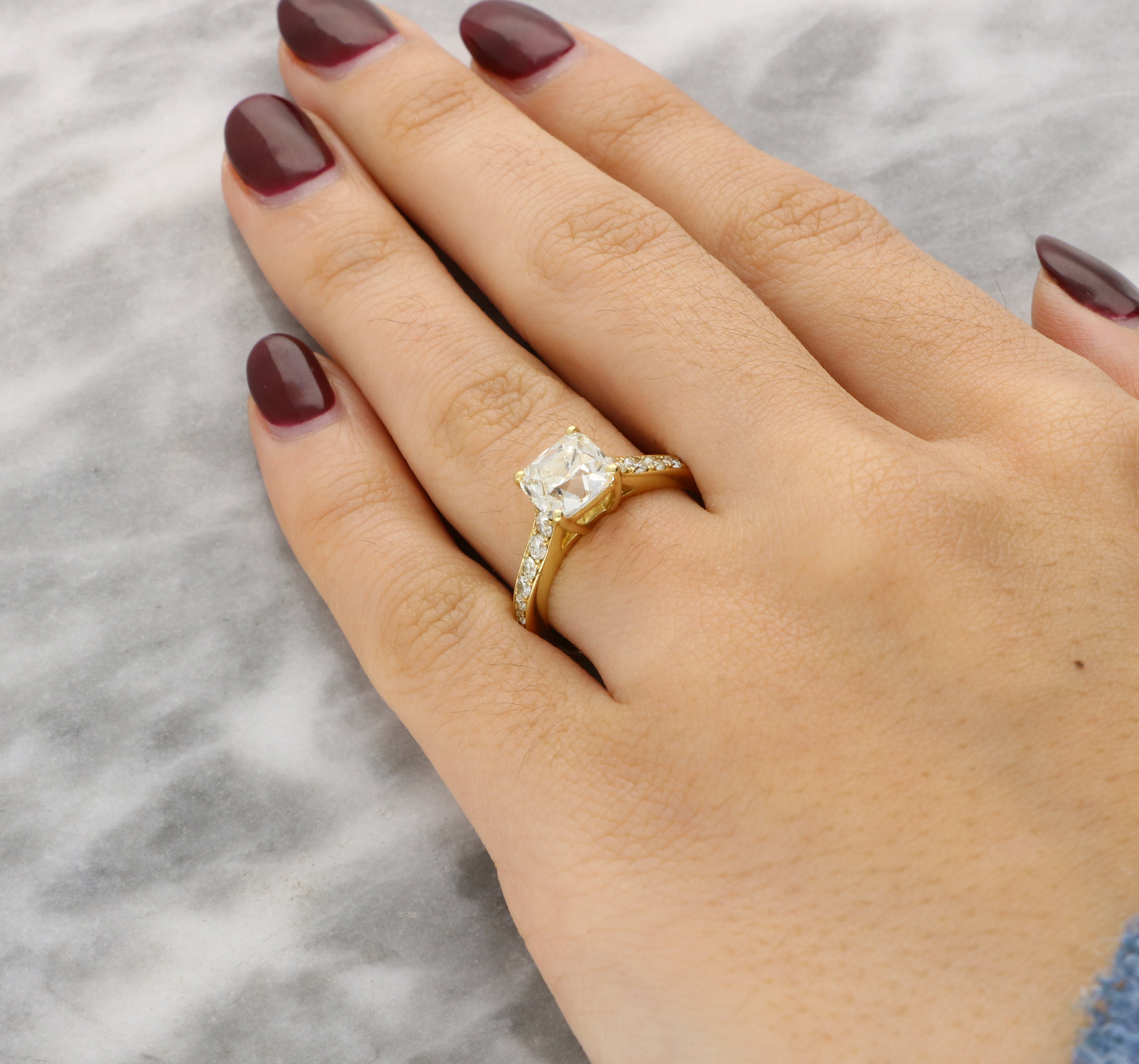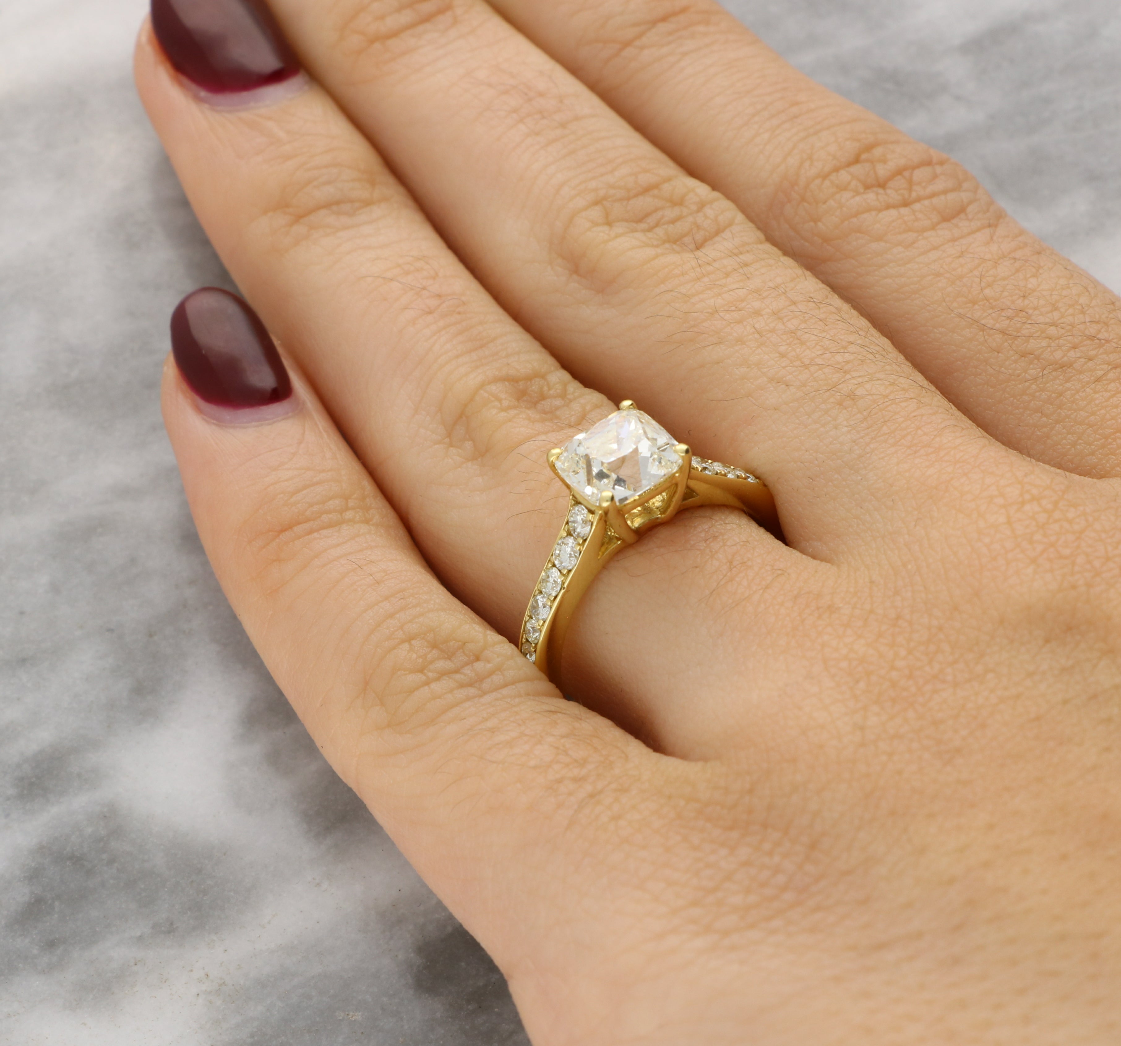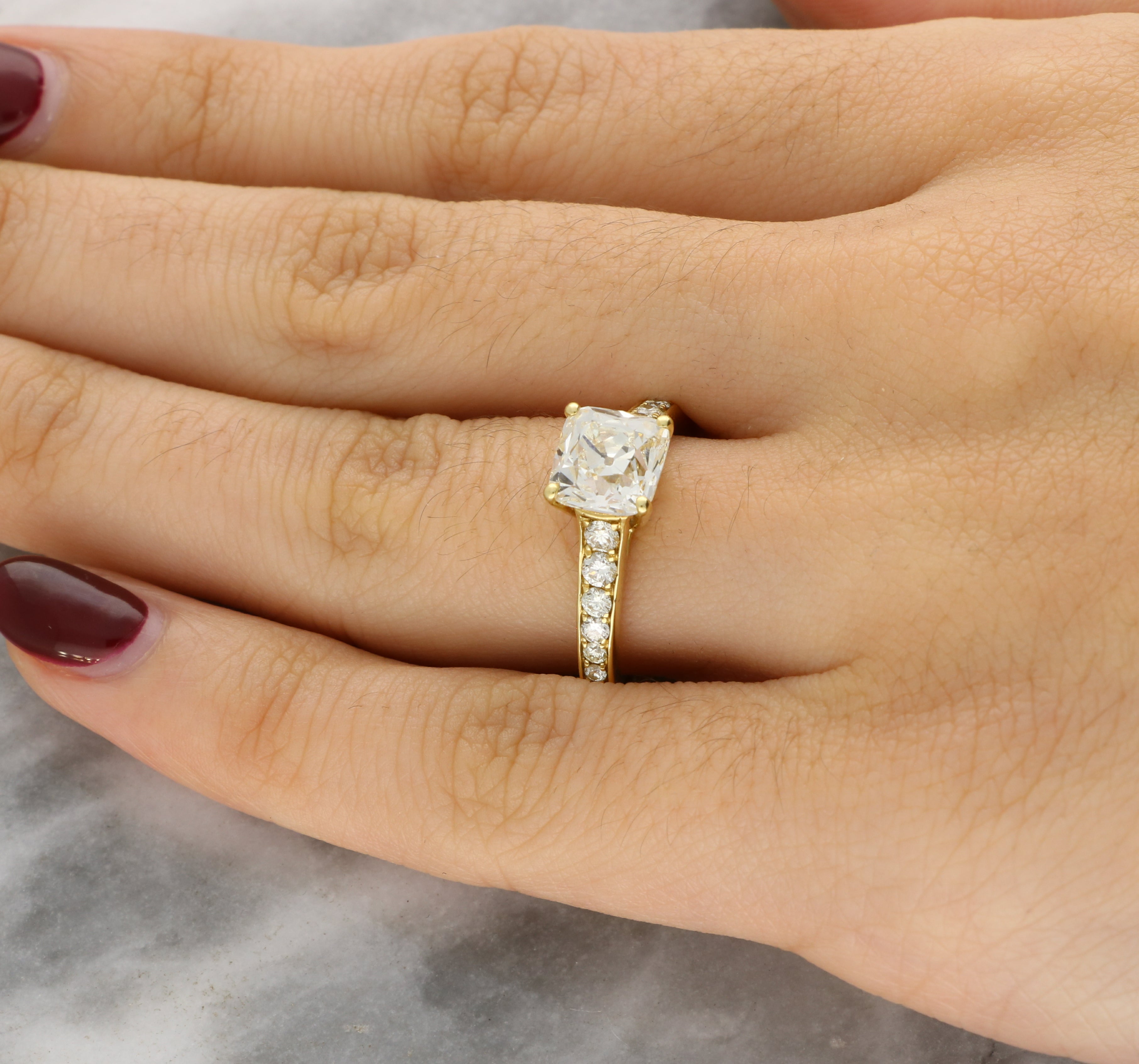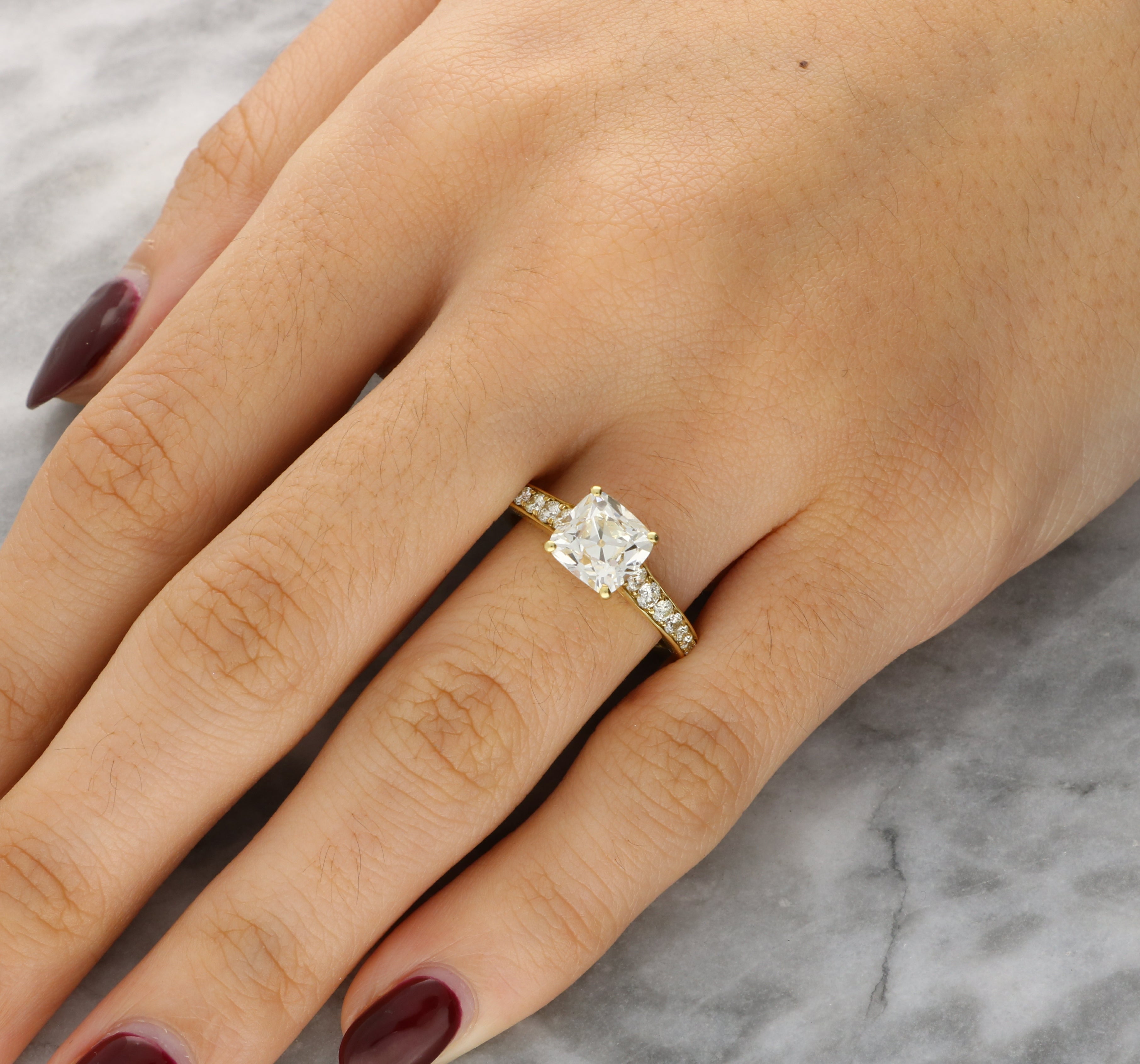 This ring centres on an old cushion cut diamond, set in four claws. The hand-cut facets and softer outline give the stone a distinctive character and a gentle glow. Diamond is the birthstone for April and is linked to strength, clarity and lasting love.