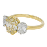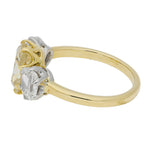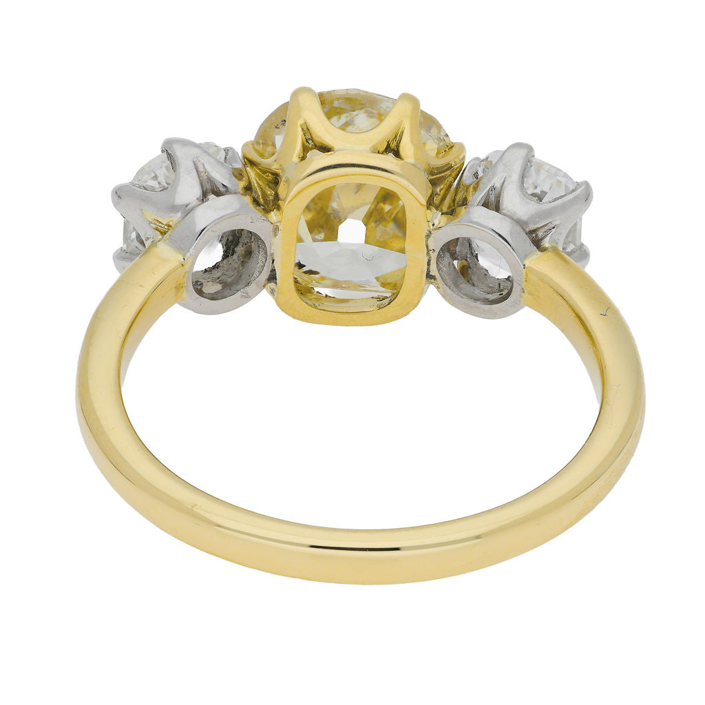 The ring is centrally set with a yellow old cushion cut diamond which is securely eight claw set in yellow gold. The diamond is then sided by two beautiful matched cushion cut diamonds which contrast perfectly against the warm tones of the central diamond. The head of the ring leads to a solid gold band.