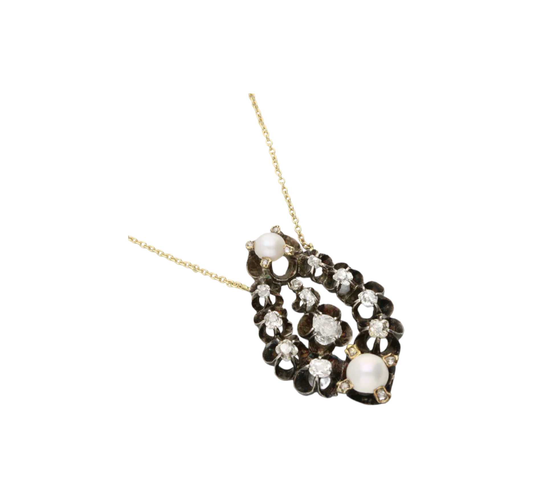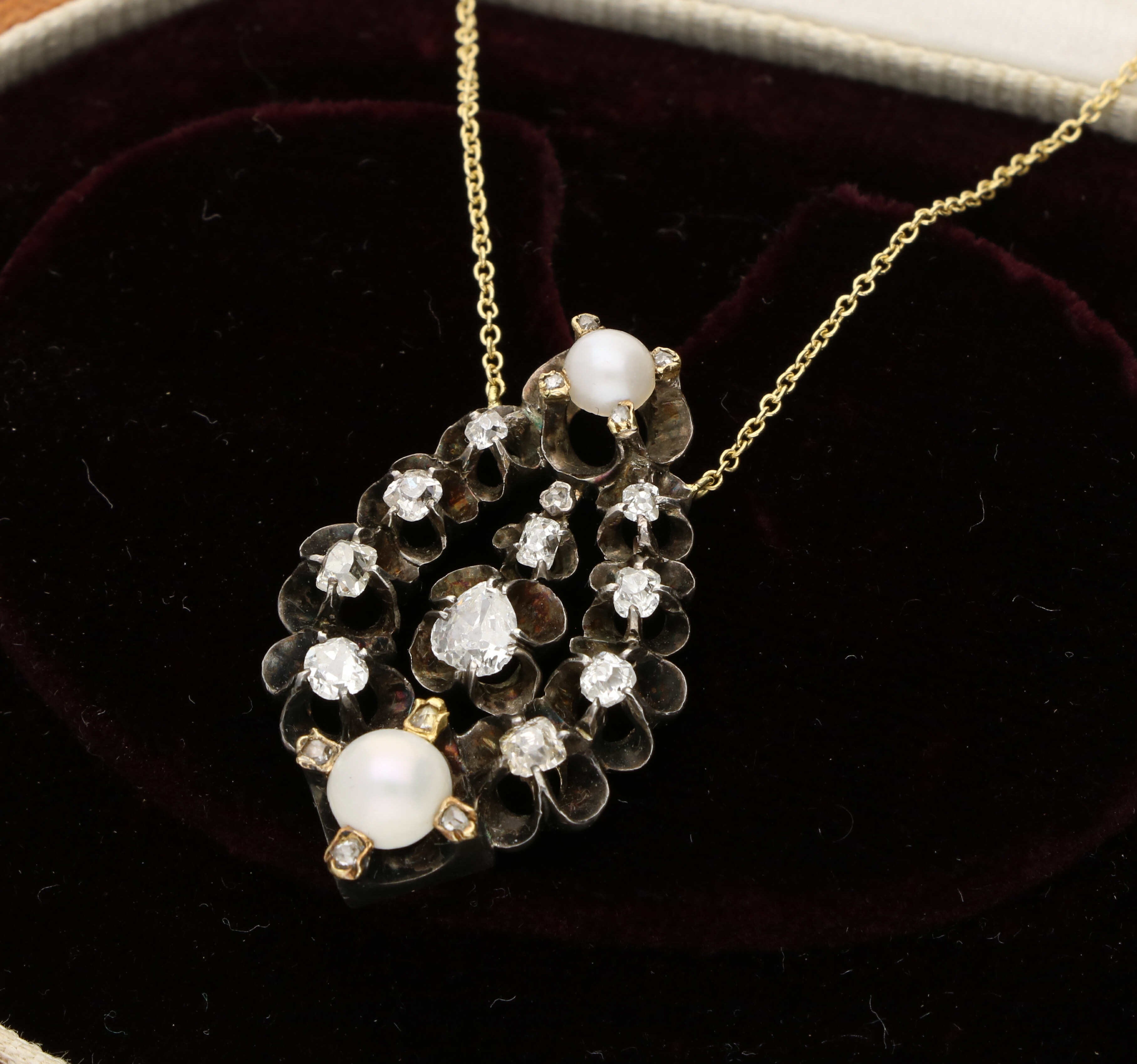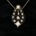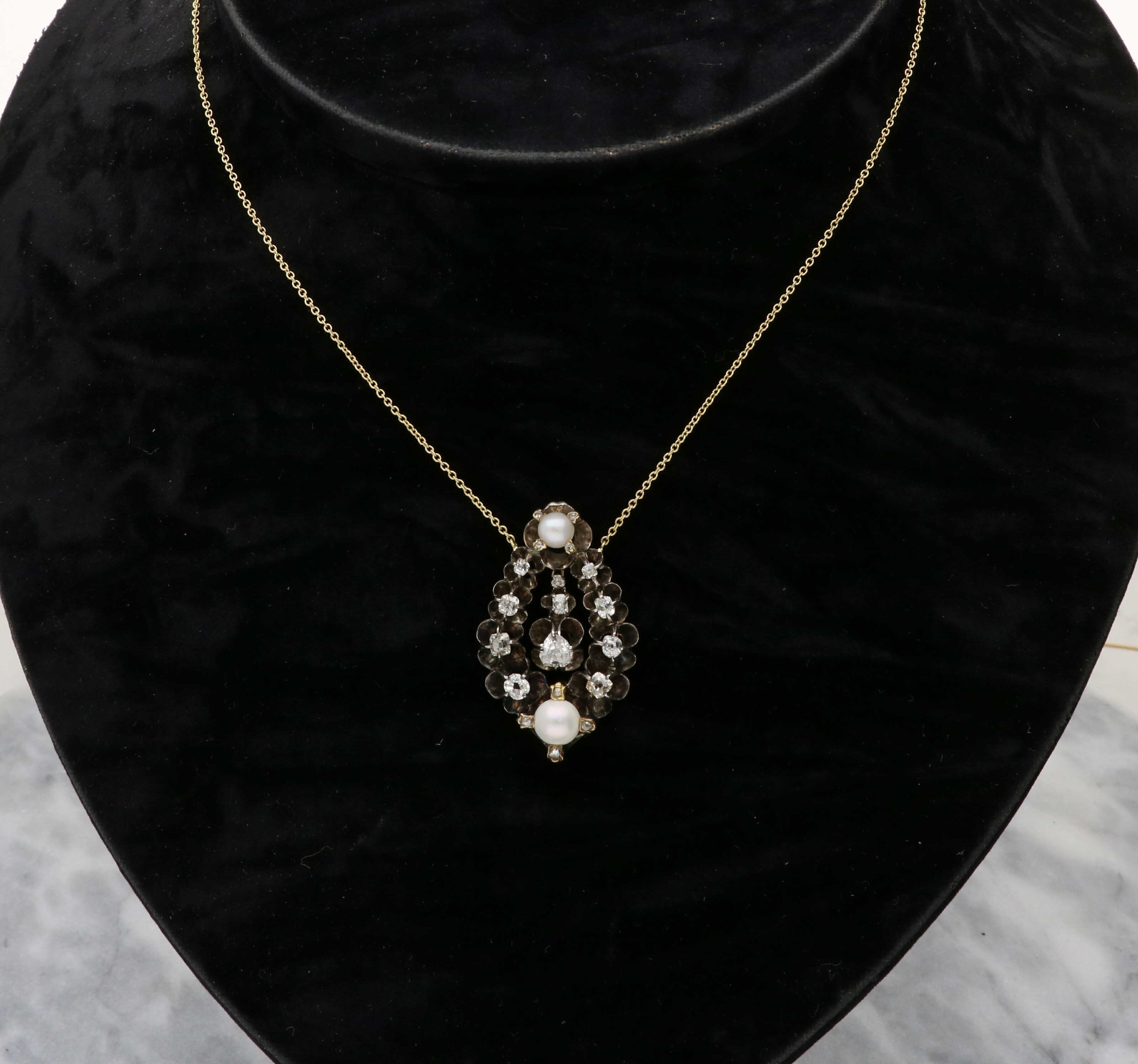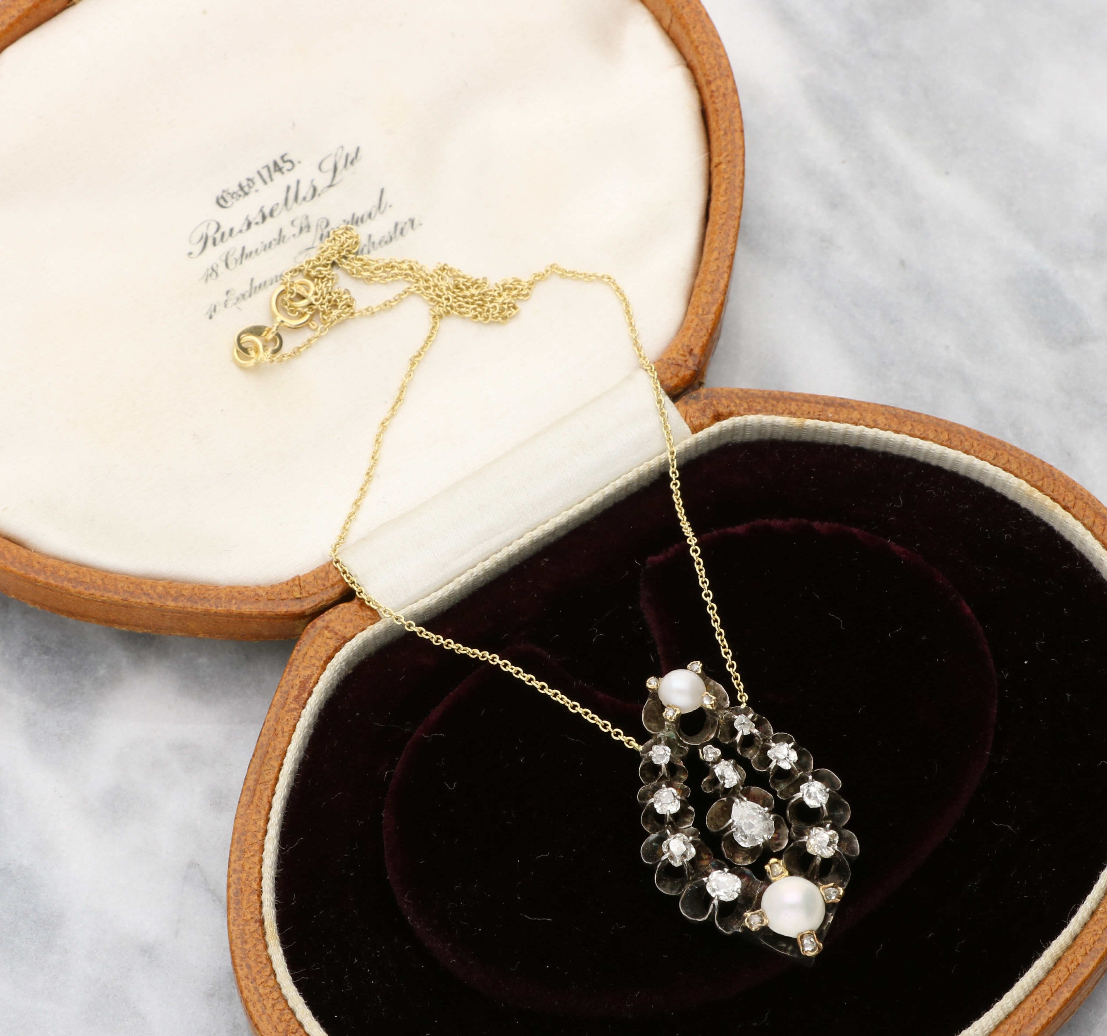 Dimensions: The pendant is set with a 6mm and 4mm pearl and beautiful, bright old cut and rose cut diamonds. The central diamond is approximately 4x5mm and the pendant measures 32x20mm. The 18ct yellow gold chain is 16 inches in length.