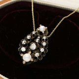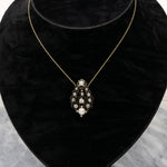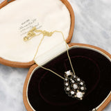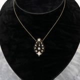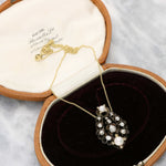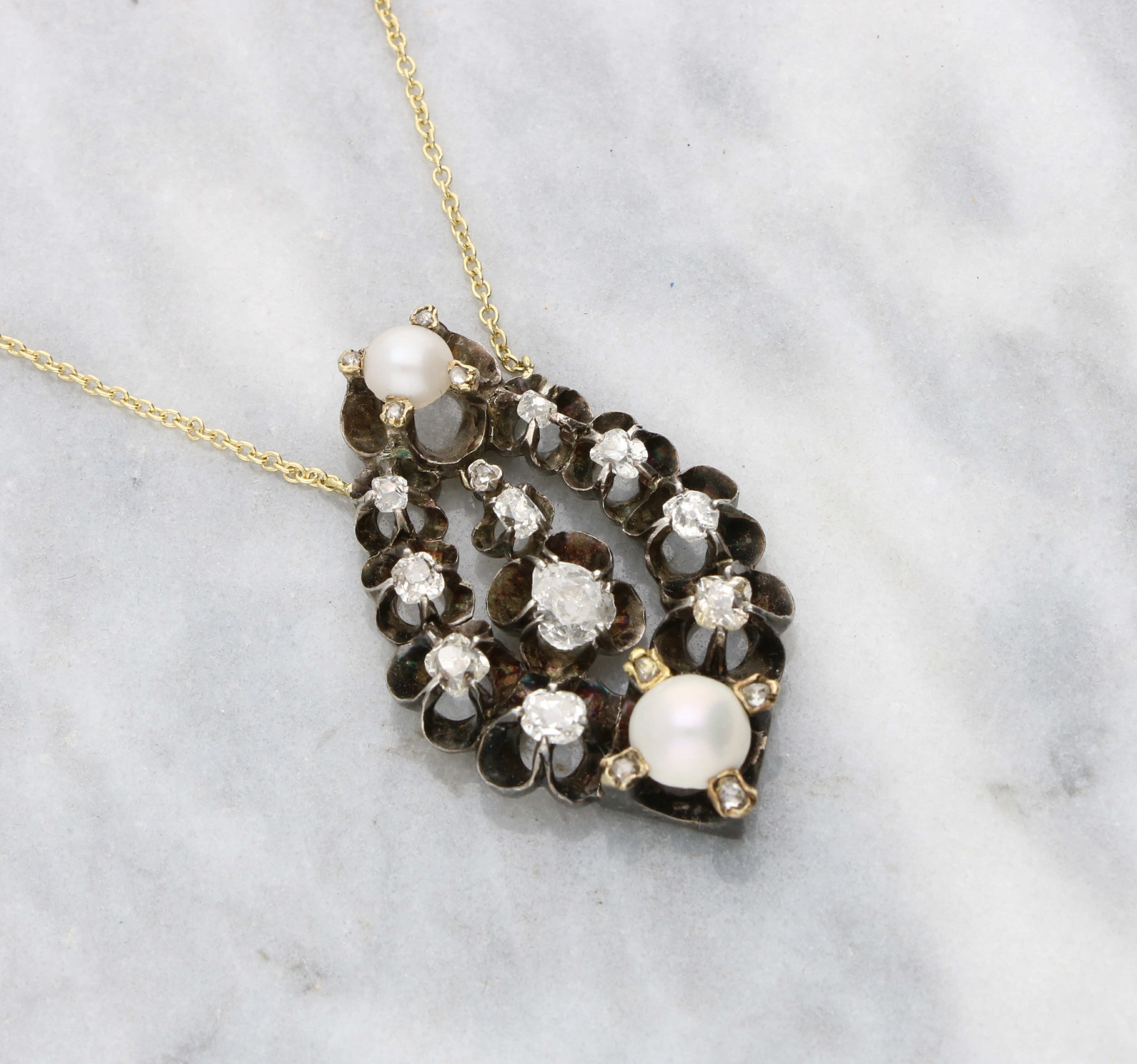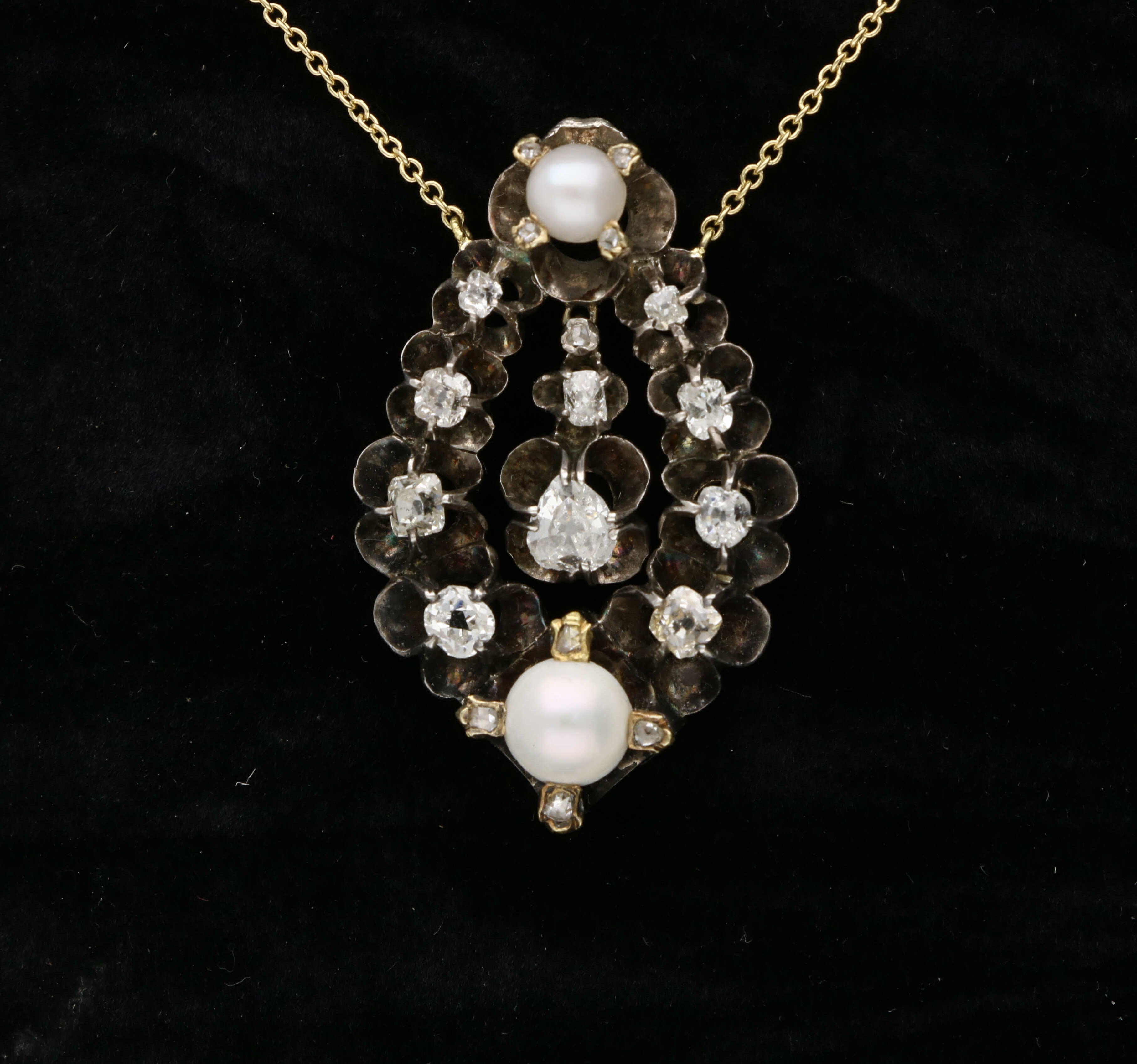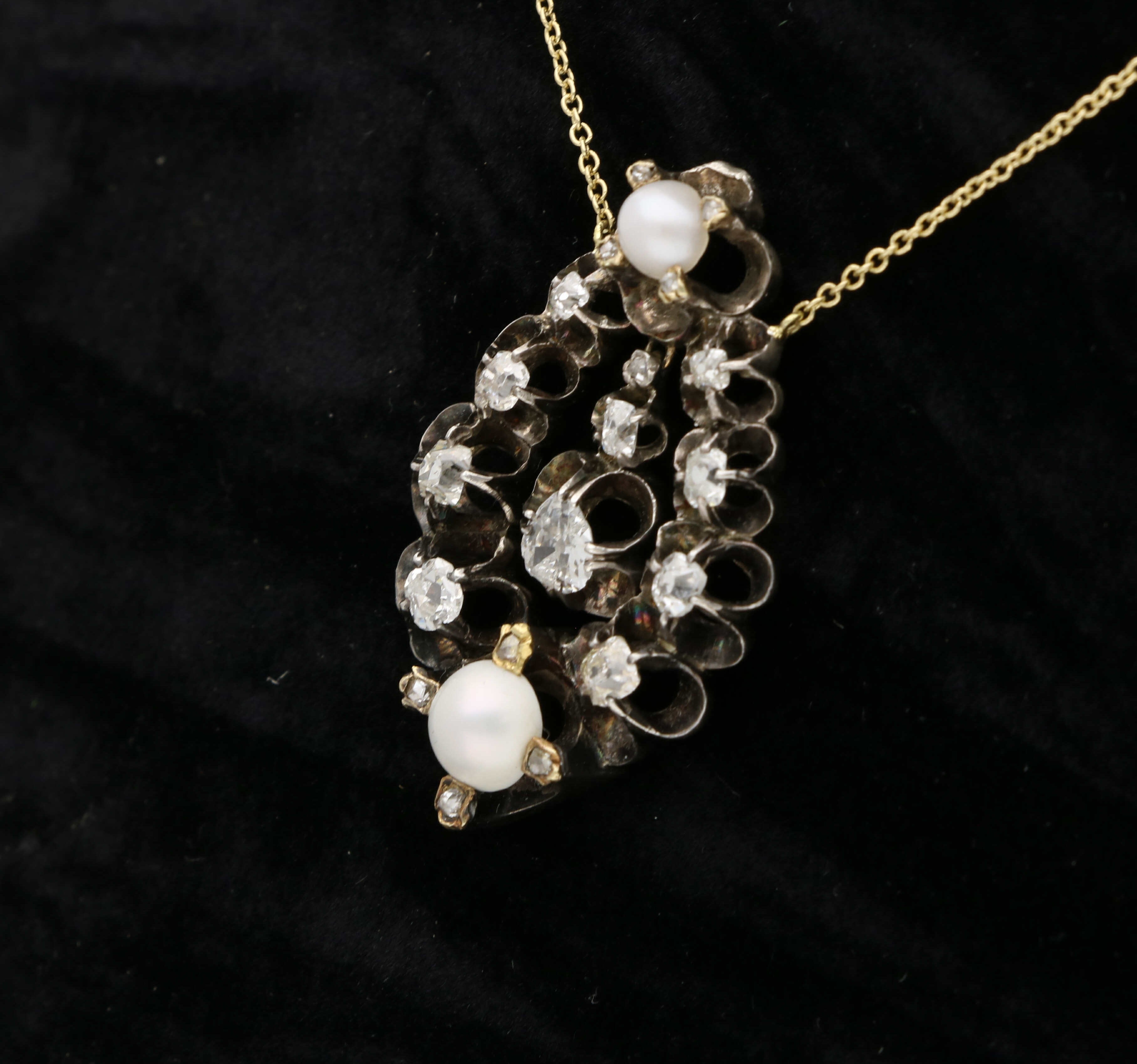 Dimensions: The pendant is set with a 6mm and 4mm pearl and beautiful, bright old cut and rose cut diamonds. The central diamond is approximately 4x5mm and the pendant measures 32x20mm. The 18ct yellow gold chain is 16 inches in length.