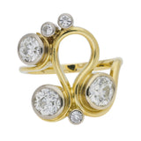 This unique 18ct gold ring showcases the timeless beauty of old cut diamonds. Featuring a trio of bright, characterful old cuts bezel-set, the ring captures the one-of-a-kind charm and the warm yellow gold contrasts beautifully with the sparkling diamonds, creating a classic and elegant design.