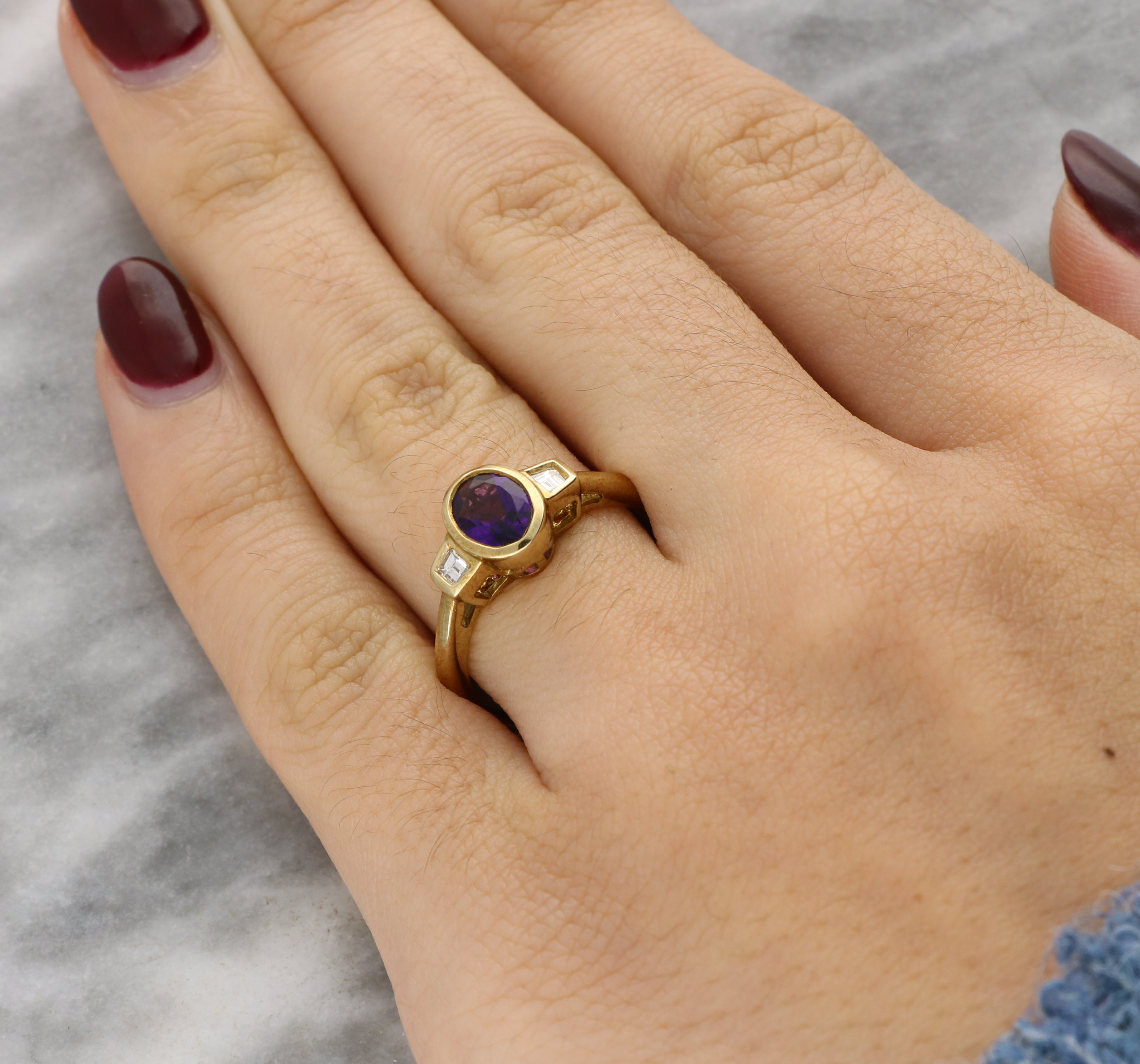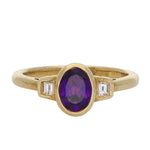 This lovely ring is centred on a richly coloured oval-cut amethyst, bezel-set in 18ct yellow gold to enhance its deep violet hue and smooth, elegant outline. The warm gold setting beautifully complements the intensity of the gemstone. On either side sit square-cut diamonds, also bezel-set, adding a subtle geometric contrast to the flowing oval centre stone.