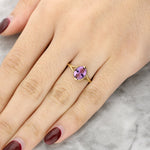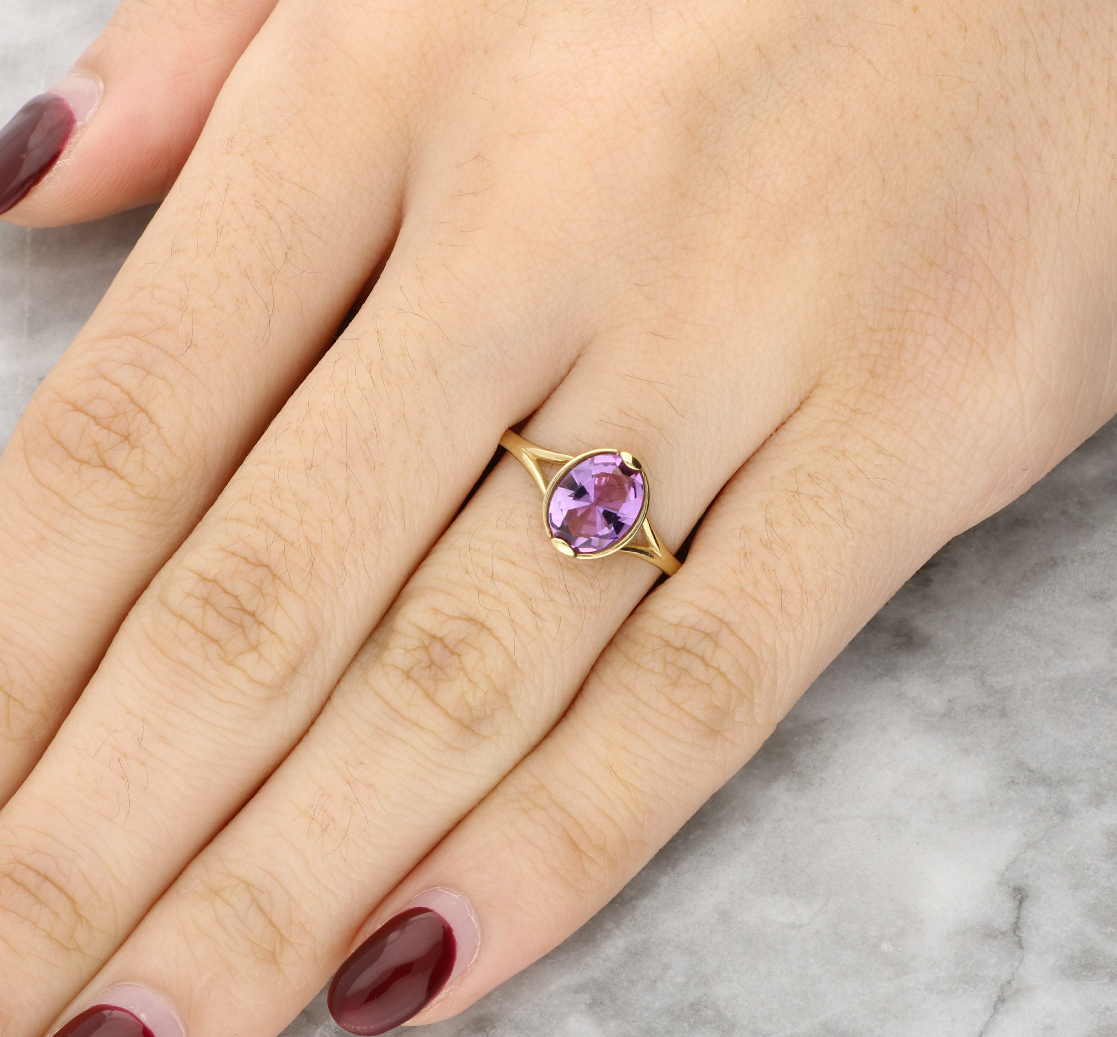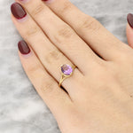 The amethyst is set on a slender 9ct yellow gold band with a split shank. The warm tone complements the bright purple of the centre stone. The minimalist design allows the gemstone’s unique colour to take centre stage.