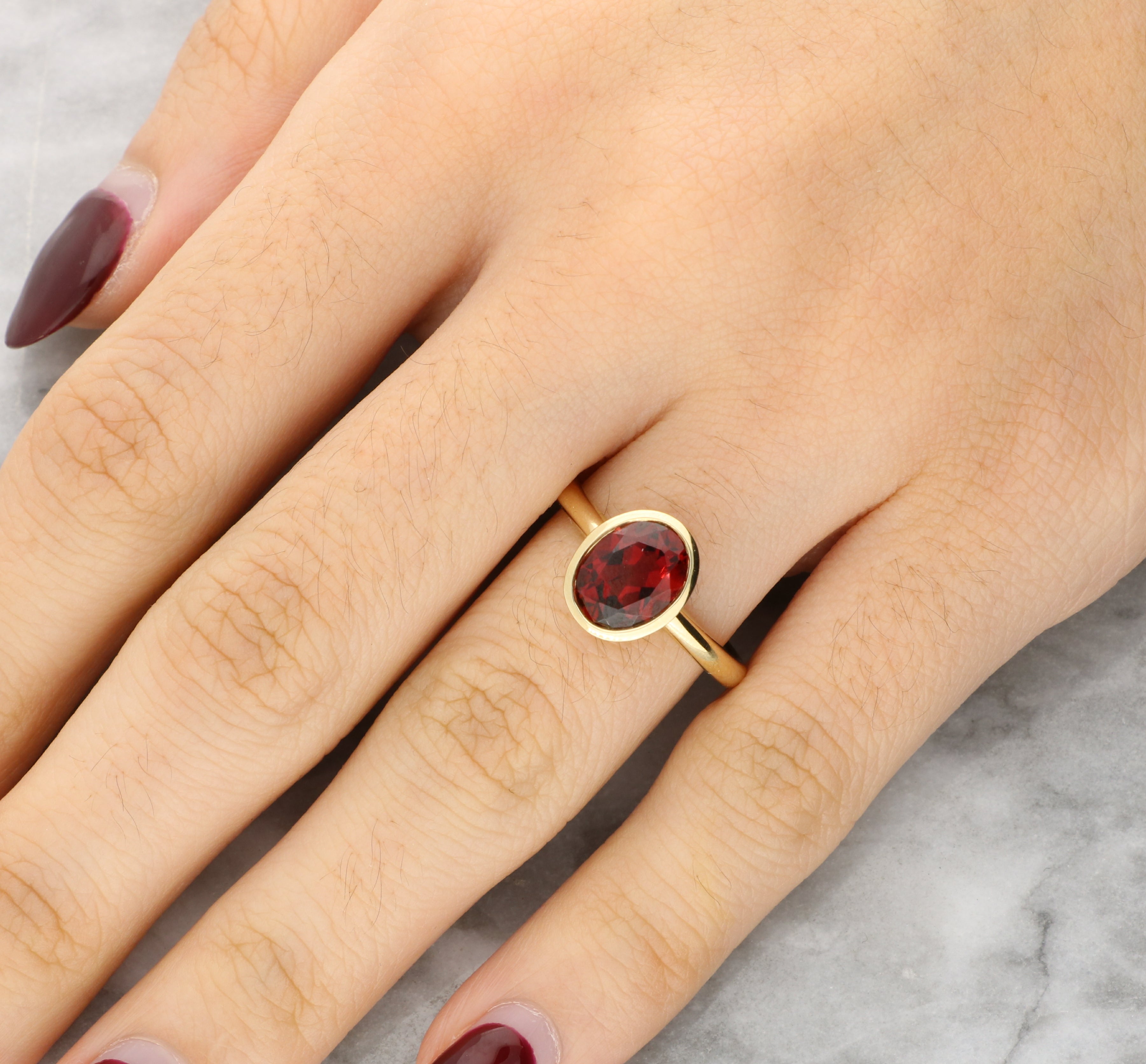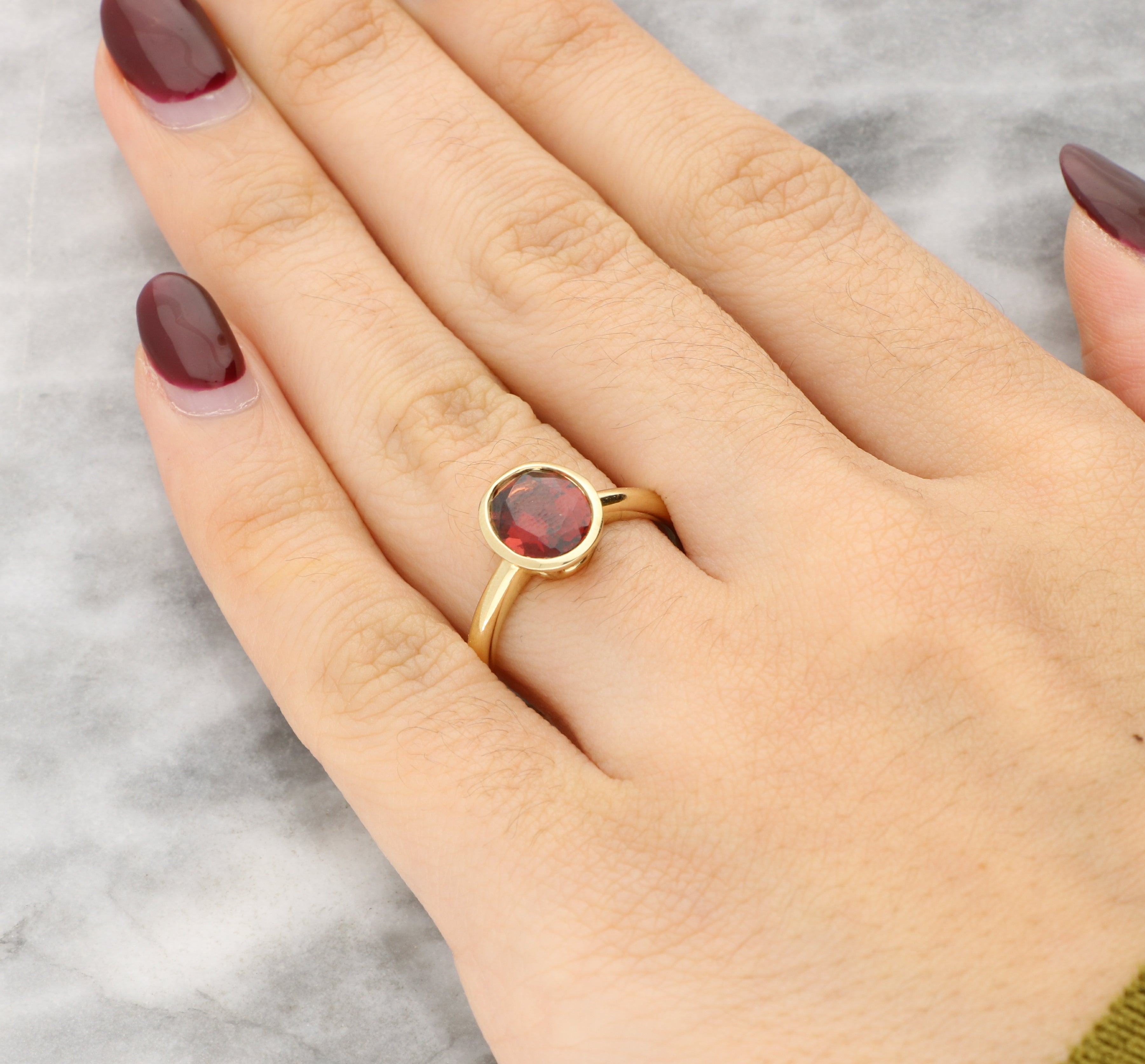 This lovely ring is centred on an oval-cut garnet, bezel-set to showcase its striking red hue. The smooth gold surround enhances the natural colour of the stone while providing a contemporary finish.