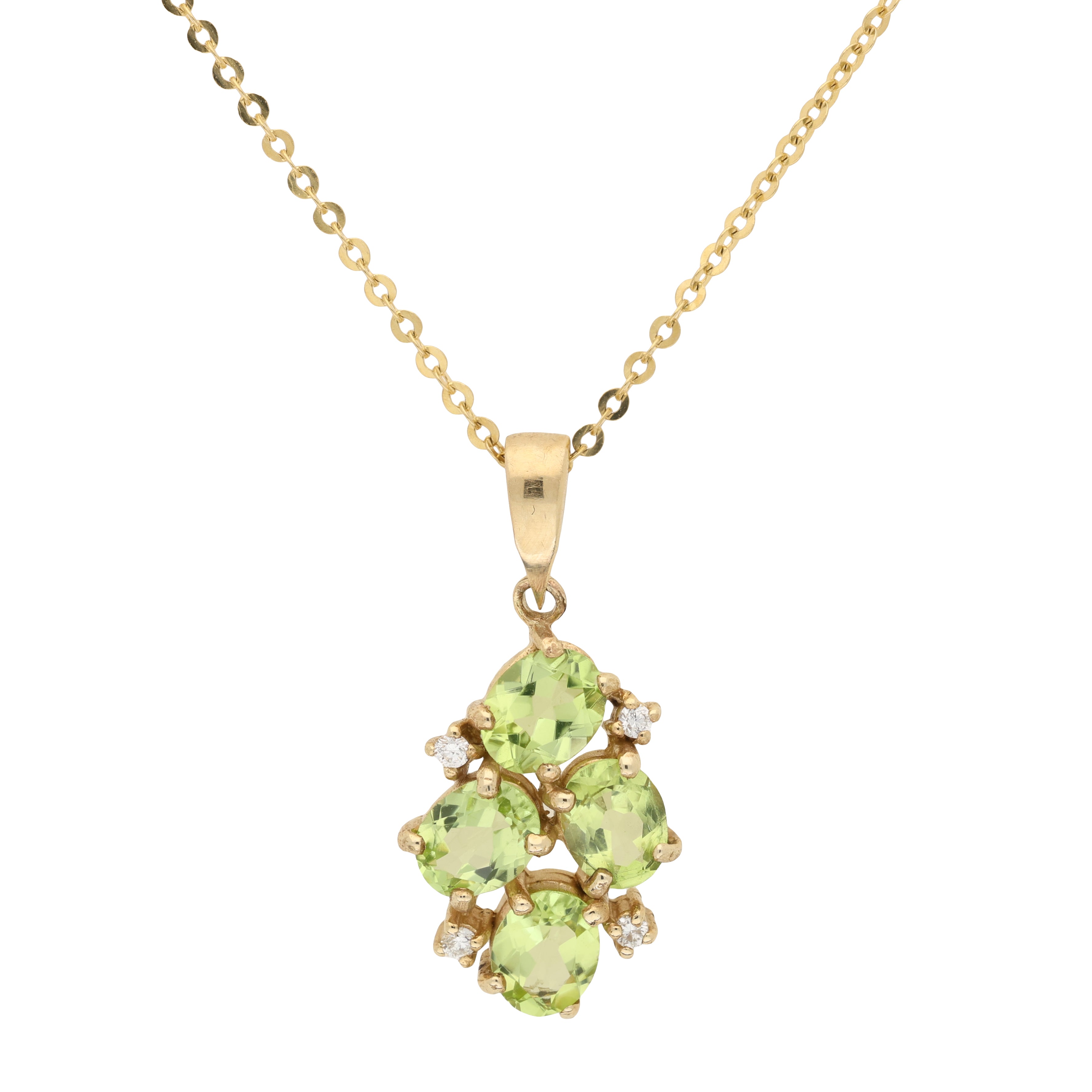 This peridot and diamond necklace features four vibrant green oval cut peridot held securely in a four claw settings. They are arranged in cluster formation. Between the peridots sit four round brilliant cut diamonds, adding some extra sparkle. The pendant is suspended from a polished gold bail allowing for gentle movement when worn.