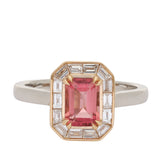 This ring features a rectangular emerald-cut pink tourmaline at its centre, secured by yellow gold claws that highlight the stone’s vivid rose-pink colour and step-cut facets. Surrounding the tourmaline is a geometric border of baguette-cut diamonds arranged in an octagonal frame.