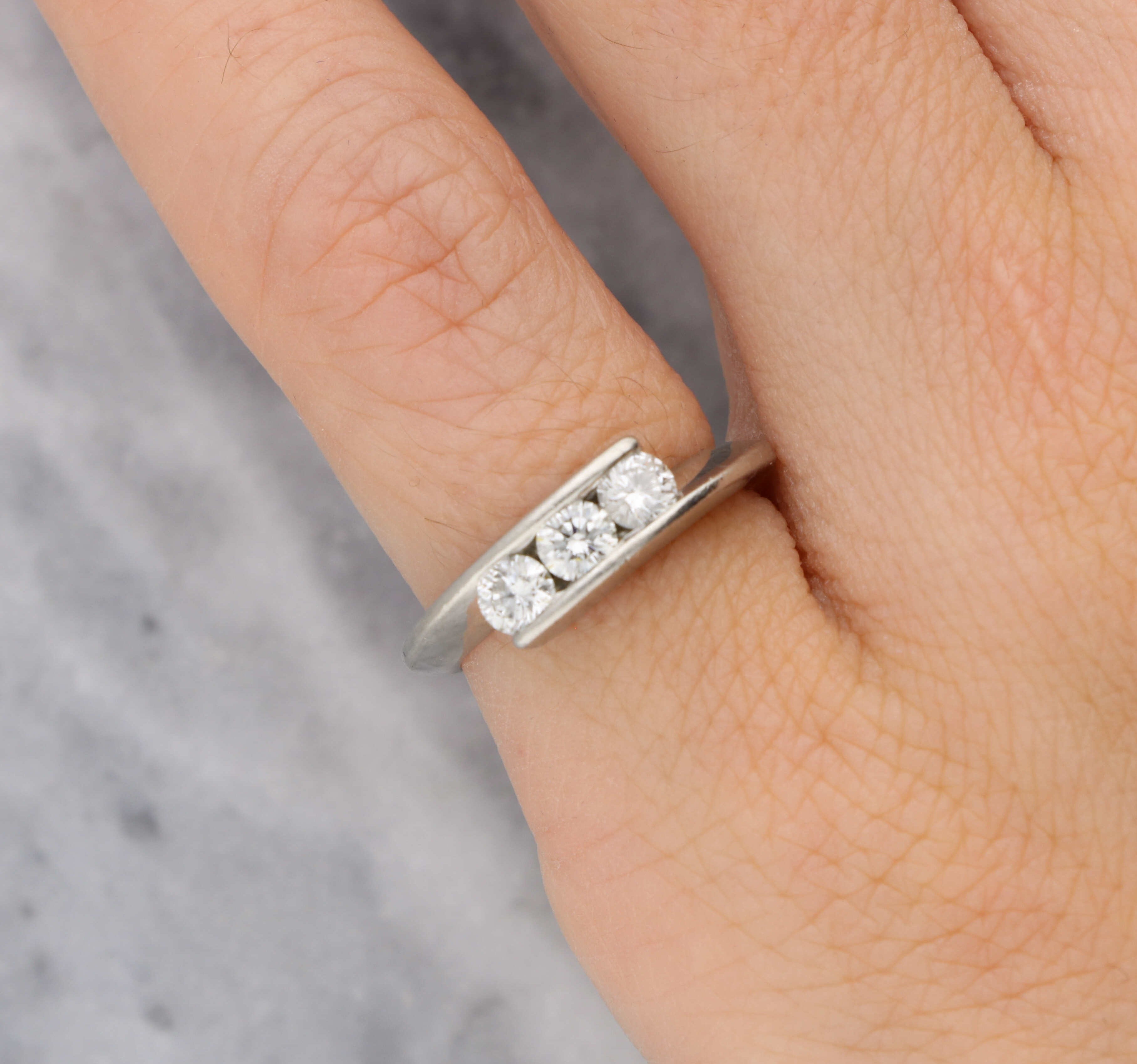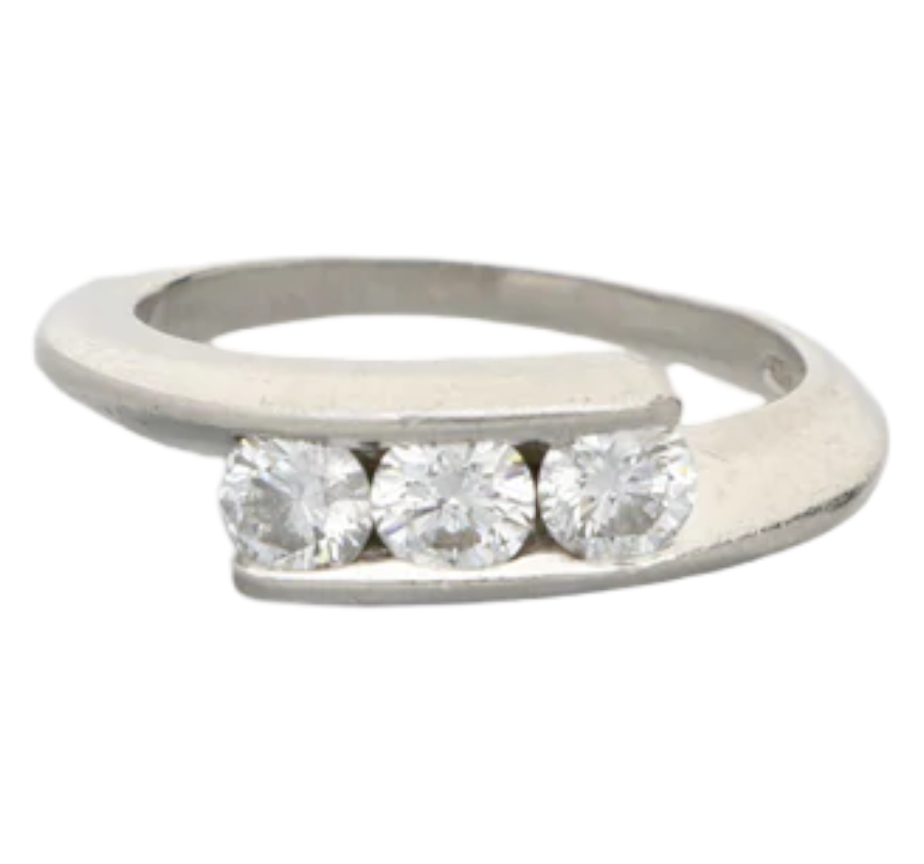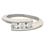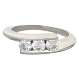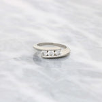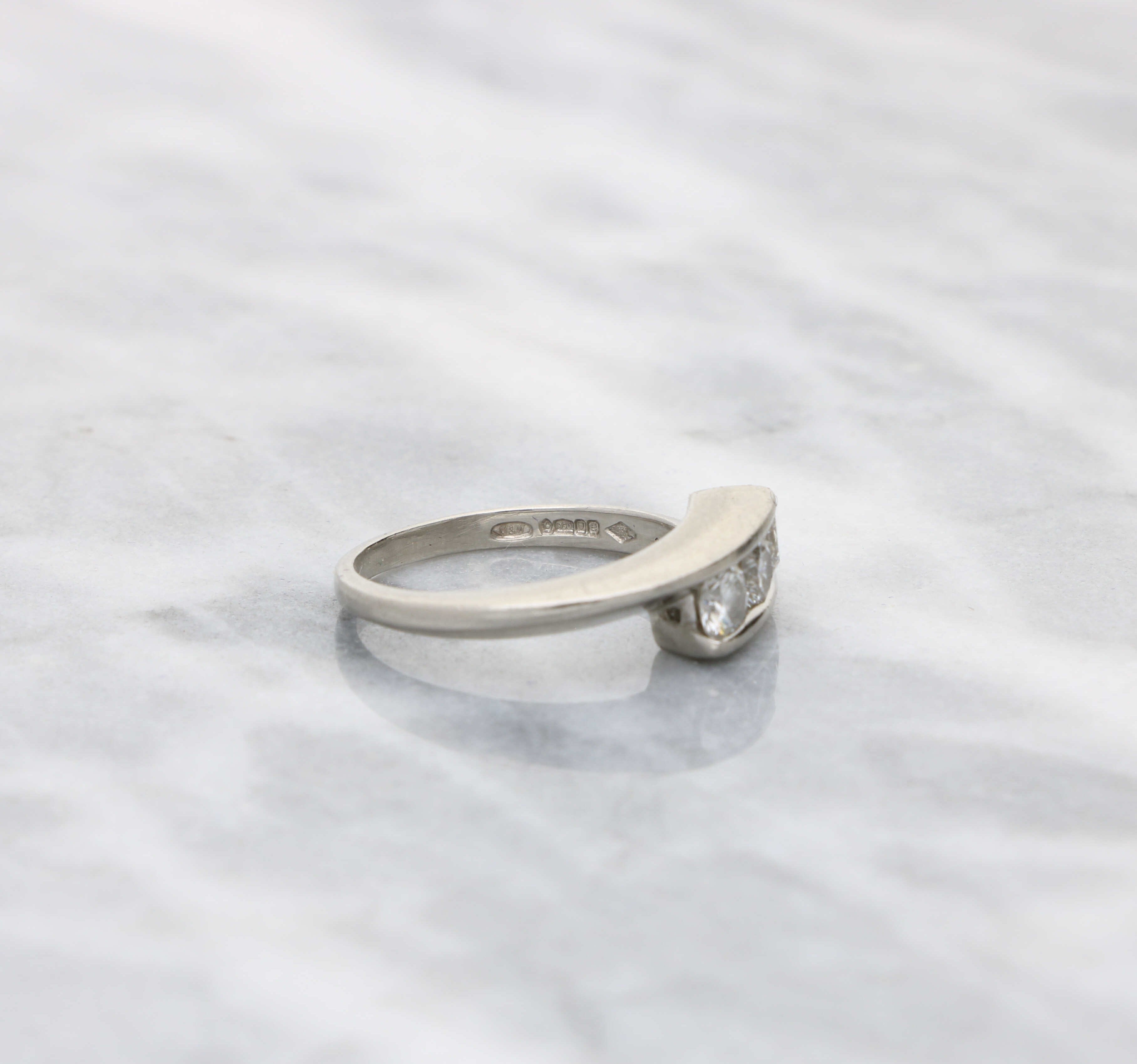 A sweet 3-stone diamond crossover ring set in platinum, hallmarked London.