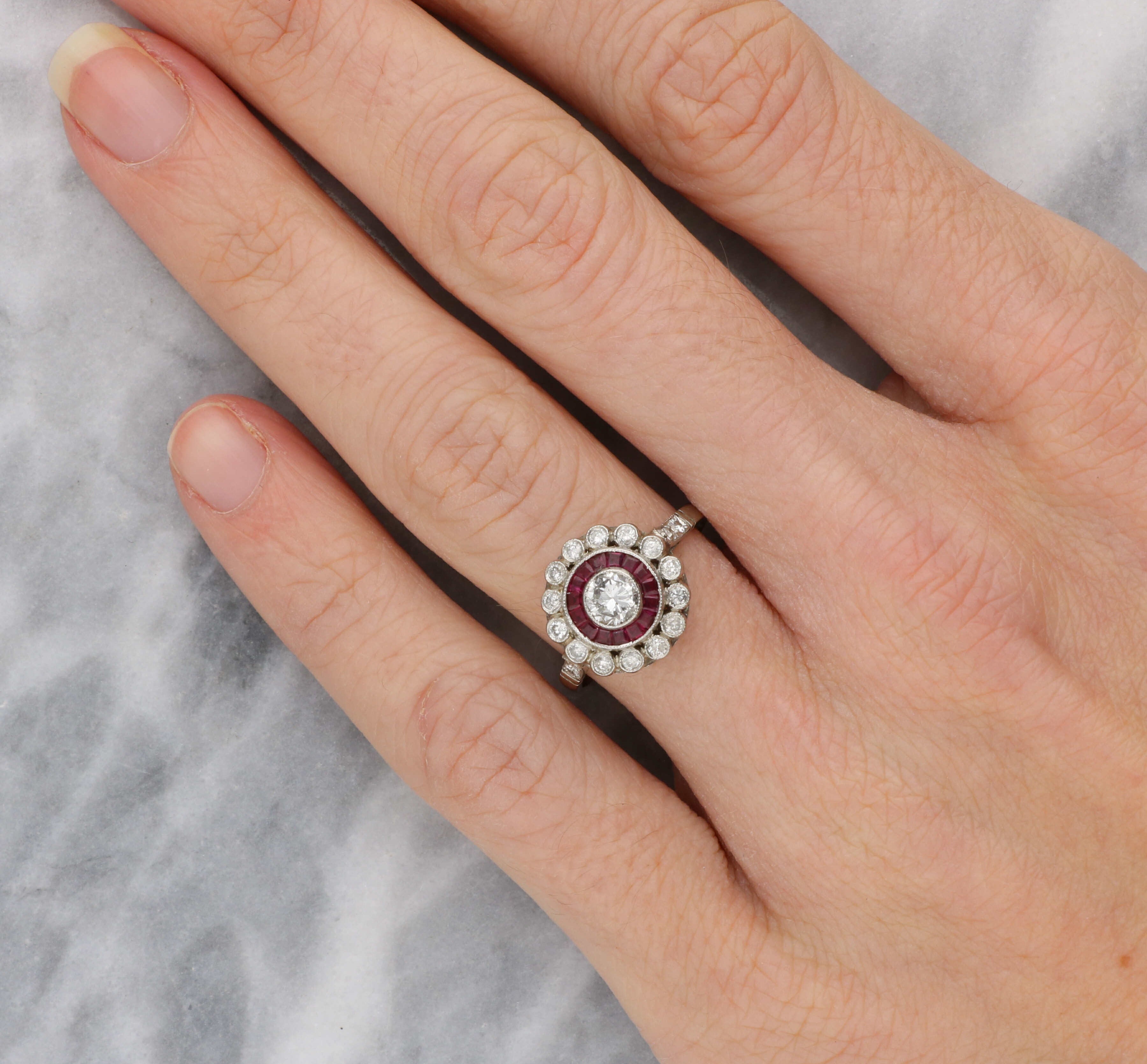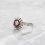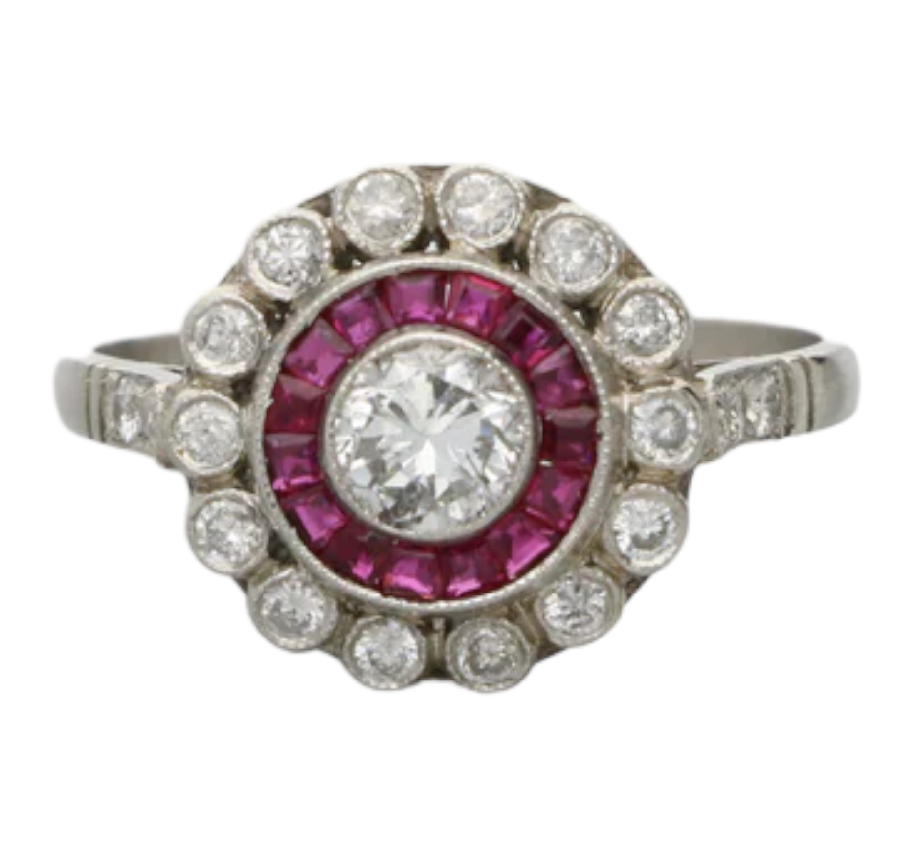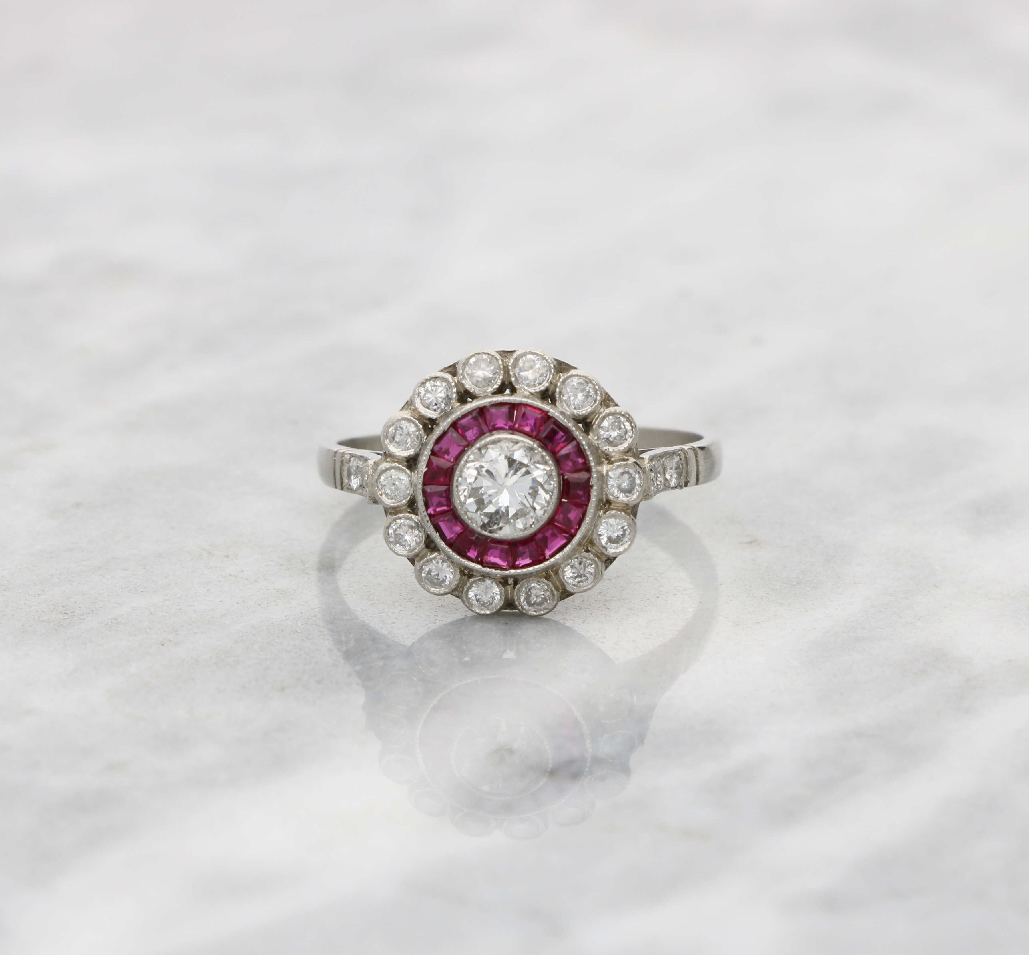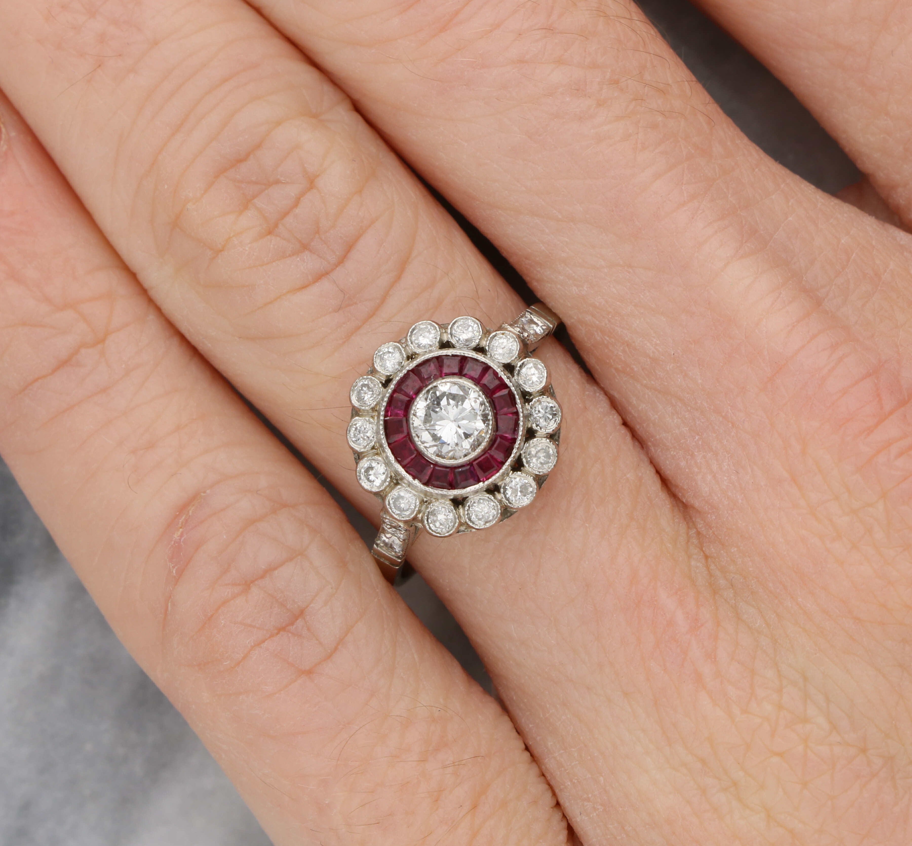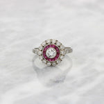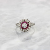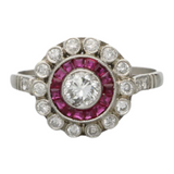 A stunning diamond and ruby Art Deco style target ring.