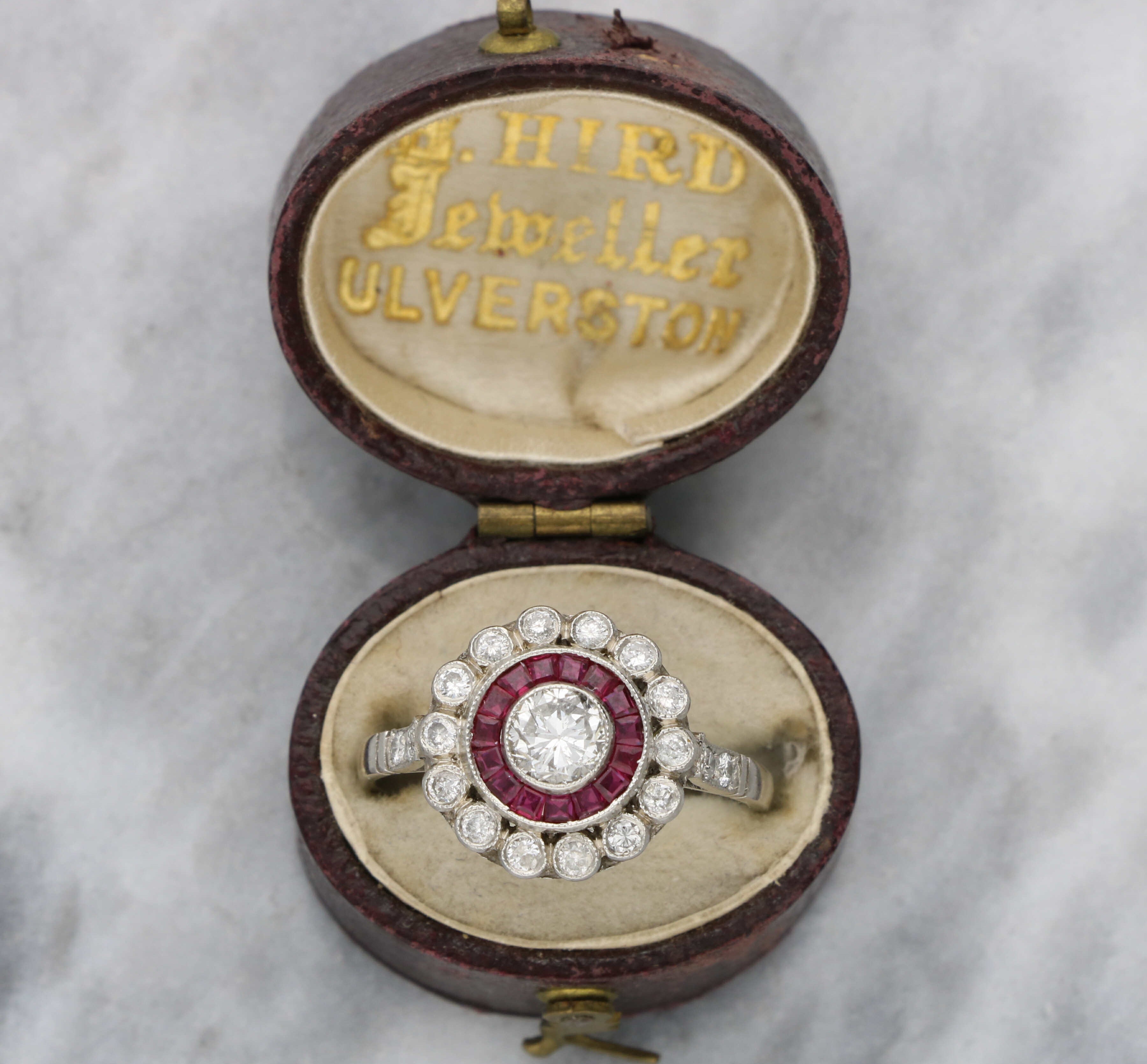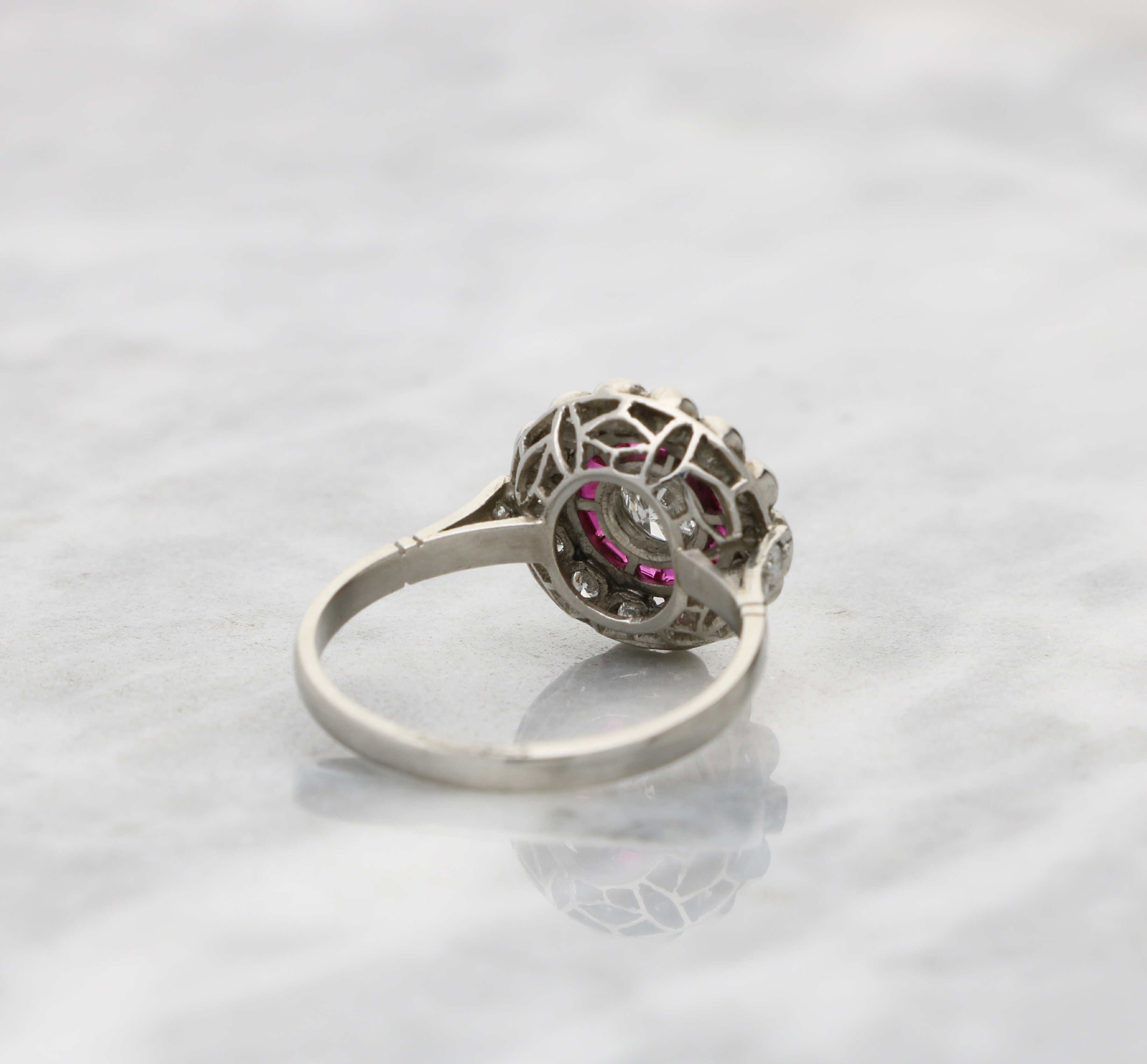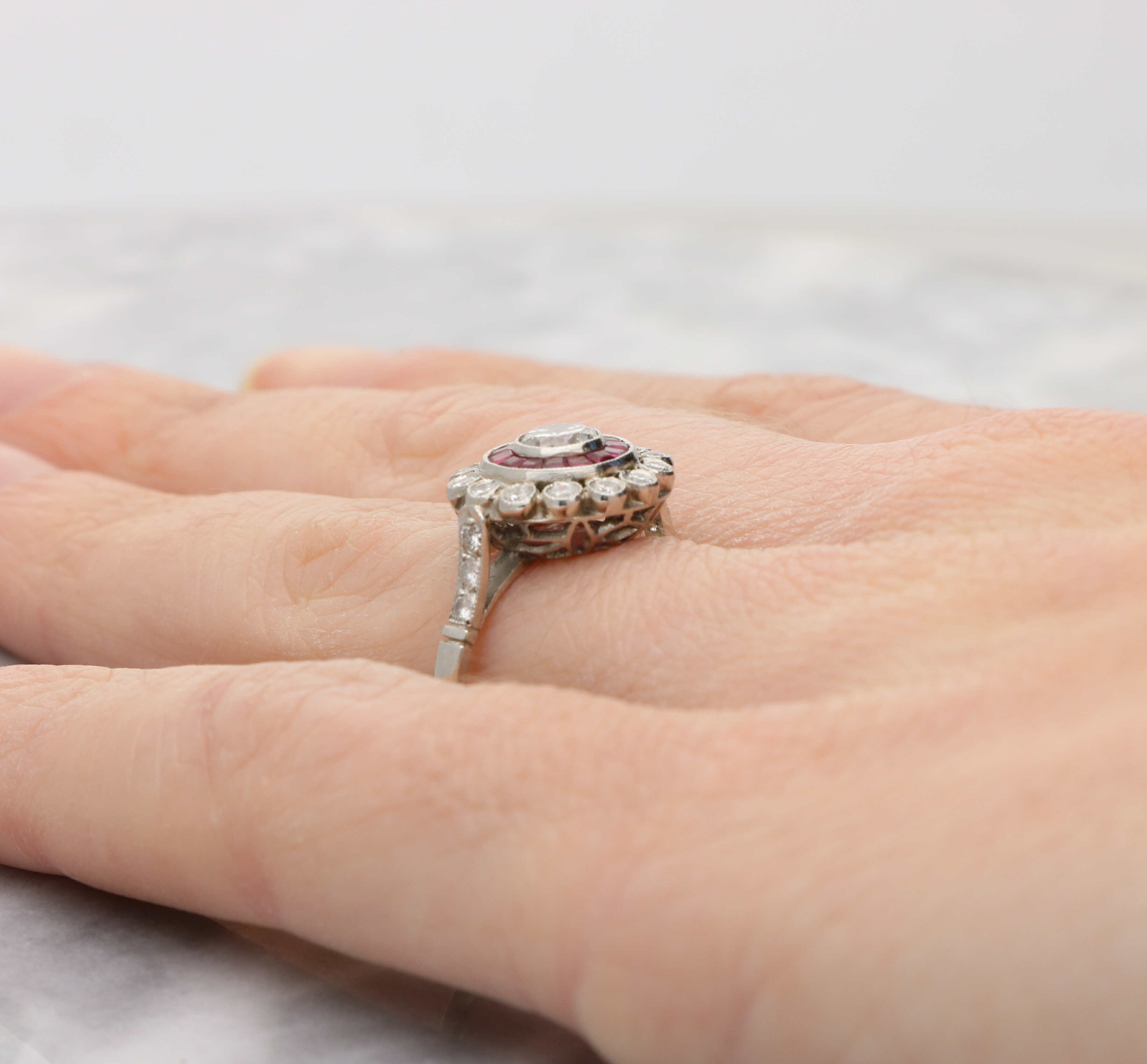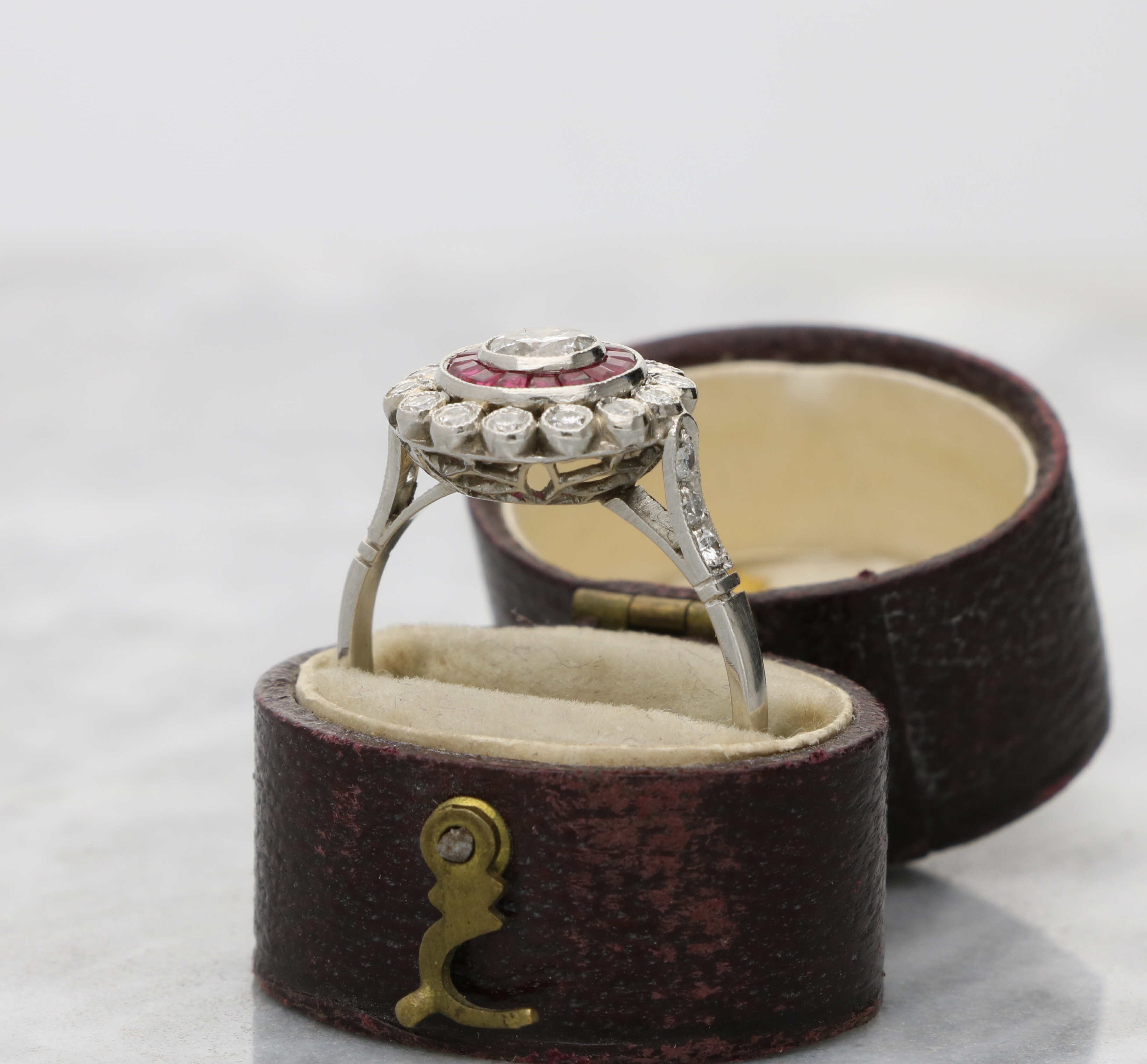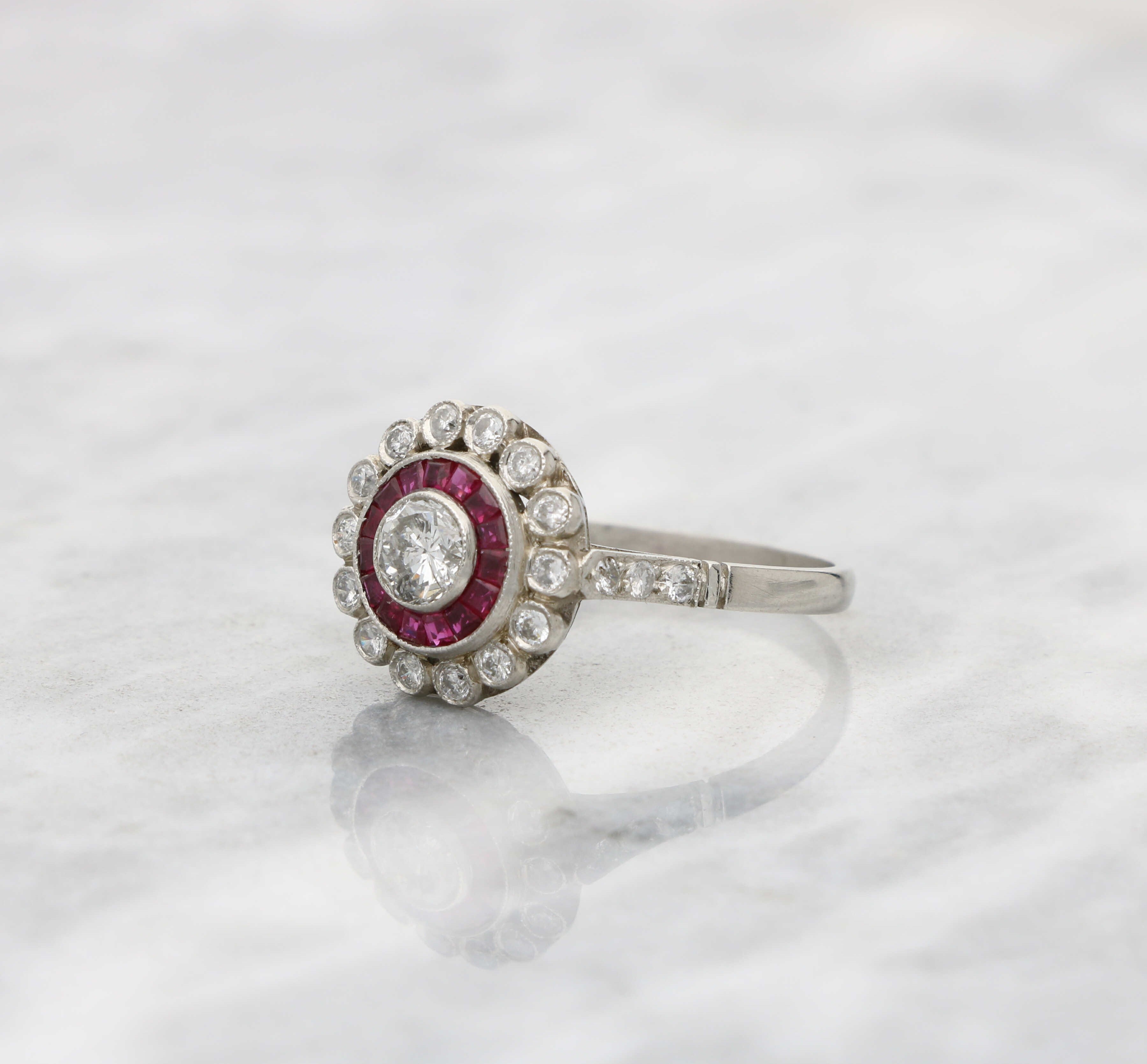 A stunning diamond and ruby Art Deco style target ring.
