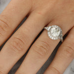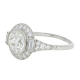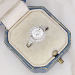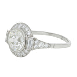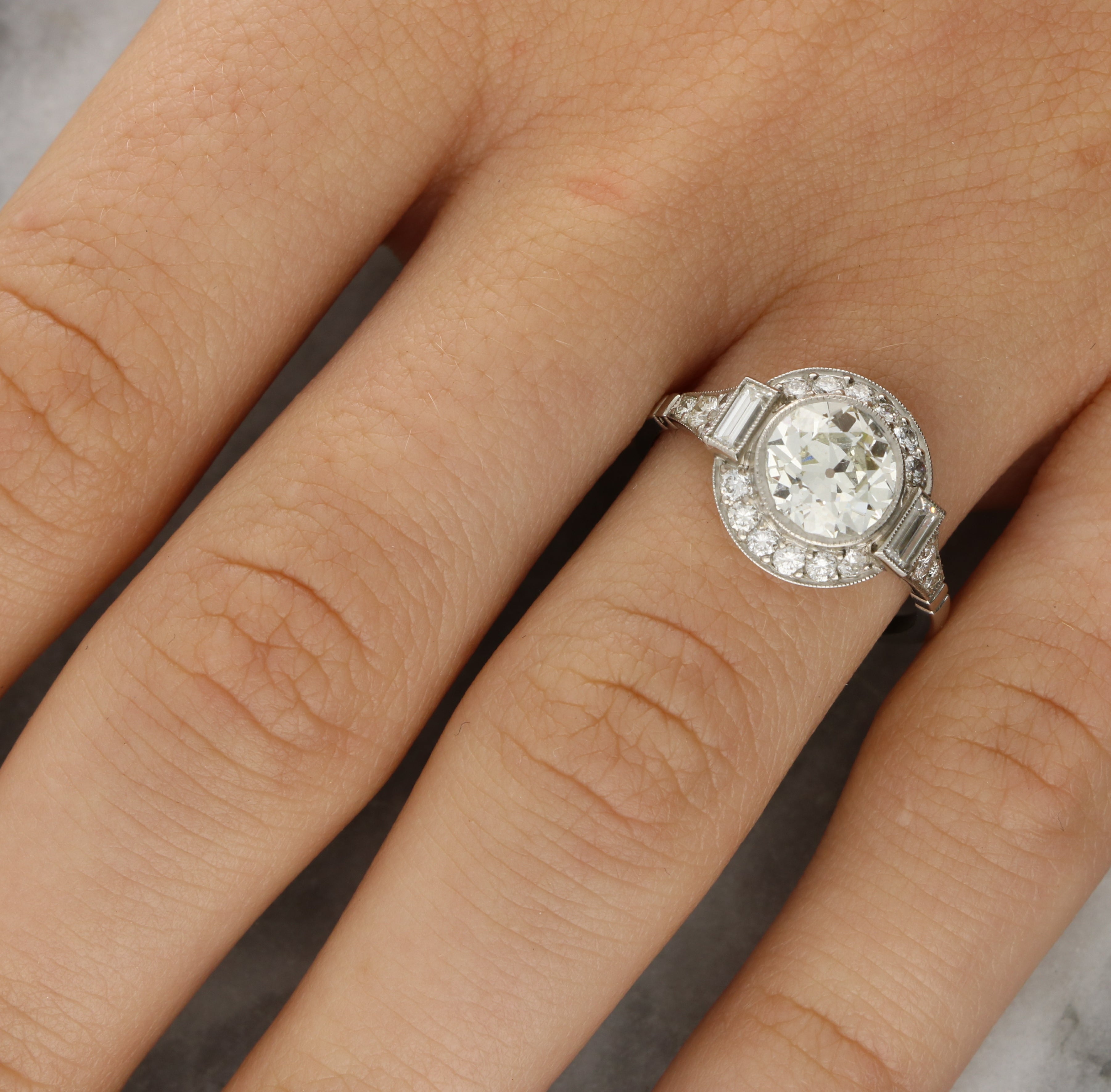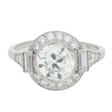 This stunning platinum ring showcases a breathtaking old European-cut diamond at its centre, encircled by a halo of round diamonds. Two elegant baguette-cut diamonds flank the centrepiece, adding a touch of Art Deco sophistication.