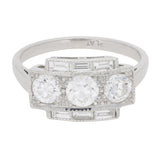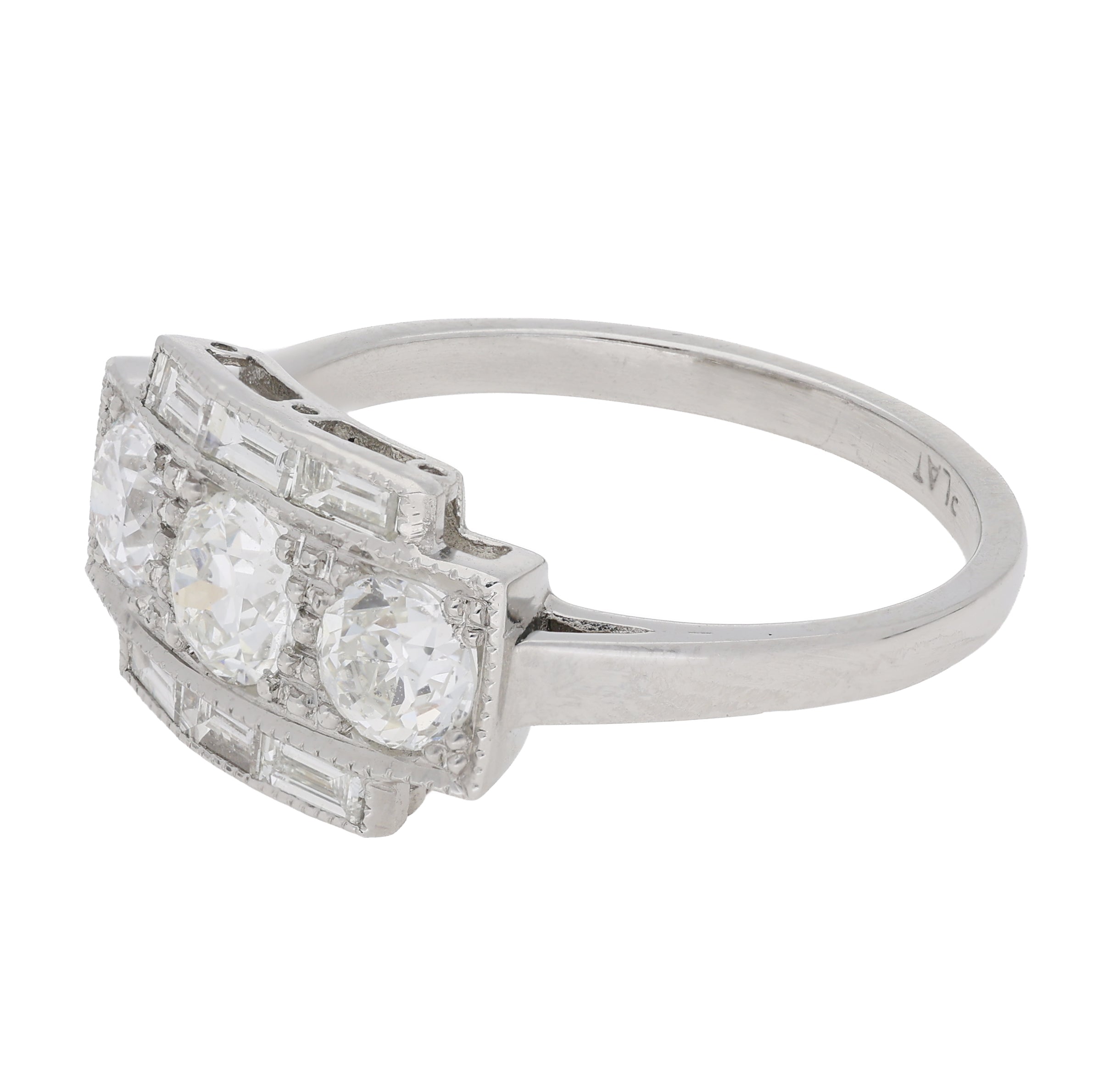 A vintage old cut diamond three stone ring with baguette cut diamond accents, set in platinum.